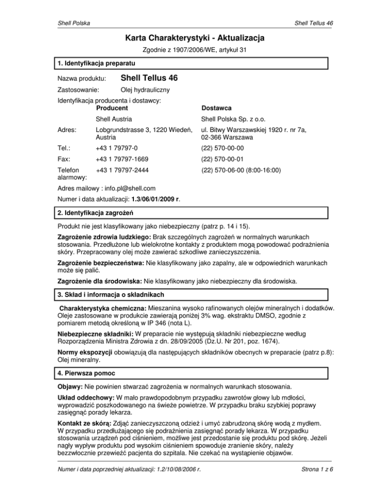 Shell Polska Shell Tellus 46 Karta Charakterystyki - Aktualizacja Zgodnie z 1907/2006/WE, artykuł 31 1. Identyfikacja preparatu Nazwa produktu: Shell Tellus 46 Zastosowanie: Olej hydrauliczny Identyfikacja producenta i dostawcy: Producent Dostawca Shell Austria Shell Polska Sp. z o.o. Adres: Lobgrundstrasse 3, 1220 Wiedeń, Austria ul. Bitwy Warszawskiej 1920 r. nr 7a, 02-366 Warszawa Tel.: +43 1 79797-0 (22) 570-00-00 Fax: +43 1 79797-1669 (22) 570-00-01 Telefon alarmowy: +43 1 79797-2444 (22) 570-06-00 (8:00-16:00) Adres mailowy : [email protected] Numer i data aktualizacji: 1.3/06/01/2009 r. 2. Identyfikacja zagrożeń Produkt nie jest klasyfikowany jako niebezpieczny (patrz p. 14 i 15). Zagrożenie zdrowia ludzkiego: Brak szczególnych zagrożeń w normalnych warunkach stosowania. Przedłużone lub wielokrotne kontakty z produktem mogą powodować podrażnienia skóry. Przepracowany olej może zawierać szkodliwe zanieczyszczenia. Zagrożenie bezpieczeństwa: Nie klasyfikowany jako zapalny, ale w odpowiednich warunkach może się palić. Zagrożenie dla środowiska: Nie klasyfikowany jako niebezpieczny dla środowiska. 3. Skład i informacja o składnikach Charakterystyka chemiczna: Mieszanina wysoko rafinowanych olejów mineralnych i dodatków. Oleje zastosowane w produkcie zawierają poniżej 3% wag. ekstraktu DMSO, zgodnie z pomiarem metodą określoną w IP 346 (nota L). Niebezpieczne składniki: W preparacie nie występują składniki niebezpieczne według Rozporządzenia Ministra Zdrowia z dn. 28/09/2005 (Dz.U. Nr 201, poz. 1674). Normy ekspozycji obowiązują dla następujących składników obecnych w preparacie (patrz p.8): Olej mineralny. 4. Pierwsza pomoc Objawy: Nie powinien stwarzać zagrożenia w normalnych warunkach stosowania. Układ oddechowy: W mało prawdopodobnym przypadku zawrotów głowy lub mdłości, wyprowadzić poszkodowanego na świeże powietrze. W przypadku braku szybkiej poprawy zasięgnąć porady lekarza. Kontakt ze skórą: Zdjąć zanieczyszczoną odzież i umyć zabrudzoną skórę wodą z mydłem. W przypadku przedłużającego się podrażnienia zasięgnąć porady lekarza. W przypadku stosowania urządzeń pod ciśnieniem, możliwe jest przedostanie się produktu pod skórę. Jeżeli nagły wypływ produktu pod wysokim ciśnieniem spowoduje zranienie skóry, należy bezzwłocznie przewieźć pacjenta do szpitala. Nie czekać na wystąpienie objawów. Numer i data poprzedniej aktualizacji: 1.2/10/08/2006 r. Strona 1 z 6 Shell Polska Shell Tellus 46 Kontakt z oczami: Natychmiast przemywać oczy dużą ilością wody. W przypadku przedłużającego się podrażnienia zasięgnąć porady lekarza. Spożycie: Wymyć usta wodą i zapewnić pomoc lekarską. Nie wywoływać wymiotów. Porady dla lekarza: Leczyć objawowo. Zachłyśnięcie się produktem do płuc w następstwie wymiotów może prowadzić do zapalenia płuc pochodzenia chemicznego. Przedłużone lub powtarzające się kontakty z produktem mogą powodować podrażnienie skóry. Zranienia pod ciśnieniem wymagają szybkiej interwencji chirurgicznej i przypuszczalnie terapii sterydowej w celu zminimalizowania zniszczenia tkanek i utraty ich funkcji. 5. Postępowanie w przypadku pożaru Specyficzne zagrożenia: W procesie spalania preparatu może powstawać skomplikowana mieszanina lotnych cząsteczek stałych i ciekłych oraz gazów, zawierająca tlenek węgla, tlenki siarki oraz niezidentyfikowane związki organiczne i nieorganiczne. Zalecane środki gaśnicze: Piana lub suche proszki chemiczne. Dwutlenek węgla (gaśnica śniegowa), piasek lub ziemia mogą być używane tylko do gaszenia małych pożarów. Nieodpowiednie środki gaśnicze: Silny strumień wody. Unikać stosowania halonów, aby nie skażać środowiska. Środki ochrony indywidualnej dla strażaków: W przypadku pożaru w zamkniętym pomieszczeniu należy stosować odzież ochronną i aparat oddechowy na sprężone powietrze. 6. Postępowanie w przypadku niezamierzonego uwolnienia do środowiska Indywidualne środki ostrożności: Unikać kontaktu ze skórą i oczami. Stosować rękawice ochronne z polichlorku winylu, neoprenu lub kauczuku nitrylowego, kauczukowe buty do kolan oraz ubranie ochronne z polichlorku winylu. Stosować okulary ochronne lub maskę zabezpieczającą twarz w przypadku możliwości rozchlapywania produktu. Ochrona środowiska: Zapobiegać rozprzestrzenianiu się oraz przenikaniu do kanalizacji, rowów i rzek przez tworzenie barier z piasku, ziemi lub innych nadających się do tego materiałów. Poinformować lokalne władze w przypadku niemożności zapewnienia ochrony. Metody oczyszczania małych zanieczyszczeń: Zaabsorbować ciecz przy pomocy ziemi lub piasku. Zebrać zanieczyszczony materiał do odpowiednio oznaczonych pojemników w celu utylizacji zgodnie z obowiązującymi przepisami. Metody oczyszczania dużych zanieczyszczeń: Nie dopuścić do rozprzestrzenienia poprzez budowę obwałowań z piasku, ziemi lub innych nadających się do tego materiałów. Zebrać ciecz bezpośrednio lub na adsorbencie. Utylizować jak w przypadku małych zanieczyszczeń. 7. Postępowanie z preparatem i magazynowanie Postępowanie z preparatem: Stosować lokalne systemy wentylacji wyciągowej w przypadku ryzyka wdychania par, mgieł lub aerozoli olejowych. Unikać przedłużonego lub powtarzającego się kontaktu ze skórą. Do przewożenia produktów w beczkach należy stosować odpowiedni sprzęt oraz obuwie zabezpieczające stopy przed ewentualnym przygnieceniem w razie upadku beczki. Unikać rozlewania. Szmaty nasycone produktem, papier lub materiały używane do zbierania zanieczyszczeń stwarzają zagrożenie pożarowe. Unikać przechowywania wspomnianych materiałów. Wyrzucić je natychmiast po wykorzystaniu. Dodatkowo do wszystkich specyficznych rekomendacji kontrolowania zagrożeń dla zdrowia, bezpieczeństwa i środowiska należy przeprowadzić ocenę ryzyka na stanowisku pracy w celu ustalenia śro