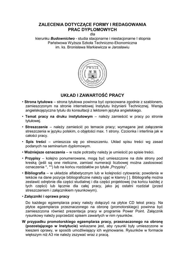 ZALECENIA DOTYCZĄCE FORMY I REDAGOWANIA PRAC DYPLOMOWYCH dla kierunku Budownictwo - studia stacjonarne i niestacjonarne I stopnia Państwowa Wyższa Szkoła Techniczno-Ekonomiczna im. ks. Bronisława Markiewicza w Jarosławiu UKŁAD I ZAWARTOŚĆ PRACY • Strona tytułowa – strona tytułowa powinna być opracowana zgodnie z szablonem, zamieszczonym na stronie internetowej Instytutu Inżynierii Technicznej. Wersja angielskojęzyczna tytułu do konsultacji z lektorem języka angielskiego. • Temat pracy na druku instytutowym – należy zamieścić w pracy po stronie tytułowej. • Streszczenie – należy zamieścić po temacie pracy; wymagane jest załączenie streszczenia w języku polskim, o objętości max. 1 strony. Czcionka i interlinia jak w całości pracy. • Spis treści – umieszcza się po streszczeniu. Układ spisu treści wg zasad podanych na seminarium dyplomowym. • Ważniejsze oznaczenia – w razie potrzeby należy je umieścić po spisie treści. • Przypisy – kolejno ponumerowane, mogą być umieszczone na dole strony pod kreską (jeśli są one nieliczne, zamiast numeracji liczbowej można zastosować oznaczenia *, **) lub na końcu rozdziałów po tytule „Przypisy”. • Bibliografia – w układzie alfabetycznym lub w kolejności cytowania; powołania w tekście na dane pozycje bibliograficzne należy ująć w klamry [ ]. Bibliografię można zestawić odrębnie dla części studialnej i dla części projektowej (na końcu każdej z tych części) lub łącznie dla całej pracy, jako jej ostatni rozdział (przed streszczeniem i załącznikiem rysunkowym). • Załączniki i oprawa pracy Do każdego egzemplarza pracy należy dołączyć na płytce CD tekst pracy. Na płytce egzemplarza przeznaczonego na obronę (promotorskiego) powinna być zamieszczona również prezentacja pracy w programie Power Point. Załącznik rysunkowy należy poprzedzić spisem zawartych w nim rysunków. W przypadku promotorskiego egzemplarza pracy, przeznaczonego na obronę (pozostającego w Instytucie) wskazane jest, aby rysunki były umieszczone w kieszeni oprawy, w sposób umożliwiający ich wyjmowanie. Rysunków w formacie większym niż A3 nie należy zszywać wraz z pracą. Egzemplarz pracy przeznaczony do złożenia w Dziekanacie powinien mieć oprawę miękką,(klejoną) nie należy go bindować. Zszywana powinna być całość pracy wraz z rysunkami. WYGLĄD STRONY: • Marginesy Margines górny 2,5 cm (wskazane stosowanie nagłówka zawierającego tytuł rozdziału, ew. podrozdziału lub punktu pracy, wówczas wymiar marginesu górnego można odpowiednio powiększyć), margines dolny 2,5 cm, margines od krawędzi zszywanej 3,0 cm, w tym część na zszycie pracy, margines od krawędzi zewnętrznej 2,0 cm • TYTUŁY ROZDZIAŁÓW (czcionka 14, odstęp przed i po 24 punkty) • Tytuły podrozdziałów (czcionka 12, odstęp przed i po 18 punktów) • Czcionka tekstu zasadniczego – 11 lub 12 pkt., jednolita w całej pracy. W razie stosowania zapisów z indeksami należy dobrać właściwy krój czcionki z uwagi na czytelność indeksów. Tekst zasadniczy należy pisać z wcięciem akapitowym 1 cm. Można stosować wyróżnienia tekstu: pogrubienie, kursywa, kursywa pogrubiona, nie powinno się stosować podkreśleń. • Interlinia - max. 1,5 wiersza (lub 1,0 do ustalenia z promotorem). • Tabele Tytuł, numerację oraz tekst w tabelach zaleca się pisać czcionką 10-punktową. Tytuł umieszczony nad tabelą należy wyrównać do lewego marginesu oraz wyśrodkować w pionie (odstęp przed i po 6 punktów). Zaleca się stosować dwustopniową numerację tablic, pierwsza cyfra (liczba) to nr rozdziału pracy, druga – nr tablicy w ramach rozdziału. • Rysunki Tytuł, numerację oraz podpis pod rysunkiem należy pisać czcionką 10-punktową. Tytuł umieszczony pod rysunkiem należy wyrównać do lewego marginesu oraz wyśrodkować w pionie (odstęp przed i po 6 punktów). Zaleca się stosować dwustopniową numerację rysunków, pierwsza cyfra (liczba) to nr rozdziału, druga – nr rysunku w ramach rozdziału (przykład 3.). • Należy pamiętać o powołaniu się na materiały źródłowe i literaturę [xx] – bibliografię • Numeracja stron Numery stron powinny być umieszczone na dole strony. Numery stron mają wielkość czcionki tekstu zasadniczego. • Wydruk pracy dwustronny PRZYKŁADY: Przykłady zostaną omówione na seminarium dyplomowym