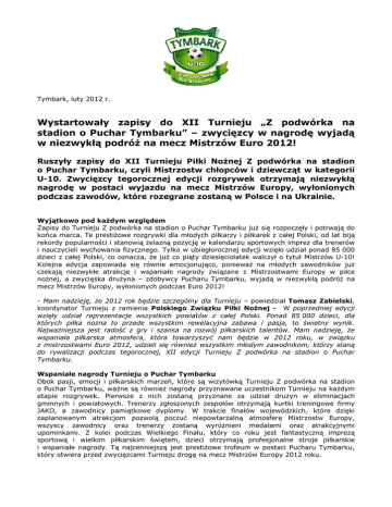 Tymbark, luty 2012 r. Wystartowały zapisy do XII Turnieju „Z podwórka na stadion o Puchar Tymbarku” – zwycięzcy w nagrodę wyjadą w niezwykłą podróŜ na mecz Mistrzów Euro 2012! Ruszyły zapisy do XII Turnieju Piłki NoŜnej Z podwórka na stadion o Puchar Tymbarku, czyli Mistrzostw chłopców i dziewcząt w kategorii U-10. Zwycięzcy tegorocznej edycji rozgrywek otrzymają niezwykłą nagrodę w postaci wyjazdu na mecz Mistrzów Europy, wyłonionych podczas zawodów, które rozegrane zostaną w Polsce i na Ukrainie. Wyjątkowo pod kaŜdym względem Zapisy do Turnieju Z podwórka na stadion o Puchar Tymbarku juŜ się rozpoczęły i potrwają do końca marca. Te prestiŜowe rozgrywki dla młodych piłkarzy i piłkarek z całej Polski, od lat biją rekordy popularności i stanowią Ŝelazną pozycję w kalendarzu sportowych imprez dla trenerów i nauczycieli wychowania fizycznego. Tylko w ubiegłorocznej edycji wzięło udział ponad 85 000 dzieci z całej Polski, co oznacza, Ŝe juŜ co piąty dziesięciolatek walczył o tytuł Mistrzów U-10! Kolejna edycja zapowiada się równie emocjonująco, poniewaŜ na młodych zawodników juŜ czekają niezwykłe atrakcje i wspaniałe nagrody związane z Mistrzostwami Europy w piłce noŜnej, a zwycięska druŜyna – zdobywcy Pucharu Tymbarku, wyjadą w niezwykłą podróŜ na mecz Mistrzów Europy, wyłonionych podczas Euro 2012! - Mam nadzieję, Ŝe 2012 rok będzie szczególny dla Turnieju – powiedział Tomasz Zabielski, koordynator Turnieju z ramienia Polskiego Związku Piłki NoŜnej - W poprzedniej edycji wzięły udział reprezentacje wszystkich powiatów z całej Polski. Ponad 85 000 dzieci, dla których piłka noŜna to przede wszystkim rewelacyjna zabawa i pasja, to świetny wynik. NajwaŜniejsza jest radość z gry i szansa na rozwój piłkarskich talentów. Mam nadzieję, Ŝe wspaniała piłkarska atmosfera, która towarzyszyć nam będzie w 2012 roku, w związku z mistrzostwami Euro 2012, udzieli się równieŜ wszystkim młodym zawodnikom, którzy staną do rywalizacji podczas tegorocznej, XII edycji Turnieju Z podwórka na stadion o Puchar Tymbarku. Wspaniałe nagrody Turnieju o Puchar Tymbarku Obok pasji, emocji i piłkarskich marzeń, które są wizytówką Turnieju Z podwórka na stadion o Puchar Tymbarku, waŜne są równieŜ nagrody przyznawane uczestnikom Turnieju na kaŜdym etapie rozgrywek. Pierwsze z nich zostaną przyznane za udział druŜyn w eliminacjach gminnych i powiatowych. Trenerzy zgłoszonych zespołów otrzymają kurtki treningowe firmy JAKO, a zawodnicy pamiątkowe dyplomy. W trakcie finałów wojewódzkich, które dzięki zaplanowanym atrakcjom pozwolą poczuć niepowtarzalną atmosferę Mistrzostw Europy, wszyscy zawodnicy oraz trenerzy zostaną wyróŜnieni medalami oraz atrakcyjnymi upominkami. Z kolei podczas Wielkiego Finału, który co roku jest fantastyczną imprezą sportową i wielkim piłkarskim świętem, dzieci otrzymają profesjonalne stroje piłkarskie i wspaniałe nagrody. Tą najcenniejszą jest prestiŜowe trofeum w postaci Pucharu Tymbarku, który otwiera przed zwycięzcami Turnieju drogę na mecz Mistrzów Europy 2012 roku. Mistrzowie i Mistrzynie w kategorii U-10, którzy w poprzednich edycjach zdobywali prestiŜowy i wymarzony Puchar Tymbarku, mieli juŜ dotąd okazję podziwiać w akcji gwiazdy FC Barcelony, dopingować reprezentację narodową Anglii na stadionie Wembley oraz obserwować piłkarskie popisy zawodników Realu Madryt, AC Milanu i Ajaksu Amsterdam. Tym razem nagroda główna, pozwoli młodym piłkarzom i piłkarkom jeszcze bardziej poczuć wyjątkową atmosferę piłkarskiego święta w Polsce i na Ukrainie, poniewaŜ dopiero 1 lipca, w dniu meczu finałowego, dowiedzą się, na mecz której reprezentacji Euro 2012 wybiorą się zdobywcy Pucharu Tymbarku. Zawsze kiedy próbuję spojrzeć na Turniej Z podwórka na stadion o Puchar Tymbarku oczyma dziecka, widzę emocjonujące rozgrywki, w których spełniają się małe i duŜe marzenia – powiedział Dariusz Czech, prezes firmy Tymbark. - Bardzo chcielibyśmy, aby w tym roku były one jeszcze bardziej wyjątkowe niŜ zwykle, stąd specjalna nagroda główna – wyjazd na mecz Mistrzów Europy 2012 roku oraz gigantyczne emocje i niepowtarzalne imprezy towarzyszące wszystkim 16 finałom wojewódzkim w całej Polsce, które jeszcze przez jakiś czas, pozostaną wielką niespodzianką. JeŜeli chodzi o moje marzenia związane z XII edycją, to mam jedno,…jeszcze więcej niŜ przed rokiem uśmiechów małych piłkarzy i piłkarek, dla których futbol jest wielką pasją. Będzie to niezwykły rok, więc wierzę, Ŝe na pewno się uda. Firma Tymbark juŜ od 6 lat jest sponsorem tytularnym piłkarskich rozgrywek Turniej „Z podwórka na stadion o Puchar Tymbarku”, aktywnie włączając się w kampanie edukacyjne na rzecz promocji sportu i zdrowego trybu Ŝycia. Jak wziąć udział w Turnieju o Puchar Tymbarku? Zapisy do tegorocznej edycji Turnieju o Puchar Tymbarku juŜ się rozpoczęły. Trenerzy, nauczyciele oraz opiekunowie mogą zgłaszać dowolną liczbę druŜyn chłopców i dziewcząt w kategorii wiekowej do lat 10 (klasy I-III). Zespoły te mogą liczyć od 6 do maksymalnie 12 zawodników. Formularz zgłoszeniowy a takŜe szczegółowe informacje na temat zapisów i Turnieju, dostępne są na stronie www.zpodworkanastadion.pl Harmonogram rozgrywek Pierwsze mecze XII Turnieju Z podwórka na stadion o Puchar Tymbarku rozpoczną się juŜ w kwietniu na etapie gminnym i powiatowym. Następnie zwycięskie druŜyny zmierzą się w jednym z 16 finałów wojewódzkich, które rozpoczynają się 14 maja. Najlepsze zespoły z poszczególnych województw wezmą udział w półfinałach, podczas których rywalizować będą o awans do Wielkiego Finału. Jedną z najwaŜniejszych idei Turnieju o Puchar Tymbarku, jest wyłanianie piłkarskich talentów, dlatego począwszy od etapu rozgrywek gminnych, trenerzy zwyci