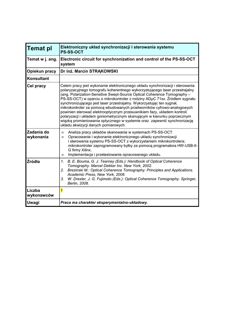 Temat pl Elektroniczny układ synchronizacji i sterowania systemu PS-SS-OCT Temat w j. ang. Electronic circuit for synchronization and control of the PS-SS-OCT system Opiekun pracy Dr inż. Marcin STRĄKOWSKI Konsultant Cel pracy Celem pracy jest wykonanie elektronicznego układu synchronizacji i sterowania polaryzacyjnego tomografu koherentnego wykorzystującego laser przestrajalny (ang. Polarization-Sensitive Swept-Source Optical Coherence Tomography – PS-SS-OCT) w oparciu o mikrokontroler z rodziny ADµC 71xx. Źródłem sygnału synchronizującego jest laser przestrajalny. Wykorzystując ten sygnał, mikrokontroler za pomocą wbudowanych przetworników cyfrowo-analogowych powinien sterować elektrooptycznym przesuwnikiem fazy, układem kontroli polaryzacji i układem goniometrycznym skanującym w kierunku poprzecznym wiązką promieniowania optycznego w systemie oraz zapewnić synchronizację układu akwizycji danych pomiarowych. Zadania do wykonania • • • Analiza pracy układów skanowania w systemach PS-SS-OCT. Opracowanie i wykonanie elektronicznego układu synchronizacji i sterowania systemu PS-SS-OCT z wykorzystaniem mikrokontrolera; mikrokontroler zaprogramowany byłby za pomocą programatora HW-USB-IIG firmy Xilinx. Implementacja i przetestowanie opracowanego układu. Źródła 1. B. E. Bouma, G. J. Tearney (Eds.): Handbook of Optical Coherence Tomography. Marcel Dekker Inc. New York, 2002. 2. Brezinski M.: Optical Coherence Tomography: Principles and Applications. Academic Press, New York, 2006. 3. W. Drexler, J. G. Fujimoto (Eds.): Optical Coherence Tomography. Springer, Berlin, 2008. Liczba wykonawców 1 Uwagi Praca ma charakter eksperymentalno-układowy.