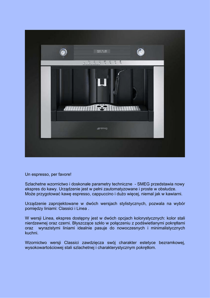 Un espresso, per favore! Szlachetne wzornictwo i doskonałe parametry techniczne - SMEG przedstawia nowy ekspres do kawy. Urządzenie jest w pełni zautomatyzowane i proste w obsłudze. Może przygotować kawę espresso, cappuccino i dużo więcej, niemal jak w kawiarni. Urządzenie zaprojektowane w dwóch wersjach stylistycznych, pozwala na wybór pomiędzy liniami: Classici i Linea . W wersji Linea, ekspres dostępny jest w dwóch opcjach kolorystycznych: kolor stali nierdzewnej oraz czerni. Błyszczące szkło w połączeniu z podświetlanymi pokrętłami oraz wyrazistymi liniami idealnie pasuje do nowoczesnych i minimalistycznych kuchni. Wzornictwo wersji Classici zawdzięcza swój charakter estetyce bezramkowej, wysokowartościowej stali szlachetnej i charakterystycznym pokrętłom. Nowe ekspresy automatyczne SMEG wyposażone są w wyświetlacz ciekłokrystaliczny LCD z wielojęzycznym menu ( również w języku polskim) z prostą i intuicyjną obsługą. Można stosować zarówno kawę ziarnistą, jak też kawę mieloną, przygotować jedną albo dwie filiżanki jednocześnie. Ekspres wyposażony jest w dyszę gorącej wody, która pozwala na spienianie mleka do Cappuccino, a także na podanie wrzątku do gorących napojów. Ekspres posiada użyteczną funkcję czyszczenia maszyny po użyciu. Ta sama funkcja umożliwia podgrzanie filiżanki przed napełnieniem, co podkreśla aromat i smak kawy. Ekspres pozwala na dostosowanie do gustu Klienta mocy kawy oraz ilości wody. Przewidziano nawet trzystopniową regulację temperatury zaparzania kawy. Ekspres wyposażony jest w wyjmowany zbiornik wody, pojemnik na ziarna kawy, oddzielne miejsce na kawę mieloną oraz tackę ociekacza . Mocne prowadnice teleskopowe z łatwością pozwalają na jego wysunięcie. Włączanie ekspresu można zaprogramować, tak aby był gotowy do pracy przy porannym wstawaniu. Dzięki funkcji Standby, w trakcie oczekiwania na start ekspres pracuje tylko przy niewielkim zużyciu energii. Do wszystkich wersji ekspresu w ofercie są szuflady grzewcze, pozwalające na wstępne podgrzanie filiżanek, dopasowane wymiarami do standartowych wnęk do zabudowy.