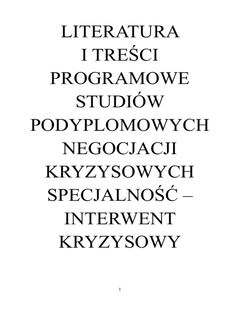 LITERATURA I TREŚCI PROGRAMOWE STUDIÓW PODYPLOMOWYCH NEGOCJACJI KRYZYSOWYCH SPECJALNOŚĆ – INTERWENT KRYZYSOWY 1 Bezpieczeństwo w negocjacjach kryzysowych Forma przedmiotu: warsztaty Cel zajęć : Zajęcia mają na celu naukę umiejętności obronny w sytuacjach bezpośredniego zagrożenia życia, stosowania środków przymusu bezpośredniego uwzględnieniem zasad i procedur ich stosowania z elementami taktyki interwencji. Program zajęć 1. Zachowanie się i postępowanie w stosunku do osoby (osób) agresywnej (wykład, pokaz, ćwiczenia, symulacje) 2. Postępowanie w sytuacji zamachu terrorystycznego - sytuacja zakładnicza. (wykład, pokaz, ćwiczenia, symulacje) 3. Postępowanie w przypadku rozboju i wymuszenia rozbójniczego.(wykład, pokaz, ćwiczenia, symulacje) 4. Postępowanie z "niebezpieczną przesyłką". ( wykład, prezentacja) 5. Procedury postępowania w przypadku pożaru, zagrożenia bombowego, katastrofy. 6. Pierwsza pomoc ofiarom sytuacji kryzysowych, (wykład,prezentacja, ćwiczenia, można też pierwszą pomoc wpleść w symulacje różnych sytuacji kryzysowych) 7. Kierowanie działaniami po zaistnieniu sytuacji kryzysowych do czasu przybycia policji lub służb ratowniczych. (pierwsza pomoc ofiarom, zabezpieczenie miejsca zdarzenia, powiadamianie służb ratowniczych, wykład, ćwiczenia, symulacje,) Bibliografia : 1. Dobrzyjałowski J., Samoobrona i techniki interwencyjne. Legionowo 1994 2. Dobrzyjałowski J., Mała encyklopedia samoobrony. Legionowo 2001. 3. Dobrzyjałowski J., Pałka typu Tonfa przewodnik metodyczno - szkoleniowy dla służb mundurowych. Wyd. "Raster", 2002. 4. Dobrzyjałowski J., Machulski J., Rudnicki A., Pałka typu Tonfa techniki użytkowe. Legionowo 1999. 5. Demura F., "Tonfa"., Wyd. Budo - Sport. Warszawa 1994. 6. Pawluk J., Wybrane zagadnienia teorii treningu sportów walki. Warszawa 1973. 7. Kondratowicz K., Ju-jitsu - sztuka walki obronnej. Warszawa 1991. 8. Jałoszyński K. Współczesny wymiar antyterroryzmu. Wyd. TRIO. Warszawa 2008. 2 Rozwiązywanie konfliktów interpersonalnych Formuła przedmiotu : ćwiczenia Założenia i cele przedmiotu : Tematyka zajęć Kompetencje społeczne a możliwość kontroli przebiegu konfliktów. Czynnki regulujace zachowanie ludzi: a)czynniki społeczne procesy grupowe, normy, teorie sprawiedliwości Zaufanie w relacjach interpersonalnych. Reputacja spoleczne. Zasady sprawiedliwości: teorie sprawiedliwości, sprawiedliwość dystrybutywna i retrybutywna, wiara w sprawiedliwy swiat. Zasady społecznej wymiany dóbr. Kłamstwo ( teoria interpersonalnego oszustwa D.Bullera i J. Burgoon J., motywy i symptomy kłamstwa, rodzaje kłamstw, ograniczenia swobody kłamania, model oszustwa). Przyczyny zaburzeń w porozumiewaniu się – aspekt relacyjny, teoria analizy transakcyjnej E. Berne‟a, podejście F. Schulza von Thuna).. Typy konfliktów. Dynamika konfliktów ( teorie S. Colemana, D.R. Petersona, K. Thomasa, L.R.Pondy‟ego). Sposoby zachowania się w sytuacji konfliktowej: bezczynność, unikanie, uleganie, kompromis, rywalizacja ,współpraca. Podmiotowe utrudnienia rozwiązywania konfliktów : - zakłócenia percepcyjne dotyczące przyczyny konfliktu, - stronniczość i egocentryzm, podwójne normy, - zniekształcenie obrazu siebie i innych, - sztywność poglądów, spłaszczenie obrazu problemu, - negatywne emocja i zachowania agresywne, - wysuwanie osobistych zarzutów wobec oponenta, - zrzucanie odpowiedzialności za powstanie konfliktu i jego rozwiązanie na partnera. Sytuacyjne utrudnienia w osiąganiu porozumienia: - presja czasu, - utrudniona komunikacja, - różnice w pozycjach partnerów, - działanie pod presją własnej grupy, - obecność publiczności ( świadków ), - zaangażowanie w konflikt trzeciej strony. Typ konfliktu a sposoby jego rozwiązywania. Style rozwiązywania konfliktow. Style negocjowania. Czynniki sprzyjające rozwiązywaniu konfliktów – podobieństwo stron, współzależność w realizacji celu, otwarte i jednoznaczne porozumiewanie się. Specyfika konfliktow rozgrywających się w organizacjach. 3 1. Rola kierownika w rozwiązywaniu konfliktów. Eskalacja konfliktu. Pozytywne i negatywne konsekwencje konfliktów. Cele i efekty kształcenia: Rozszerzenie wiedzy o przyczynach konfliktów . Umiejętność rozpoznawania typów konfliktów. Wiedza o sposobach rozwiązywania konfliktów interpersonalnych. Umiejętność analizy sytuacji konfliktowej . Umiejętność dostosowania sposobu rozwiązywania konfliktów do typu sytuacji konfliktowej. Poznanie zasad prowadzenia negocjacji. Ćwiczenie umiejętności negocjowania poprzez uczestnictwo w grach symulacyjnych. Zapoznanie z technikami manipulacyjnymi stosowanymi w relacjach interpersonalnych. Diagnoza własnych preferencji dotyczących sposobu prowadzenia rozmów negocjacyjnych. Poznanie i zrozumienie procesu komunikacji interpersonalnej oraz kształtowanie umiejętności porozumiewania się, ze szczególnym uwzględniem wypowiedzi przez publicznościa (referaty, odpowiedzi ustne, udział w dyskusji, prezentacje). Świadomość możliwości zastosowania w praktyce wiedzy dotyczącej teorii komunikacji: Zrozumienie wagi czynnikow kontrolujących przebieg komunikacji. Poznanie sposobu dostosowania się do rozmówcy. Świadomość znaczenia etyki w prowadzeniu negocjacji. 2. Uwagi o realizacji Metody dydaktyczne: podająca, praca w zespołach, indywidualna praca studentów – przygotowanie prezentacji, gry symulacyjne, dyskusja. Środki dydaktyczne: rzutnik multimedialny, rzutnik pisma, kwestionariusze 3. 4 Literatura podstawowa: Argyle, M. (1999). Psychologia stosunków międzyludzkich. Wydawnictwo Naukowe PWN, Warszawa. Balawajder, K. (1998).Konflikt, komunikacja, negocjacje. Katowice: Wydawnictwo Uniwersytetu Śląskiego. Cialdini ,R.,(1994). Wywieranie wpływu na ludzi. Teoria i praktyka. Gdańsk: Gdańskie Wydawnictwo Psychologiczne. Deutsch,M. Coleman,P.T.,(2005). Rozwiązywanie konfliktów.Kraków: Wydawn