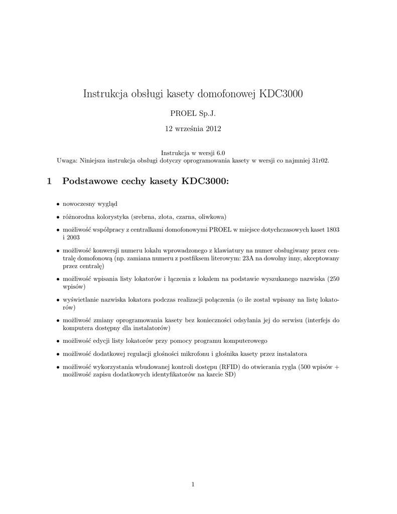 Instrukcja obsługi kasety domofonowej KDC3000 PROEL Sp.J. 12 września 2012 Instrukcja w wersji 6.0 Uwaga: Niniejsza instrukcja obsługi dotyczy oprogramowania kasety w wersji co najmniej 31r02. 1 Podstawowe cechy kasety KDC3000: • nowoczesny wygląd • różnorodna kolorystyka (srebrna, złota, czarna, oliwkowa) • możliwość współpracy z centralkami domofonowymi PROEL w miejsce dotychczasowych kaset 1803 i 2003 • możliwość konwersji numeru lokalu wprowadzonego z klawiatury na numer obsługiwany przez centralę domofonową (np. zamiana numeru z postfiksem literowym: 23A na dowolny inny, akceptowany przez centralę) • możliwość wpisania listy lokatorów i łączenia z lokalem na podstawie wyszukanego nazwiska (250 wpisów) • wyświetlanie nazwiska lokatora podczas realizacji połączenia (o ile został wpisany na listę lokatorów) • możliwość zmiany oprogramowania kasety bez konieczności odsyłania jej do serwisu (interfejs do komputera dostępny dla instalatorów) • możliwość edycji listy lokatorów przy pomocy programu komputerowego • możliwość dodatkowej regulacji głośności mikrofonu i głośnika kasety przez instalatora • możliwość wykorzystania wbudowanej kontroli dostępu (RFID) do otwierania rygla (500 wpisów + możliwość zapisu dodatkowych identyfikatorów na karcie SD) 1 2 2.1 Instalowanie kasety KDC3000 Podłączenie kasety Kasetę podłączyć do centralki przy pomocy kabla 6-cio przewodowego, do zacisków K1 – K6, analogicznie jak kasety KDC1803 i KDC2003. Nadwyżkę przewodu należy zwinąć i umieścić w przestrzeni obok zacisków śrubowych, lub pozostawić zwiniętą w puszce podtynkowej pod kasetą. 2.2 Mocowanie kasety Przed zamocowaniem kasety należy przewidzieć zabezpieczenie tylnego otworu przed zalaniem wodą. Jeśli istnieje możliwość ściekania wody po ścianie do której będzie zamocowane urządzenie, należy bezwzględnie zabezpieczyć otwór przez użycie uszczelki, która po dociśnięciu kasety do podłoża uniemożliwi zaciekanie wody przez otwór instalacyjny do wnętrza kasety. Można użyć np. gumowych uszczelek stosowanych do uszczelniania okien. Kasetę należy zamocować do ściany przy pomocy 4 wkrętów z kołkami plastikowymi, przez otwory znajdujące się w tylnej ściance kasety a widoczne od przodu kasety po lewej i prawej stronie. Zainstalować boczne listwy maskujące wkładając je pod kątem i naciskając w kierunku ściany. Założyć plastikowe zaślepki od góry i od dołu kasety. 2 ! 3 Programowanie kasety KDC3000 Dostęp do edycji parametrów pracy kasety, jak również do edycji listy lokatorów wymaga wprowadzenia kasety w tryb programowania. Należy pamiętać, że programowanie parametrów kasety, jest procesem niezależnym od programowania parametrów pracy centrali CD1803. Sposób programowania i użytkowania centrali CD1803 są opisane w instrukcji obsługi do tej centrali. Konwencja użycia klawiszy w trybie edycji jest następująca: - klawisze: oraz służą do poruszania kursorem - klawisz w trybie edycji pól kasuje znak przed kursorem, a podczas wyświetlania okna dialogowego powoduje wyjście do poprzedniego menu - klawisze numeryczne 0 – 9 umożliwiają wprowadzanie cyfr oraz liter (w zależności od rodzaju edytowanego parametru) analogicznie, jak w telefonach komórkowych - klawisz zatwierdza wybraną opcję lub wyświetla dodatkowe okno dialogowe (w zależności od kontekstu) - klawisz wywołuje okno dialogowe z dodatkowymi opcjami W celu wprowadzenia kasety w tryb programowania wykonaj następujące czynności: • Naciśnij 7 razy klawisz –– na wyświetlaczu pojawi się komunikat: „-A-” Uwaga: Pod komunikatem „-A-” wyświetlona jest wersja oprogramowania i data jej wydania. Należy się upewnić, że w kasecie jest zainstalowana najnowsza wersja oprogramowania. Najnowszą wersję można znaleźć na stronie www.proel.pl • Wprowadź kod instalatora (domyślnie: 240361) – po wprowadzeniu prawidłowego kodu wyświetli się lista dostępnych opcji programowania • Wybierz przy pomocy klawiszy żądaną opcję i zatwierdzić klawiszem 3 3.1 Dostępne opcje głównego okna dialogowego • „Wyjście” – wybranie tej opcji powoduje przejście do normalnej pracy • „Edycja listy lokatorów” • „Ustawienia” – edycja niektórych parametrów pracy kasety • „Język (Language)” – zmiana aktywnego języka • „Regulacje” – zmiana jasności, kontrastu oraz głośności • „Diagnostyka” – wyświetlenie niektórych parametrów pracy (napięcia, temperatura itp.) • „Narzędzia” – import/eksport danych lokatorów i RFID z karty SD 3.2 Edycja listy lokatorów Lista lokatorów, może służyć nie tylko do identyfikowania oraz wyszukiwania lokatora na podstawie nazwiska, ale umożliwia także rozszerzenie możliwości centrali domofonowej o wybieranie numeru lokalu z postfiksem literowym, a także o zamianę numeru wprowadzonego z klawiatury, na inny, obowiązujący w centrali. Wejście do edycji listy uzyskuje się po wybraniu opcji „Edycja listy lokatorów” z głównego menu programowania. Procedura edycji listy lokatorów: • Wprowadź kasetę w tryb programowania • Wybierz z menu opcję „Edycja listy lokatorów” i zatwierdź klawiszem • Wybierz przy pomocy klawiszy numerycznych 1 – 9 w celu wybrania zakładki z pierwszą literą nazwiska (zgodnie z konwencją przyjętą w telefonach komórkowych) i/lub klawiszy aby ustawić kursor na poszukiwanej pozycji a następnie użyj klawisza w celu wyświetlenia możliwych funkcji edycyjnych. 4 • Użyj klawiszy aby wybrać pożądaną opcję a następnie zatwierdź klawiszem Uwaga: Możliwe jest wejście w edycję wpisu danego lokalu za pomocą RFID MASTER. Aby wejść w edycję należy z poziomu okna głównego wybrać numer lokalu, który ma być edytowany, a następnie przyłożyć identyfikator oznaczony w systemie jako RFID MASTER. RFID MASTER, to iden
