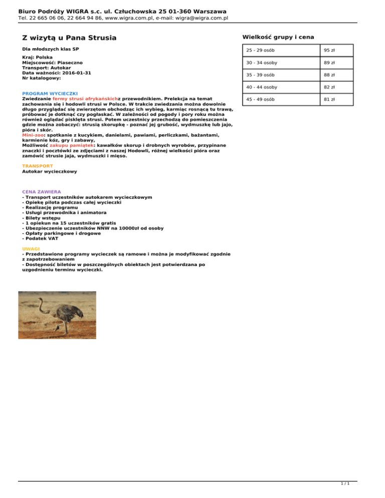 Biuro Podróży WIGRA s.c. ul. Człuchowska 25 01-360 Warszawa Tel. 22 665 06 06, 22 664 94 86, www.wigra.com.pl, e-mail: [email protected] Z wizytą u Pana Strusia Dla młodszych klas SP Kraj: Polska Miejscowość: Piaseczno Transport: Autokar Data ważności: 2016-01-31 Nr katalogowy: PROGRAM WYCIECZKI Zwiedzanie fermy strusi afrykańskichz przewodnikiem. Prelekcja na temat zachowania się i hodowli strusi w Polsce. W trakcie zwiedzania można dowolnie długo przyglądać się zwierzętom obchodząc ich wybieg, karmiąc rosnącą tu trawą, próbować je dotknąć czy pogłaskać. W zależności od pogody i pory roku można również oglądać pisklęta strusi. Potem uczestnicy przechodzą do pomieszczenia gdzie można zobaczyć: strusią skorupkę - poznać jej grubość, wydmuszkę lub jajo, pióra i skór. Mini-zoo: spotkanie z kucykiem, danielami, pawiami, perliczkami, bażantami, karmienie kóz, gry i zabawy, Możliwość zakupu pamiątek: kawałków skorup i drobnych wyrobów, przypinane znaczki i pocztówki ze zdjęciami z naszej Hodowli, różnej wielkości pióra oraz zamówić strusie jaja, wydmuszki i mięso. Wielkość grupy i cena 25 - 29 osób 95 zł 30 - 34 osoby 89 zł 35 - 39 osób 88 zł 40 - 44 osoby 82 zł 45 - 49 osób 81 zł TRANSPORT Autokar wycieczkowy CENA ZAWIERA - Transport uczestników autokarem wycieczkowym - Opiekę pilota podczas całej wycieczki - Realizację programu - Usługi przewodnika i animatora - Bilety wstępu - 1 opiekun na 15 uczestników gratis - Ubezpieczenie uczestników NNW na 10000zł od osoby - Opłaty parkingowe i drogowe - Podatek VAT UWAGI - Przedstawione programy wycieczek są ramowe i można je modyfikować zgodnie z zapotrzebowaniem - Dostępność biletów w poszczególnych obiektach jest potwierdzana po uzgodnieniu terminu wycieczki. 1/1 Powered by TCPDF (www.tcpdf.org)