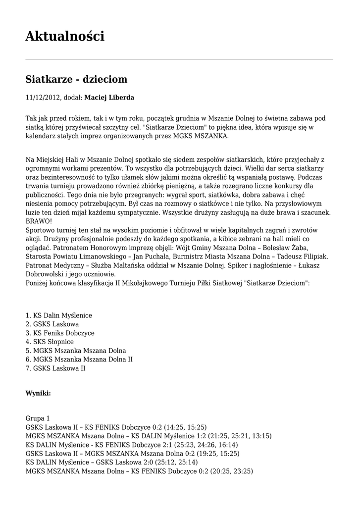 Aktualności Siatkarze - dzieciom 11/12/2012, dodał: Maciej Liberda Tak jak przed rokiem, tak i w tym roku, początek grudnia w Mszanie Dolnej to świetna zabawa pod siatką której przyświecał szczytny cel. "Siatkarze Dzieciom" to piękna idea, która wpisuje się w kalendarz stałych imprez organizowanych przez MGKS MSZANKA. Na Miejskiej Hali w Mszanie Dolnej spotkało się siedem zespołów siatkarskich, które przyjechały z ogromnymi workami prezentów. To wszystko dla potrzebujących dzieci. Wielki dar serca siatkarzy oraz bezinteresowność to tylko ułamek słów jakimi można określić tą wspaniałą postawę. Podczas trwania turnieju prowadzono również zbiórkę pieniężną, a także rozegrano liczne konkursy dla publiczności. Tego dnia nie było przegranych: wygrał sport, siatkówka, dobra zabawa i chęć niesienia pomocy potrzebującym. Był czas na rozmowy o siatkówce i nie tylko. Na przysłowiowym luzie ten dzień mijał każdemu sympatycznie. Wszystkie drużyny zasługują na duże brawa i szacunek. BRAWO! Sportowo turniej ten stał na wysokim poziomie i obfitował w wiele kapitalnych zagrań i zwrotów akcji. Drużyny profesjonalnie podeszły do każdego spotkania, a kibice zebrani na hali mieli co oglądać. Patronatem Honorowym imprezę objęli: Wójt Gminy Mszana Dolna – Bolesław Żaba, Starosta Powiatu Limanowskiego – Jan Puchała, Burmistrz Miasta Mszana Dolna – Tadeusz Filipiak. Patronat Medyczny – Służba Maltańska oddział w Mszanie Dolnej. Spiker i nagłośnienie – Łukasz Dobrowolski i jego uczniowie. Poniżej końcowa klasyfikacja II Mikołajkowego Turnieju Piłki Siatkowej "Siatkarze Dzieciom": 1. KS Dalin Myślenice 2. GSKS Laskowa 3. KS Feniks Dobczyce 4. SKS Słopnice 5. MGKS Mszanka Mszana Dolna 6. MGKS Mszanka Mszana Dolna II 7. GSKS Laskowa II Wyniki: Grupa 1 GSKS Laskowa II – KS FENIKS Dobczyce 0:2 (14:25, 15:25) MGKS MSZANKA Mszana Dolna – KS DALIN Myślenice 1:2 (21:25, 25:21, 13:15) KS DALIN Myślenice - KS FENIKS Dobczyce 2:1 (25:23, 24:26, 16:14) GSKS Laskowa II – MGKS MSZANKA Mszana Dolna 0:2 (19:25, 15:25) KS DALIN Myślenice – GSKS Laskowa 2:0 (25:12, 25:14) MGKS MSZANKA Mszana Dolna – KS FENIKS Dobczyce 0:2 (20:25, 23:25) Grupa 2 GSKS Laskowa – MGKS MSZANKA II Mszana Dolna 2:0 (25:14, 25:12) MGKS MSZANKA II Mszana Dolna – SKS Słopnice 0:2 (18:25, 21:25) GSKS Laskowa – SKS Słopnice 2:0 (25:18, 25:19) Mecz o III miejsce: SKS Słopnice – KS FENIKS Dobczyce 0:2 (17:25, 16:25) FINAŁ: KS DALIN Myślenice – GSKS Laskowa 2:0 (25:21, 25:21) Nagrody indywidualne: MVP: Daniel Klakla (KS Dalin Myślenice) Najlepszy atakujący: Marcin Żegleń (KS Dalin Myślenice) Najlepszy rozgrywający: Marcin Matras (GSKS Laskowa) Konkurs gwoździa: Mikołaj Dyląg Koszyczek Siatkarski: Wiktor Kaciczak Zagrywka VIP-a: Adam Wietrzyk Gratulujemy zwycięzcom oraz wszystkim drużynom, że stworzyły swoją obecnością tak miły turniej. Nagrody dla zawodników i kibiców ufundowało Starostwo Powiatowe w Limanowej. Puchary i dyplomy Gmina Mszana Dolna. Miasto Mszana Dolna było współorganizatorem i gospodarzem imprezy. Dziękujemy serdecznie każdej osobie, która w organizacje tych szczególnych zawodów dołożyła swoją cegiełkę. Beneficjentem zebranych datków był Gminny Ośrodek Pomocy Społecznej w Mszanie Dolnej oraz Komisja Zdrowia Przy Radzie Miasta Mszana Dolna. „Jesteśmy dumni z tej imprezy i dziękuję wszystkim, którzy nam pomogli. To wspaniała idea, którą należy kultywować i wdrażać w naszą działalność. Pomagać innym to wielka rzecz i wzorowa postawa godna każdego człowieka. Jeszcze raz wielkie dzięki! Oby jak najwięcej było tego typu imprez” – podkreślał prezes MGKS MSZANKA Mszana Dolna - Artur Żaba. red. Artur Żaba zdjęcia