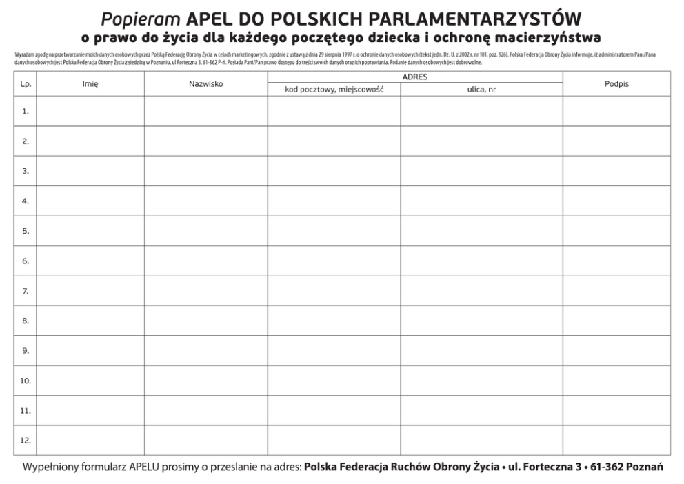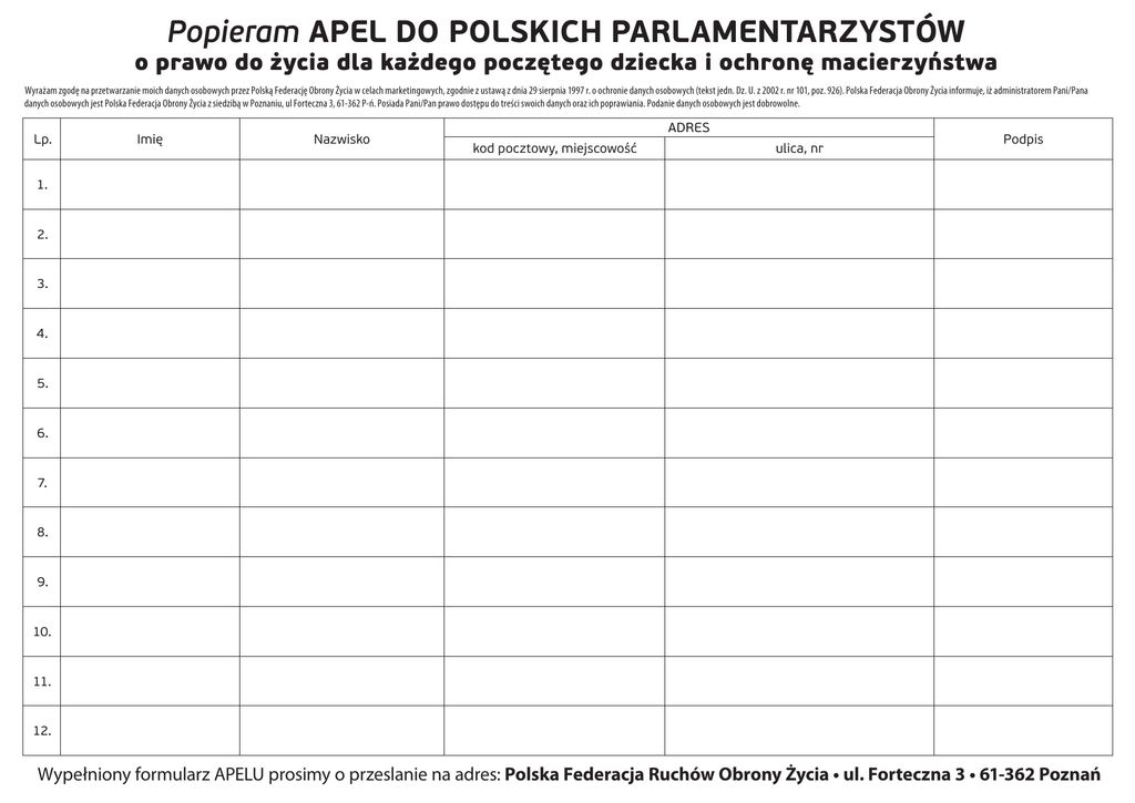 Popieram APEL DO POLSKICH PARLAMENTARZYSTÓW o prawo do życia dla każdego poczętego dziecka i ochronę macierzyństwa Wyrażam zgodę na przetwarzanie moich danych osobowych przez Polską Federację Obrony Życia w celach marketingowych, zgodnie z ustawą z dnia 29 sierpnia 1997 r. o ochronie danych osobowych (tekst jedn. Dz. U. z 2002 r. nr 101, poz. 926). Polska Federacja Obrony Życia informuje, iż administratorem Pani/Pana danych osobowych jest Polska Federacja Obrony Życia z siedzibą w Poznaniu, ul Forteczna 3, 61-362 P-ń. Posiada Pani/Pan prawo dostępu do treści swoich danych oraz ich poprawiania. Podanie danych osobowych jest dobrowolne. Lp. Imię Nazwisko ADRES kod pocztowy, miejscowość ulica, nr Podpis 1. 2. 3. 4. 5. 6. 7. 8. 9. 10. 11. 12. Wypełniony formularz APELU prosimy o przeslanie na adres: Polska Federacja Ruchów Obrony Życia • ul. Forteczna 3 • 61-362 Poznań