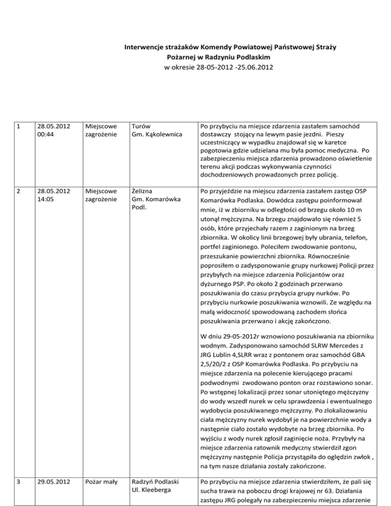 Interwencje strażaków Komendy Powiatowej Państwowej Straży Pożarnej w Radzyniu Podlaskim w okresie 28-05-2012 -25.06.2012 1 28.05.2012 00:44 Miejscowe zagrożenie Turów Gm. Kąkolewnica Po przybyciu na miejsce zdarzenia zastałem samochód dostawczy stojący na lewym pasie jezdni. Pieszy uczestniczący w wypadku znajdował się w karetce pogotowia gdzie udzielana mu była pomoc medyczna. Po zabezpieczeniu miejsca zdarzenia prowadzono oświetlenie terenu akcji podczas wykonywania czynności dochodzeniowych prowadzonych przez policję. 2 28.05.2012 14:05 Miejscowe zagrożenie Żelizna Gm. Komarówka Podl. Po przyjeździe na miejscu zdarzenia zastałem zastęp OSP Komarówka Podlaska. Dowódca zastępu poinformował mnie, iż w zbiorniku w odległości od brzegu około 10 m utonął mężczyzna. Na brzegu znajdowało się również 5 osób, które przyjechały razem z zaginionym na brzeg zbiornika. W okolicy linii brzegowej były ubrania, telefon, portfel zaginionego. Poleciłem zwodowanie pontonu, przeszukanie powierzchni zbiornika. Równocześnie poprosiłem o zadysponowanie grupy nurkowej Policji przez przybyłych na miejsce zdarzenia Policjantów oraz dyżurnego PSP. Po około 2 godzinach przerwano poszukiwania do czasu przybycia grupy nurków. Po przybyciu nurkowie poszukiwania wznowili. Ze względu na małą widoczność spowodowaną zachodem słońca poszukiwania przerwano i akcję zakończono. W dniu 29-05-2012r wznowiono poszukiwania na zbiorniku wodnym. Zadysponowano samochód SLRW Mercedes z JRG Lublin 4,SLRR wraz z pontonem oraz samochód GBA 2,5/20/2 z OSP Komarówka Podlaska. Po przybyciu na miejsce zdarzenia na polecenie kierującego pracami podwodnymi zwodowano ponton oraz rozstawiono sonar. Po wstępnej lokalizacji przez sonar utoniętego mężczyzny do wody wszedł nurek w celu sprawdzenia i ewentualnego wydobycia poszukiwanego mężczyzny. Po zlokalizowaniu ciała mężczyzny nurek wydobył je na powierzchnie wody a następnie ciało zostało wydobyte na brzeg zbiornika. Po wyjściu z wody nurek zgłosił zaginięcie noża. Przybyły na miejsce zdarzenia ratownik medyczny stwierdził zgon mężczyzny następnie Policja przystąpiła do oględzin zwłok , na tym nasze działania zostały zakończone. 3 29.05.2012 Pożar mały Radzyń Podlaski Ul. Kleeberga Po przybyciu na miejsce zdarzenia stwierdziłem, że pali się sucha trawa na poboczu drogi krajowej nr 63. Działania zastępu JRG polegały na zabezpieczeniu miejsca zdarzenie oraz podaniu jednego prądu wody w natarciu na płonącą trawę. Po ugaszeniu pożaru akcję zakończono. 4 31.05.2012 11:38 Miejscowe zagrożenie Wola Osowińska Ul. Filipińska Po przybyciu na miejsce zastałem patrol Policji prowadzący czynności dochodzeniowe. Uzyskano informację, że w studni prawdopodobnie może znajdować się broń palna. Wypompowano wodę. W celu umożliwienia funkcjonariuszom Policji sprawdzenia dna studni wypompowano wodę (około 2000 litrów). Na tym działania zakończono. 5 03-06-2012 07:02 Pożar mały Radzyń Podl. Po przybyciu na miejsce pożaru stwierdziłem, że pali sie plastikowy kosz na śmieci. Podano prąd wody z szybkiego natarcia. Po chwili kosz ugaszono i akcję zakończono. 5. 04-05-2012 8:27 Miejscowe zagrożenie Radzyń Podl Ul. Kościuszki Po przybyciu na miejsce zdarzenia zastałem samochód ciężarowy stojący na poboczu drogi. Z informacji kierującego samochodem ciężarowym wynikało, że rowerzysta nie ustąpił pierwszeństwa przejazdu na skrzyżowaniu co doprowadziło do zderzenia. Poszkodowany rowerzysta oddalił się z miejsca zdarzenia. Działania zastępu JRG polegały na zabezpieczeniu miejsca zdarzenia do czasu odnalezienia rowerzysty przez funkcjonariuszy Policji. Odnaleziony rowerzysta został przetransportowany do szpitala przez Pogotowie. Na tym akcja została zakończona. 6. 04-05-2012 17:21 Miejscowe zagrożenie Radzyń Podlaski ul. Warszawska Po przybyciu na miejsce zdarzenia zastałem leżący motocykl na jednym pasie drogi, obok znajdował się poszkodowany motocyklista. Działania zastępów polegały na zabezpieczeniu miejsca zdarzenia. Poszkodowanemu sprawdzono podstawowe czynności życiowe, założono kołnierz ortopedyczny i ułożono na noszach typu deska. Przybyła po chwili załoga Pogotowia Ratunkowego przetransportowała motocyklistę do szpitala. Dalsze nasze działania polegały na neutralizacji rozlanych z motocykla płynów eksploatacyjnych. Po przeprowadzeniu przez Policję czynności dochodzeniowych uprzątnięto drogę i akcję zakończono. Po przybyciu na miejsce zastępu zastano samochód osobowy Fiat Punto i motorower stojące na prawym poboczu jezdni. Osoba poszkodowana w kolizji (motorowerzysta) znajdowała się w karetce pogotowia. Na miejscu był również patrol policji. Działania zastępu polegały na zabezpieczeniu miejsca zdarzenia. 7. 06.06.2012 15:02 Miejscowe zagrożenie Wola Chomejowa Gm. Borki 8. 08.06-2012 15:32 Miejscowe zagrożenie Radzyń Podlaski ul. Broniewskiego 9 10-06-2012 19:52 Miejscowe zagrożenie Branica Suchowolska Po przybyciu na miejsce zdarzenia stwierdziłem, że przed wejściem do budynku mieszkalnego zagnieździły się szerszenie. Następnie ratownicy z JRG w ubraniach ochronnych zebrali gniazdo do worka i wywieźli poza teren zamieszkały przez ludzi. Na tym akcję zakończono. 10. 11-06-2012 13:48 Miejscowe zagrożenie Przegaliny Duże Gm. Komarówka Podl. Po przybyciu na miejsce zastęp OSP Przegaliny Duże stwierdził, że doszło do zalania piwnicy w budynku mieszkalnym na wysokość około 0,5 metra. Przy użyciu pompy elektrycznej wodę wypompowano i akcję zakończono. 11. 11-06-2012 15:30 Miejscowe zagrożenie Radzyń Podlaski Ul. Warszawska Po przybyciu na miejsce zdarzenia stwierdzono, że z nieszczelnego przewodu instalacji gazowej w samochodzie wydobywa się gaz. Działania zastępu JRG Radzyń Podl. polegały na zabezpieczeniu miejsca zdarzenia i zakręceniu głównego zaworu przy zbiorniku. 12 13