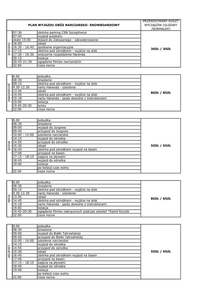 PLAN WYJAZDU OBÓZ NARCIARSKO- SNOWBOARDOWY PRZEWIDYWANY KOSZT WYCIĄGÓW (ULGOWY /NORMALNY) zbiórka parking CSN Szczęśliwice wyjazd autokaru dojazd do Zakopanego - zakwaterowanie obiad spotkanie organizacyjne zbiórka pod ośrodkiem - wyjście na stok wieczorne rozjeżdżenie Harenda kolacja oglądanie filmów narciarskich cisza nocna 30ZŁ / 30ZŁ poniedziałek 8.00 08:30 09:15 9.30-12.30 13.30 14:45 15-18 19.00 19.45-20:30 22.00 pobudka śniadanie zbiórka pod ośrodkiem - wyjście na stok narty Harenda - szkolenie obiad zbiórka pod ośrodkiem - wyjście na stok narty Harenda - jazdy dowolne z instruktorami kolacja łyżwy cisza nocna 80ZŁ / 85ZŁ 8.00 08:30 09:00 09:40 10:00 - 14:00 14:15 14:55 15:30 16:45 17:00 17:15 - 18:15 18:45 19:00 50ZŁ / 65ZŁ 22.00 pobudka śniadanie wyjazd do Jurgowa przyjazd do Jurgowa szkolenie narciarskie wyjazd do ośrodka przyjazd do ośrodka obiad zbiórka pod ośrodkiem wyjazd na basen przyjazd na basen zajęcia na pływalni wyjazd do ośrodka kolacja po kolacji czas wolny cisza nocna 8.00 08:30 09:15 9.30-12.30 13.30 14:45 15-18 19.00 19.45-20:30 22.00 pobudka śniadanie zbiórka pod ośrodkiem - wyjście na stok narty Harenda - szkolenie obiad zbiórka pod ośrodkiem - wyjście na stok narty Harenda - jazdy dowolne z instruktorami kolacja oglądanie filmów nakręconych podczas szkoleń *Kamil Korzeb cisza nocna 80ZŁ / 85ZŁ 8.00 08:30 09:00 09:40 10:00 - 14:00 14:15 14:55 15:30 16:45 17:00 17:15 - 18:15 18:45 19:00 pobudka śniadanie wyjazd do Białki Tatrzańskiej przyjazd do Białki Tatrzańskiej szkolenie narciarskie wyjazd do ośrodka przyjazd do ośrodka obiad zbiórka pod ośrodkiem wyjazd na basen przyjazd na basen zajęcia na pływalni wyjazd do ośrodka kolacja po kolacji czas wolny cisza nocna 50ZŁ / 65ZŁ wtorek niedziela 07:30 07:45 około 15:00 16:00 16:30 - 16:45 17:15 17:30 - 19:30 20:15 20:45-21:30 22.00 środa czwartek 22.00 piątek 8.00 00:30 09:00 09:20 09:40 - 14:20 14:40 15:00 15:30 17:00 17:15 - 19:15 20:00 20:45 - 21:15 22.00 pobudka śniadanie wyjazd do Małe Ciche przyjazd do Małe Ciche szkolenie narciarskie wyjazd do ośrodka przyjazd do ośrodka obiad zbiórka pod ośrodkiem - wyjście na stok narty Harenda - jazdy dowolne z instruktorami kolacja gry i zabawy na śniegu cisza nocna sobota 8.00 08:30 09:00 10:00 13:15 14:00 14:30 15:30 15:45 16:00 18:00 19:00 19:45 20:30 22.00 pobudka śniadanie zbiórka pod ośrodkiem - wyjazd do Nowego Targu narty Nowy Targ - Długa Polana - ZAWODY i jazdy dowolne wyjazd do ośrodka przyjazd do ośrodka obiad zbiórka pod ośrodkiem wyjazd na basen przyjazd na basen zajęcia na pływalni wyjazd do ośrodka kolacja dekoracja uczestników - dyplomy , medale pakowanie cisza nocna - 13:00 - 17:45 - 20:30 - 22:00 niedziela 07:00 7:30-8:15 08:30 09:00 około 16:30 pobudka pakowanie autokaru śniadanie wyjazd do Warszawy dojazd do Warszawy 90ZŁ / 100ZŁ 45ZŁ