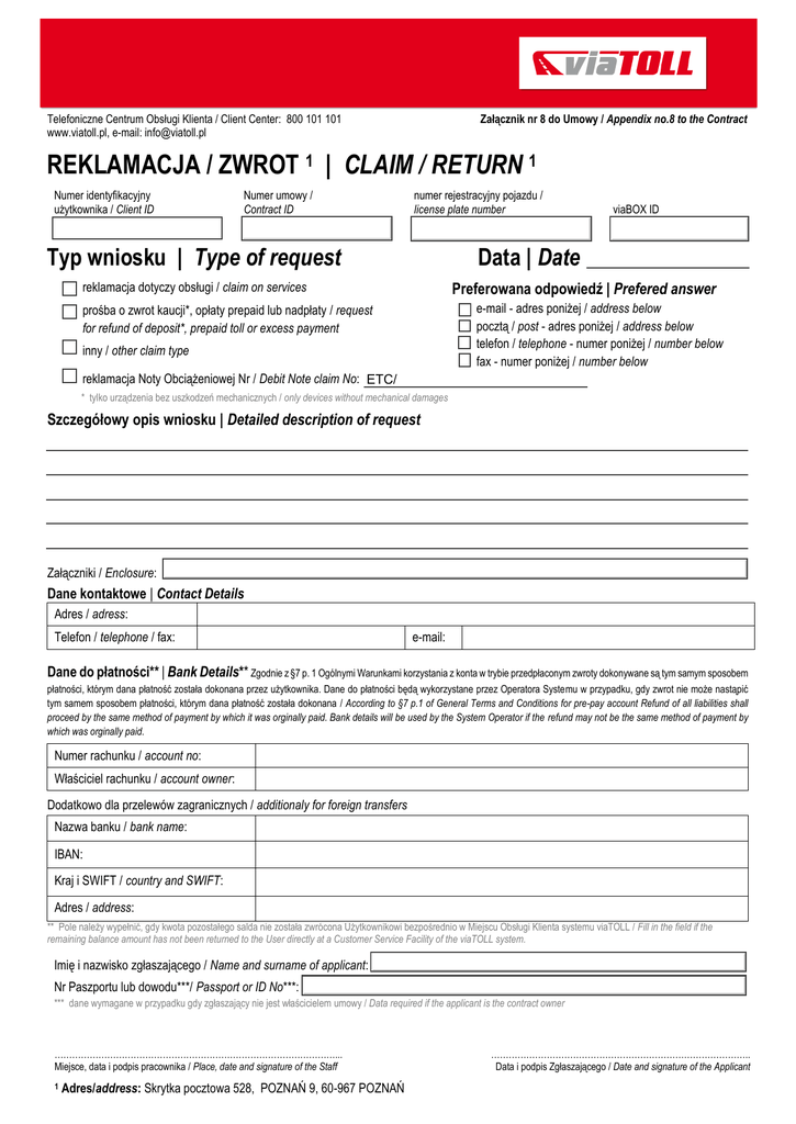 Telefoniczne Centrum Obsługi Klienta / Client Center: 800 101 101 www.viatoll.pl, e-mail: [email protected] Załącznik nr 8 do Umowy / Appendix no.8 to the Contract REKLAMACJA / ZWROT 1 | CLAIM / RETURN 1 Numer identyfikacyjny użytkownika / Client ID Numer umowy / Contract ID numer rejestracyjny pojazdu / license plate number Typ wniosku | Type of request viaBOX ID Data | Date reklamacja dotyczy obsługi / claim on services Preferowana odpowiedź | Prefered answer e-mail - adres poniżej / address below pocztą / post - adres poniżej / address below telefon / telephone - numer poniżej / number below fax - numer poniżej / number below prośba o zwrot kaucji*, opłaty prepaid lub nadpłaty / request for refund of deposit*, prepaid toll or excess payment inny / other claim type reklamacja Noty Obciążeniowej Nr / Debit Note claim No: ETC/ * tylko urządzenia bez uszkodzeń mechanicznych / only devices without mechanical damages Szczegółowy opis wniosku | Detailed description of request Załączniki / Enclosure: Dane kontaktowe | Contact Details Adres / adress: Telefon / telephone / fax: e-mail: Dane do płatności** | Bank Details** Zgodnie z §7 p. 1 Ogólnymi Warunkami korzystania z konta w trybie przedpłaconym zwroty dokonywane są tym samym sposobem płatności, którym dana płatność została dokonana przez użytkownika. Dane do płatności będą wykorzystane przez Operatora Systemu w przypadku, gdy zwrot nie może nastąpić tym samem sposobem płatności, którym dana płatność została dokonana / According to §7 p.1 of General Terms and Conditions for pre-pay account Refund of all liabilities shall proceed by the same method of payment by which it was orginally paid. Bank details will be used by the System Operator if the refund may not be the same method of payment by which was orginally paid. Numer rachunku / account no: Właściciel rachunku / account owner: Dodatkowo dla przelewów zagranicznych / additionaly for foreign transfers Nazwa banku / bank name: IBAN: Kraj i SWIFT / country and SWIFT: Adres / address: ** Pole należy wypełnić, gdy kwota pozostałego salda nie została zwrócona Użytkownikowi bezpośrednio w Miejscu Obsługi Klienta systemu viaTOLL / Fill in the field if the remaining balance amount has not been returned to the User directly at a Customer Service Facility of the viaTOLL system. Imię i nazwisko zgłaszającego / Name and surname of applicant: Nr Paszportu lub dowodu***/ Passport or ID No***: *** dane wymagane w przypadku gdy zgłaszający nie jest właścicielem umowy / Data required if the applicant is the contract owner ……………………………………………………………………………………... Miejsce, data i podpis pracownika / Place, date and signature of the Staff 1 Adres/address: Skrytka pocztowa 528, POZNAŃ 9, 60-967 POZNAŃ …………………………………………………………………………….. Data i podpis Zgłaszającego / Date and signature of the Applicant