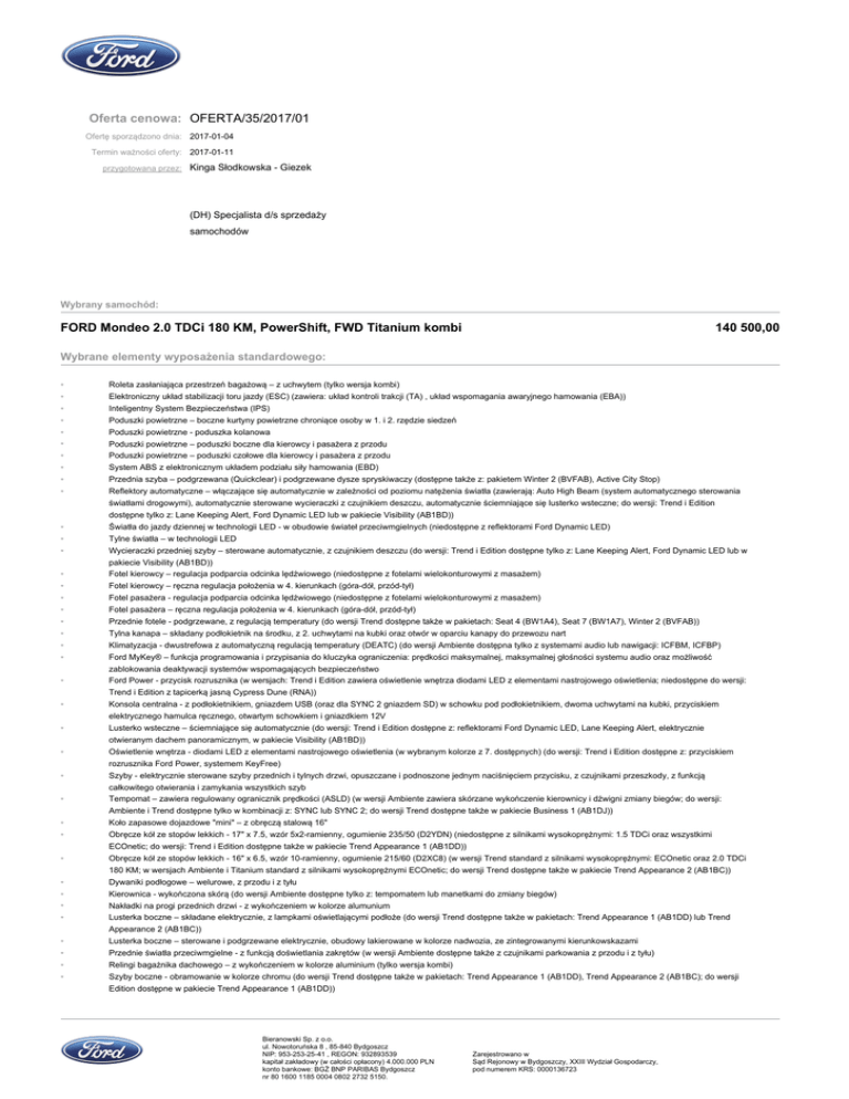 Oferta cenowa: OFERTA/35/2017/01 Ofertę sporządzono dnia: 2017-01-04 Termin ważności oferty: 2017-01-11 przygotowana przez: Kinga Słodkowska - Giezek (DH) Specjalista d/s sprzedaży samochodów Wybrany samochód: FORD Mondeo 2.0 TDCi 180 KM, PowerShift, FWD Titanium kombi 140 500,00 Wybrane elementy wyposażenia standardowego: * Roleta zasłaniająca przestrzeń bagażową – z uchwytem (tylko wersja kombi) * Elektroniczny układ stabilizacji toru jazdy (ESC) (zawiera: układ kontroli trakcji (TA) , układ wspomagania awaryjnego hamowania (EBA)) * Inteligentny System Bezpieczeństwa (IPS) * Poduszki powietrzne – boczne kurtyny powietrzne chroniące osoby w 1. i 2. rzędzie siedzeń * Poduszki powietrzne - poduszka kolanowa * Poduszki powietrzne – poduszki boczne dla kierowcy i pasażera z przodu * Poduszki powietrzne – poduszki czołowe dla kierowcy i pasażera z przodu * System ABS z elektronicznym układem podziału siły hamowania (EBD) * Przednia szyba – podgrzewana (Quickclear) i podgrzewane dysze spryskiwaczy (dostępne także z: pakietem Winter 2 (BVFAB), Active City Stop) * Reflektory automatyczne – włączające się automatycznie w zależności od poziomu natężenia światła (zawierają: Auto High Beam (system automatycznego sterowania światłami drogowymi), automatycznie sterowane wycieraczki z czujnikiem deszczu, automatycznie ściemniające się lusterko wsteczne; do wersji: Trend i Edition dostępne tylko z: Lane Keeping Alert, Ford Dynamic LED lub w pakiecie Visibility (AB1BD)) * Światła do jazdy dziennej w technologii LED - w obudowie świateł przeciwmgielnych (niedostępne z reflektorami Ford Dynamic LED) * Tylne światła – w technologii LED * Wycieraczki przedniej szyby – sterowane automatycznie, z czujnikiem deszczu (do wersji: Trend i Edition dostępne tylko z: Lane Keeping Alert, Ford Dynamic LED lub w pakiecie Visibility (AB1BD)) * Fotel kierowcy – regulacja podparcia odcinka lędźwiowego (niedostępne z fotelami wielokonturowymi z masażem) * Fotel kierowcy – ręczna regulacja położenia w 4. kierunkach (góra-dół, przód-tył) * Fotel pasażera - regulacja podparcia odcinka lędźwiowego (niedostępne z fotelami wielokonturowymi z masażem) * Fotel pasażera – ręczna regulacja położenia w 4. kierunkach (góra-dół, przód-tył) * Przednie fotele - podgrzewane, z regulacją temperatury (do wersji Trend dostępne także w pakietach: Seat 4 (BW1A4), Seat 7 (BW1A7), Winter 2 (BVFAB)) * Tylna kanapa – składany podłokietnik na środku, z 2. uchwytami na kubki oraz otwór w oparciu kanapy do przewozu nart * Klimatyzacja - dwustrefowa z automatyczną regulacją temperatury (DEATC) (do wersji Ambiente dostępna tylko z systemami audio lub nawigacji: ICFBM, ICFBP) * Ford MyKey® – funkcja programowania i przypisania do kluczyka ograniczenia: prędkości maksymalnej, maksymalnej głośności systemu audio oraz możliwość zablokowania deaktywacji systemów wspomagających bezpieczeństwo * Ford Power - przycisk rozrusznika (w wersjach: Trend i Edition zawiera oświetlenie wnętrza diodami LED z elementami nastrojowego oświetlenia; niedostępne do wersji: Trend i Edition z tapicerką jasną Cypress Dune (RNA)) * Konsola centralna - z podłokietnikiem, gniazdem USB (oraz dla SYNC 2 gniazdem SD) w schowku pod podłokietnikiem, dwoma uchwytami na kubki, przyciskiem elektrycznego hamulca ręcznego, otwartym schowkiem i gniazdkiem 12V * Lusterko wsteczne – ściemniające się automatycznie (do wersji: Trend i Edition dostępne z: reflektorami Ford Dynamic LED, Lane Keeping Alert, elektrycznie otwieranym dachem panoramicznym, w pakiecie Visibility (AB1BD)) * Oświetlenie wnętrza - diodami LED z elementami nastrojowego oświetlenia (w wybranym kolorze z 7. dostępnych) (do wersji: Trend i Edition dostępne z: przyciskiem * Szyby - elektrycznie sterowane szyby przednich i tylnych drzwi, opuszczane i podnoszone jednym naciśnięciem przycisku, z czujnikami przeszkody, z funkcją * Tempomat – zawiera regulowany ogranicznik prędkości (ASLD) (w wersji Ambiente zawiera skórzane wykończenie kierownicy i dźwigni zmiany biegów; do wersji: * Koło zapasowe dojazdowe "mini" – z obręczą stalową 16" * Obręcze kół ze stopów lekkich - 17" x 7.5, wzór 5x2-ramienny, ogumienie 235/50 (D2YDN) (niedostępne z silnikami wysokoprężnymi: 1.5 TDCi oraz wszystkimi * Obręcze kół ze stopów lekkich - 16" x 6.5, wzór 10-ramienny, ogumienie 215/60 (D2XC8) (w wersji Trend standard z silnikami wysokoprężnymi: ECOnetic oraz 2.0 TDCi rozrusznika Ford Power, systemem KeyFree) całkowitego otwierania i zamykania wszystkich szyb Ambiente i Trend dostępne tylko w kombinacji z: SYNC lub SYNC 2; do wersji Trend dostępne także w pakiecie Business 1 (AB1DJ)) ECOnetic; do wersji: Trend i Edition dostępne także w pakiecie Trend Appearance 1 (AB1DD)) 180 KM; w wersjach Ambiente i Titanium standard z silnikami wysokoprężnymi ECOnetic; do wersji Trend dostępne także w pakiecie Trend Appearance 2 (AB1BC)) * Dywaniki podłogowe – welurowe, z przodu i z tyłu * Kierownica - wykończona skórą (do wersji Ambiente dostępne tylko z: tempomatem lub manetkami do zmiany biegów) * Nakładki na progi przednich drzwi - z wykończeniem w kolorze alumunium * Lusterka boczne – składane elektrycznie, z lampkami oświetlającymi podłoże (do wersji Trend dostępne także w pakietach: Trend Appearance 1 (AB1DD) lub Trend Appearance 2 (AB1BC)) * Lusterka boczne – sterowane i podgrzewane elektrycznie, obudowy lakierowane w kolorze nadwozia, ze zintegrowanymi kierunkowskazami * Przednie światła przeciwmgielne - z funkcją doświetlania zakrętów (w wersji Ambiente dostępne także z czujnikami parkowania z przodu i z tyłu) * Relingi bagażnika dachowego – z wykończeniem w kolorze aluminium (tylko wersja kombi) * Szyby boczne - obramowanie w kolorze chromu (do wersji Trend dostępne także w pakietach: Trend Appearance 1 (AB1DD), Trend Appearance