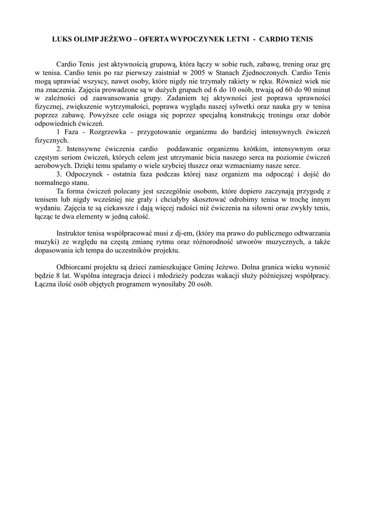 LUKS OLIMP JEŻEWO – OFERTA WYPOCZYNEK LETNI - CARDIO TENIS Cardio Tenis jest aktywnością grupową, która łączy w sobie ruch, zabawę, trening oraz grę w tenisa. Cardio tenis po raz pierwszy zaistniał w 2005 w Stanach Zjednoczonych. Cardio Tenis mogą uprawiać wszyscy, nawet osoby, które nigdy nie trzymały rakiety w ręku. Również wiek nie ma znaczenia. Zajęcia prowadzone są w dużych grupach od 6 do 10 osób, trwają od 60 do 90 minut w zależności od zaawansowania grupy. Zadaniem tej aktywności jest poprawa sprawności fizycznej, zwiększenie wytrzymałości, poprawa wyglądu naszej sylwetki oraz nauka gry w tenisa poprzez zabawę. Powyższe cele osiąga się poprzez specjalną konstrukcję treningu oraz dobór odpowiednich ćwiczeń. 1 Faza - Rozgrzewka - przygotowanie organizmu do bardziej intensywnych ćwiczeń fizycznych. 2. Intensywne ćwiczenia cardio poddawanie organizmu krótkim, intensywnym oraz częstym seriom ćwiczeń, których celem jest utrzymanie bicia naszego serca na poziomie ćwiczeń aerobowych. Dzięki temu spalamy o wiele szybciej tłuszcz oraz wzmacniamy nasze serce. 3. Odpoczynek - ostatnia faza podczas której nasz organizm ma odpocząć i dojść do normalnego stanu. Ta forma ćwiczeń polecany jest szczególnie osobom, które dopiero zaczynają przygodę z tenisem lub nigdy wcześniej nie grały i chciałyby skosztować odrobimy tenisa w trochę innym wydaniu. Zajęcia te są ciekawsze i dają więcej radości niż ćwiczenia na siłowni oraz zwykły tenis, łącząc te dwa elementy w jedną całość. Instruktor tenisa współpracować musi z dj-em, (który ma prawo do publicznego odtwarzania muzyki) ze względu na częstą zmianę rytmu oraz różnorodność utworów muzycznych, a także dopasowania ich tempa do uczestników projektu. Odbiorcami projektu są dzieci zamieszkujące Gminę Jeżewo. Dolna granica wieku wynosić będzie 8 lat. Wspólna integracja dzieci i młodzieży podczas wakacji służy późniejszej współpracy. Łączna ilość osób objętych programem wynosiłaby 20 osób.