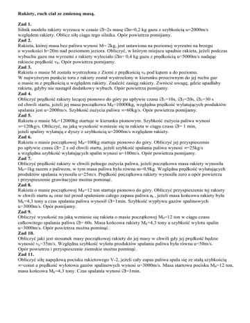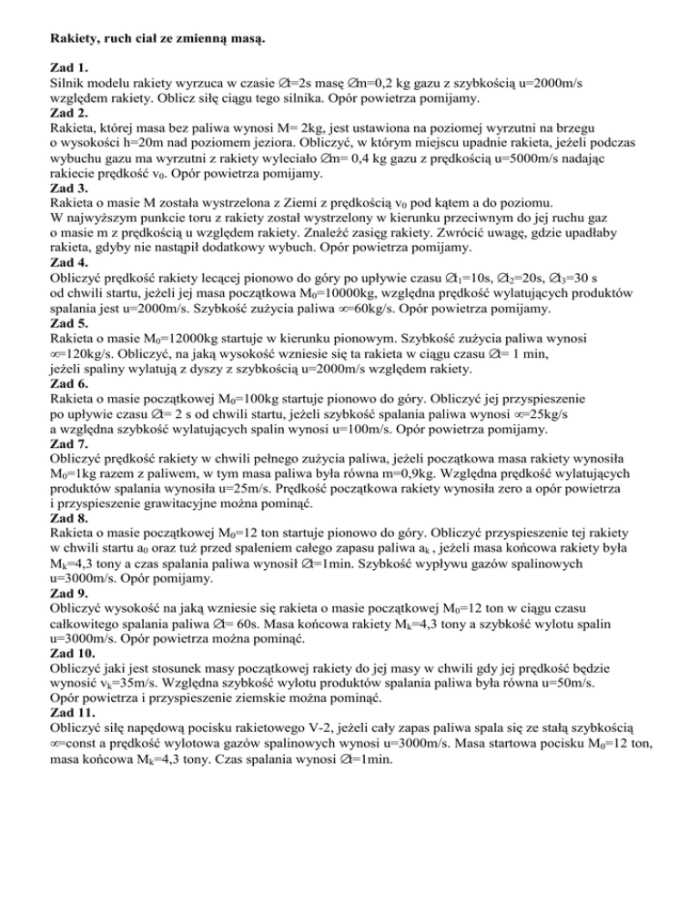 Rakiety, ruch ciał ze zmienną masą. Zad 1. Silnik modelu rakiety wyrzuca w czasie ∆t=2s masę ∆m=0,2 kg gazu z szybkością u=2000m/s względem rakiety. Oblicz siłę ciągu tego silnika. Opór powietrza pomijamy. Zad 2. Rakieta, której masa bez paliwa wynosi M= 2kg, jest ustawiona na poziomej wyrzutni na brzegu o wysokości h=20m nad poziomem jeziora. Obliczyć, w którym miejscu upadnie rakieta, jeŜeli podczas wybuchu gazu ma wyrzutni z rakiety wyleciało ∆m= 0,4 kg gazu z prędkością u=5000m/s nadając rakiecie prędkość v0. Opór powietrza pomijamy. Zad 3. Rakieta o masie M została wystrzelona z Ziemi z prędkością v0 pod kątem a do poziomu. W najwyŜszym punkcie toru z rakiety został wystrzelony w kierunku przeciwnym do jej ruchu gaz o masie m z prędkością u względem rakiety. Znaleźć zasięg rakiety. Zwrócić uwagę, gdzie upadłaby rakieta, gdyby nie nastąpił dodatkowy wybuch. Opór powietrza pomijamy. Zad 4. Obliczyć prędkość rakiety lecącej pionowo do góry po upływie czasu ∆t1=10s, ∆t2=20s, ∆t3=30 s od chwili startu, jeŜeli jej masa początkowa M0=10000kg, względna prędkość wylatujących produktów spalania jest u=2000m/s. Szybkość zuŜycia paliwa µ=60kg/s. Opór powietrza pomijamy. Zad 5. Rakieta o masie M0=12000kg startuje w kierunku pionowym. Szybkość zuŜycia paliwa wynosi µ=120kg/s. Obliczyć, na jaką wysokość wzniesie się ta rakieta w ciągu czasu ∆t= 1 min, jeŜeli spaliny wylatują z dyszy z szybkością u=2000m/s względem rakiety. Zad 6. Rakieta o masie początkowej M0=100kg startuje pionowo do góry. Obliczyć jej przyspieszenie po upływie czasu ∆t= 2 s od chwili startu, jeŜeli szybkość spalania paliwa wynosi µ=25kg/s a względna szybkość wylatujących spalin wynosi u=100m/s. Opór powietrza pomijamy. Zad 7. Obliczyć prędkość rakiety w chwili pełnego zuŜycia paliwa, jeŜeli początkowa masa rakiety wynosiła M0=1kg razem z paliwem, w tym masa paliwa była równa m=0,9kg. Względna prędkość wylatujących produktów spalania wynosiła u=25m/s. Prędkość początkowa rakiety wynosiła zero a opór powietrza i przyspieszenie grawitacyjne moŜna pominąć. Zad 8. Rakieta o masie początkowej M0=12 ton startuje pionowo do góry. Obliczyć przyspieszenie tej rakiety w chwili startu a0 oraz tuŜ przed spaleniem całego zapasu paliwa ak , jeŜeli masa końcowa rakiety była Mk=4,3 tony a czas spalania paliwa wynosił ∆t=1min. Szybkość wypływu gazów spalinowych u=3000m/s. Opór pomijamy. Zad 9. Obliczyć wysokość na jaką wzniesie się rakieta o masie początkowej M0=12 ton w ciągu czasu całkowitego spalania paliwa ∆t= 60s. Masa końcowa rakiety Mk=4,3 tony a szybkość wylotu spalin u=3000m/s. Opór powietrza moŜna pominąć. Zad 10. Obliczyć jaki jest stosunek masy początkowej rakiety do jej masy w chwili gdy jej prędkość będzie wynosić vk=35m/s. Względna szybkość wylotu produktów spalania paliwa była równa u=50m/s. Opór powietrza i przyspieszenie ziemskie moŜna pominąć. Zad 11. Obliczyć siłę napędową pocisku rakietowego V-2, jeŜeli cały zapas paliwa spala się ze stałą szybkością µ=const a prędkość wylotowa gazów spalinowych wynosi u=3000m/s. Masa startowa pocisku M0=12 ton, masa końcowa Mk=4,3 tony. Czas spalania wynosi ∆t=1min.