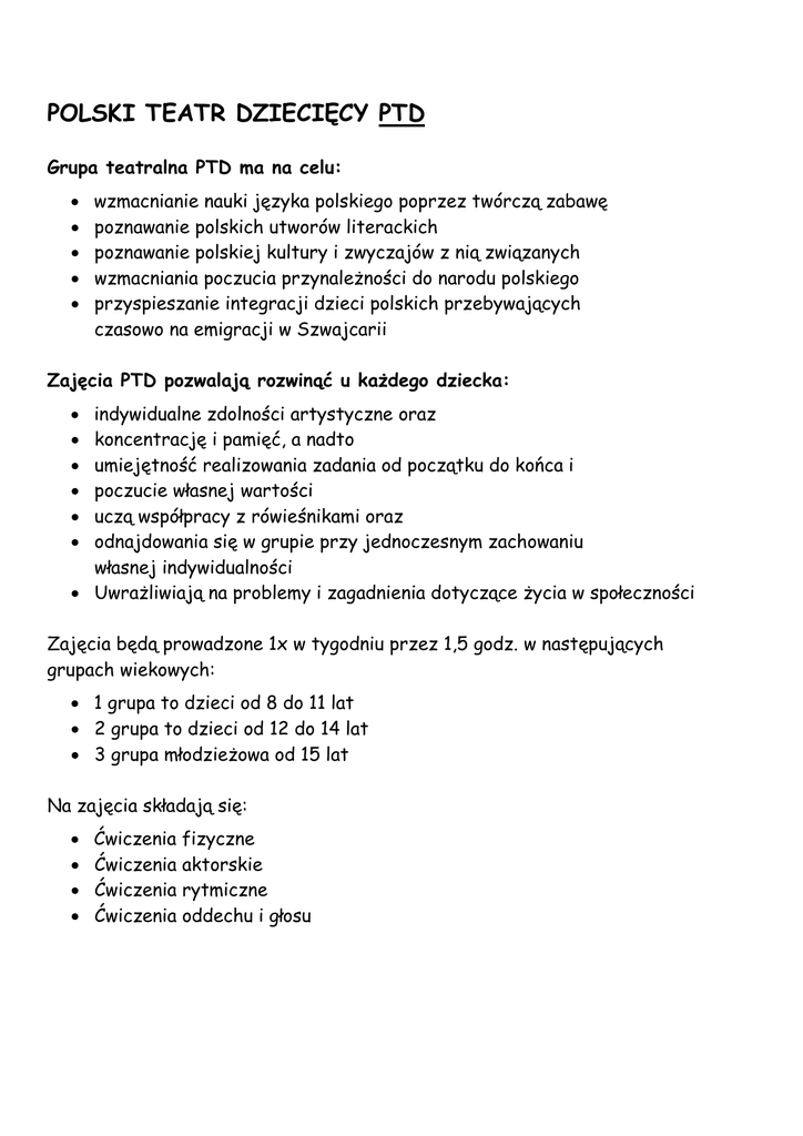 POLSKI TEATR DZIECIĘCY PTD Grupa teatralna PTD ma na celu: • • • • • wzmacnianie nauki języka polskiego poprzez twórczą zabawę poznawanie polskich utworów literackich poznawanie polskiej kultury i zwyczajów z nią związanych wzmacniania poczucia przynależności do narodu polskiego przyspieszanie integracji dzieci polskich przebywających czasowo na emigracji w Szwajcarii Zajęcia PTD pozwalają rozwinąć u każdego dziecka: indywidualne zdolności artystyczne oraz koncentrację i pamięć, a nadto umiejętność realizowania zadania od początku do końca i poczucie własnej wartości uczą współpracy z rówieśnikami oraz odnajdowania się w grupie przy jednoczesnym zachowaniu własnej indywidualności • Uwrażliwiają na problemy i zagadnienia dotyczące życia w społeczności • • • • • • Zajęcia będą prowadzone 1x w tygodniu przez 1,5 godz. w następujących grupach wiekowych: • 1 grupa to dzieci od 8 do 11 lat • 2 grupa to dzieci od 12 do 14 lat • 3 grupa młodzieżowa od 15 lat Na zajęcia składają się: • • • • Ćwiczenia fizyczne Ćwiczenia aktorskie Ćwiczenia rytmiczne Ćwiczenia oddechu i głosu PROGRAM ZAJĘĆ Grupa 1: Zajęcia 1,5 godzinne 1x na tydzień, podczas których dzieci będą wystawione na: 10 minut rozgrzewki ruchowo-głosowej: są to zajęcia rytmiczne, dzieci naśladują różne maszyny wydając przy tym różne dźwięki. 30 minut pracy nad nowym utworem: czytanie na głos, interpretacja i zrozumienie tekstu. Na każdych zajęciach będzie czytany na głos krótki utwór literacki (głównie wiersz, czasem piosenka, albo fragment prozy). Następnie interpretacja nowo poznanego tekstu : - słowna (dzieci omawiają o czym jest tekst i co zrozumiały) - przedstawiają tekst ruchowo, bez slow. (zajęcia z mimiki) 10 minut przerwy 10 minut improwizacji ruchowo-głosowej: dzieci bawią się w naśladowanie zwierząt lub osób. dostają hasło np. afrykańskie zwierzę i poprzez wczucie się, dzieci próbują się poruszać, wydawać dźwięki i patrzeć jak wybrane przez nich zwierze. 30 minut pracy nad spektaklem teatralnym: interpretacja i uczenie się na pamięć. Wcześniej wybrany utwór (sztuka teatralna) będzie przedstawiony na koniec semestru. 1 semestr: dla rodziny i znajomych tzw. małe przedstawienie 2 semestr: na tej samej zasadzie odbywać się będzie praca nad dużym spektaklem finałowym. W obu przypadkach dzieci grają z podziałem na role, których stopniowo i systematycznie uczą się na pamięć. GRUPA 2 i 3 Program zajęć ma bardzo podobny schemat interpretację tekstu zamiast pracy nad ciałem. z większym naciskiem na Uwagi ogólne: Każda grupa może składać się maksymalnie z 12 dzieci. W miarę potrzeb istnieje możliwość częstszych spotkań, a także rozwinięcia formuły zajęć, o czym uczestnicy zostaną poinformowani po wspólnym ustaleniu konkretnych dat lub godzin. Zajęcia prowadzić będzie zawodowa aktorka Anna Pilipiec Kawęcka. Doświadczenie w pracy z dziećmi: ostatnio przygotowała 3 przedstawienia z grupą dzieci z Polskiej Szkoły w Lozannie (rok szkolny 2007-2008) Niniejszy program przygotowała Anna Pilipiec Kawęcka