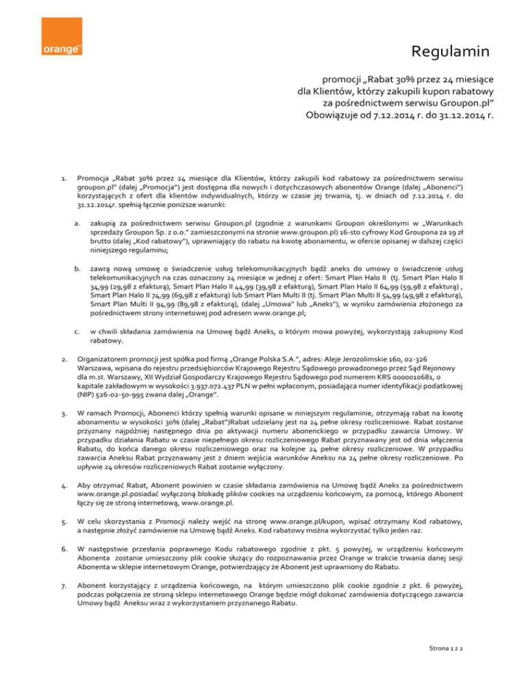 Regulamin promocji „Rabat 30% przez 24 miesiące dla Klientów, którzy zakupili kupon rabatowy za pośrednictwem serwisu Groupon.pl” Obowiązuje od 7.12.2014 r. do 31.12.2014 r. 1. Promocja „Rabat 30% przez 24 miesiące dla Klientów, którzy zakupili kod rabatowy za pośrednictwem serwisu groupon.pl” (dalej „Promocja”) jest dostępna dla nowych i dotychczasowych abonentów Orange (dalej „Abonenci”) korzystających z ofert dla klientów indywidualnych, którzy w czasie jej trwania, tj. w dniach od 7.12.2014 r. do 31.12.2014r. spełnią łącznie poniższe warunki: a. zakupią za pośrednictwem serwisu Groupon.pl (zgodnie z warunkami Groupon określonymi w „Warunkach sprzedaży Groupon Sp. z o.o.” zamieszczonymi na stronie www.groupon.pl) 16-sto cyfrowy Kod Groupona za 19 zł brutto (dalej „Kod rabatowy”), uprawniający do rabatu na kwotę abonamentu, w ofercie opisanej w dalszej części niniejszego regulaminu; b. zawrą nową umowę o świadczenie usług telekomunikacyjnych bądź aneks do umowy o świadczenie usług telekomunikacyjnych na czas oznaczony 24 miesiące w jednej z ofert: Smart Plan Halo II (tj. Smart Plan Halo II 34,99 (29,98 z efakturą), Smart Plan Halo II 44,99 (39,98 z efakturą), Smart Plan Halo II 64,99 (59,98 z efakturą) , Smart Plan Halo II 74,99 (69,98 z efakturą) lub Smart Plan Multi II (tj. Smart Plan Multi II 54,99 (49,98 z efakturą), Smart Plan Multi II 94,99 (89,98 z efakturą), (dalej „Umowa” lub „Aneks”), w wyniku zamówienia złożonego za pośrednictwem strony internetowej pod adresem www.orange.pl; c. w chwili składania zamówienia na Umowę bądź Aneks, o którym mowa powyżej, wykorzystają zakupiony Kod rabatowy. 2. Organizatorem promocji jest spółka pod firmą „Orange Polska S.A.”, adres: Aleje Jerozolimskie 160, 02-326 Warszawa, wpisana do rejestru przedsiębiorców Krajowego Rejestru Sądowego prowadzonego przez Sąd Rejonowy dla m.st. Warszawy, XII Wydział Gospodarczy Krajowego Rejestru Sądowego pod numerem KRS 0000010681, o kapitale zakładowym w wysokości 3.937.072.437 PLN w pełni wpłaconym, posiadająca numer identyfikacji podatkowej (NIP) 526-02-50-995 zwana dalej „Orange”. 3. W ramach Promocji, Abonenci którzy spełnią warunki opisane w niniejszym regulaminie, otrzymają rabat na kwotę abonamentu w wysokości 30% (dalej „Rabat”)Rabat udzielany jest na 24 pełne okresy rozliczeniowe. Rabat zostanie przyznany najpóźniej następnego dnia po aktywacji numeru abonenckiego w przypadku zawarcia Umowy. W przypadku działania Rabatu w czasie niepełnego okresu rozliczeniowego Rabat przyznawany jest od dnia włączenia Rabatu, do końca danego okresu rozliczeniowego oraz na kolejne 24 pełne okresy rozliczeniowe. W przypadku zawarcia Aneksu Rabat przyznawany jest z dniem wejścia warunków Aneksu na 24 pełne okresy rozliczeniowe. Po upływie 24 okresów rozliczeniowych Rabat zostanie wyłączony. 4. Aby otrzymać Rabat, Abonent powinien w czasie składania zamówienia na Umowę bądź Aneks za pośrednictwem www.orange.pl.posiadać wyłączoną blokadę plików cookies na urządzeniu końcowym, za pomocą, którego Abonent łączy się ze stroną internetową, www.orange.pl. 5. W celu skorzystania z Promocji należy wejść na stronę www.orange.pl/kupon, wpisać otrzymany Kod rabatowy, a następnie złożyć zamówienie na Umowę bądź Aneks. Kod rabatowy można wykorzystać tylko jeden raz. 6. W następstwie przesłania poprawnego Kodu rabatowego zgodnie z pkt. 5 powyżej, w urządzeniu końcowym Abonenta zostanie umieszczony plik cookie służący do rozpoznawania przez Orange w trakcie trwania danej sesji Abonenta w sklepie internetowym Orange, potwierdzający że Abonent jest uprawniony do Rabatu. 7. Abonent korzystający z urządzenia końcowego, na którym umieszczono plik cookie zgodnie z pkt. 6 powyżej, podczas połączenia ze stroną sklepu internetowego Orange będzie mógł dokonać zamówienia dotyczącego zawarcia Umowy bądź Aneksu wraz z wykorzystaniem przyznanego Rabatu. Strona 1 z 2 8. Kod rabatowy jest ważny do momentu złożenia zamówienia dotyczącego zawarcia Umowy bądź Aneksu, ale nie dłużej niż do 31.12.2014 r. 9. Plik cookie, o którym mowa w pkt. 6, pozostaje ważny do czasu złożenia pierwszego zamówienia dotyczącego zawarcia Umowy bądź zawarcia Aneksu, ale nie dłużej niż do 31.12.2014r. Orange informuje, że w przypadku korzystania z urządzeń końcowych, do których dostęp ma więcej niż jeden użytkownik, Abonent w razie zakończenia połączenia ze sklepem internetowym Orange bez złożenia zamówienia, może usunąć pliki cookies umieszczone wskutek przesłania Kodu rabatowego i następnie ponownie wpisać ten sam Kod rabatowy przy ponownym połączeniu się ze stroną www.orange.pl/kupon. W przeciwnym wypadku Rabat może wykorzystać inny użytkownik urządzenia końcowego, na którym umieszczony jest plik cookie. Orange nie odpowiada wobec Abonenta za skorzystanie z Rabatu przez innego użytkownika urządzenia końcowego w sposób określony w niniejszym punkcie. 10. Wysokość Rabatu nie zmienia wysokości ulgi udzielonej przez Orange Abonentowi i nie wpływa na wysokość kar umownych w przypadku wypowiedzenia przez Abonenta z jego winy Umowy bądź Aneksu przed upływem okresu, na który zostały zawarte. 11. Do procedury składania i realizowania zamówień w sklepie internetowym Orange stosuje się Regulamin zakupów w Sklepie internetowym Orange. 12. W pozostałym zakresie stosuje się: Regulamin promocji w ofertach Smart Plan Halo II Smart Plan Multi II Smart Plan Multi II Max Smart Plan Mix II; Cennik usług w ofertach Smart Plan Halo II Smart Plan Multi II Smart Plan Multi II Max Smart Plan Mix II; Regulamin sprzedaży ratalnej; Cennik produktów na raty dla abonentów Smart Plan Halo II, Smart Plan Multi II, Smart Plan Multi II Max, Smart Plan Mix II, Orange Free Net; Ogólne warunki świadczenia usług telekomunikacyjnych w 