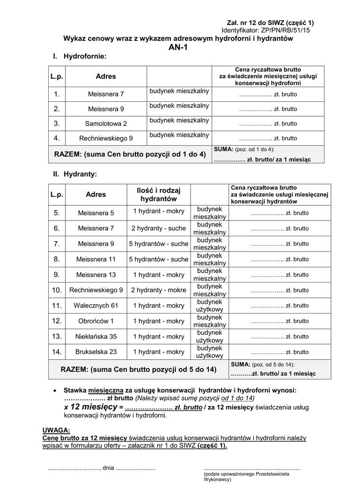 Zał. nr 12 do SIWZ (część 1) Identyfikator: ZP/PN/RB/51/15 Wykaz cenowy wraz z wykazem adresowym hydroforni i hydrantów AN-1 I. Hydrofornie: L.p. Adres 1. Meissnera 7 2. Meissnera 9 3. Samolotowa 2 4. Rechniewskiego 9 Cena ryczałtowa brutto za świadczenie miesięcznej usługi konserwacji hydroforni budynek mieszkalny …………….. zł. brutto budynek mieszkalny …………….. zł. brutto budynek mieszkalny …………….. zł. brutto budynek mieszkalny …………….. zł. brutto RAZEM: (suma Cen brutto pozycji od 1 do 4) SUMA: (poz. od 1 do 4): ……………. zł. brutto/ za 1 miesiąc II. Hydranty: L.p. 5. Adres budynek mieszkalny budynek Meissnera 7 2 hydranty - suche mieszkalny budynek Meissnera 9 5 hydrantów - suche mieszkalny budynek Meissnera 11 5 hydrantów - suche mieszkalny budynek Meissnera 13 1 hydrant - mokry mieszkalny budynek Rechniewskiego 9 2 hydranty - mokre mieszkalny budynek Walecznych 61 1 hydrant - mokry użytkowy budynek Obrońców 1 1 hydrant - mokry mieszkalny budynek Niekłańska 35 1 hydrant - mokry użytkowy budynek Brukselska 23 1 hydrant - mokry użytkowy Meissnera 5 6. 7. 8. 9. 10. 11. 12. 13. 14. Cena ryczałtowa brutto za świadczenie usługi miesięcznej konserwacji hydrantów Ilość i rodzaj hydrantów 1 hydrant - mokry RAZEM: (suma Cen brutto pozycji od 5 do 14) …………….. zł. brutto …………….. zł. brutto …………….. zł. brutto …………….. zł. brutto …………….. zł. brutto …………….. zł. brutto …………….. zł. brutto …………….. zł. brutto …………….. zł. brutto …………….. zł. brutto SUMA: (poz. od 5 do 14): ..………zł. brutto/ za 1 miesiąc Stawka miesięczna za usługę konserwacji hydrantów i hydroforni wynosi: ………………. zł brutto (Należy wpisać sumę pozycji od 1 do 14) x 12 miesięcy = …………………. zł. brutto / za 12 miesięcy świadczenia usług konserwacji hydrantów i hydroforni. UWAGA: Cenę brutto za 12 miesięcy świadczenia usług konserwacji hydrantów i hydroforni należy wpisać w formularzu oferty – załącznik nr 1 do SIWZ (część 1). ..............................., dnia ........................ .......................................................... (podpis upoważnionego Przedstawiciela Wykonawcy) Zał. nr 12 do SIWZ (część 2) Identyfikator: ZP/PN/RB/51/15 Wykaz cenowy wraz z wykazem adresowym hydroforni AN-5 I. Hydrofornie: L.p. Adres 1. Grochowska 302 Cena ryczałtowa brutto za świadczenie usługi miesięcznej konserwacji hydroforni budynek mieszkalny …………….. zł. brutto/ za 1 miesiąc II. Hydranty: Brak Stawka miesięczna za usługę konserwacji hydroforni wynosi: ………………. zł brutto (Należy wpisać cenę z poz. nr 1) x 12 miesięcy = …………………. zł. brutto / za 12 miesięcy świadczenia usług konserwacji hydroforni. UWAGA: Cenę brutto za 12 miesięcy świadczenia usług konserwacji hydroforni należy wpisać w formularzu oferty – załącznik nr 1 do SIWZ (część 2). ..............................., dnia ........................ .......................................................... (podpis upoważnionego Przedstawiciela Wykonawcy)
