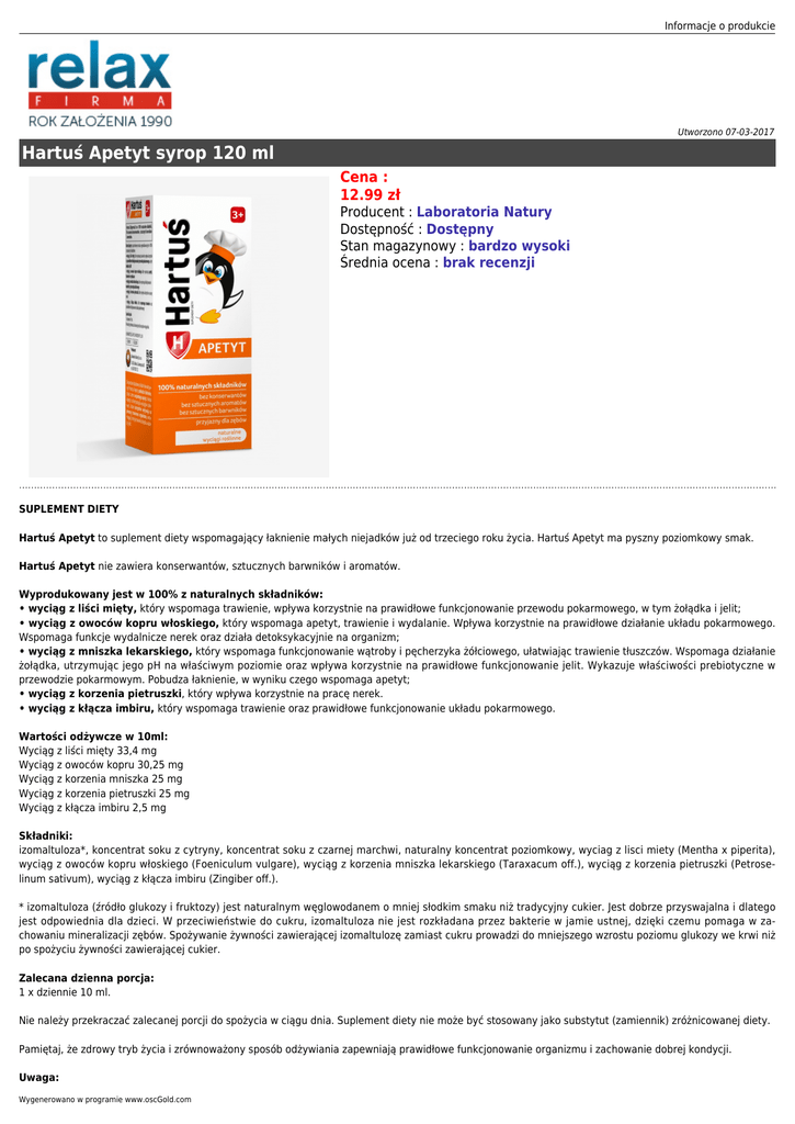 Informacje o produkcie Utworzono 07-03-2017 Hartuś Apetyt syrop 120 ml Cena : 12.99 zł Producent : Laboratoria Natury Dostępność : Dostępny Stan magazynowy : bardzo wysoki Średnia ocena : brak recenzji SUPLEMENT DIETY Hartuś Apetyt to suplement diety wspomagający łaknienie małych niejadków już od trzeciego roku życia. Hartuś Apetyt ma pyszny poziomkowy smak. Hartuś Apetyt nie zawiera konserwantów, sztucznych barwników i aromatów. Wyprodukowany jest w 100% z naturalnych składników: • wyciąg z liści mięty, który wspomaga trawienie, wpływa korzystnie na prawidłowe funkcjonowanie przewodu pokarmowego, w tym żołądka i jelit; • wyciąg z owoców kopru włoskiego, który wspomaga apetyt, trawienie i wydalanie. Wpływa korzystnie na prawidłowe działanie układu pokarmowego. Wspomaga funkcje wydalnicze nerek oraz działa detoksykacyjnie na organizm; • wyciąg z mniszka lekarskiego, który wspomaga funkcjonowanie wątroby i pęcherzyka żółciowego, ułatwiając trawienie tłuszczów. Wspomaga działanie żołądka, utrzymując jego pH na właściwym poziomie oraz wpływa korzystnie na prawidłowe funkcjonowanie jelit. Wykazuje właściwości prebiotyczne w przewodzie pokarmowym. Pobudza łaknienie, w wyniku czego wspomaga apetyt; • wyciąg z korzenia pietruszki, który wpływa korzystnie na pracę nerek. • wyciąg z kłącza imbiru, który wspomaga trawienie oraz prawidłowe funkcjonowanie układu pokarmowego. Wartości odżywcze w 10ml: Wyciąg z liści mięty 33,4 mg Wyciąg z owoców kopru 30,25 mg Wyciąg z korzenia mniszka 25 mg Wyciąg z korzenia pietruszki 25 mg Wyciąg z kłącza imbiru 2,5 mg Składniki: izomaltuloza*, koncentrat soku z cytryny, koncentrat soku z czarnej marchwi, naturalny koncentrat poziomkowy, wyciag z lisci miety (Mentha x piperita), wyciąg z owoców kopru włoskiego (Foeniculum vulgare), wyciąg z korzenia mniszka lekarskiego (Taraxacum off.), wyciąg z korzenia pietruszki (Petroselinum sativum), wyciąg z kłącza imbiru (Zingiber off.). * izomaltuloza (źródło glukozy i fruktozy) jest naturalnym węglowodanem o mniej słodkim smaku niż tradycyjny cukier. Jest dobrze przyswajalna i dlatego jest odpowiednia dla dzieci. W przeciwieństwie do cukru, izomaltuloza nie jest rozkładana przez bakterie w jamie ustnej, dzięki czemu pomaga w zachowaniu mineralizacji zębów. Spożywanie żywności zawierającej izomaltulozę zamiast cukru prowadzi do mniejszego wzrostu poziomu glukozy we krwi niż po spożyciu żywności zawierającej cukier. Zalecana dzienna porcja: 1 x dziennie 10 ml. Nie należy przekraczać zalecanej porcji do spożycia w ciągu dnia. Suplement diety nie może być stosowany jako substytut (zamiennik) zróżnicowanej diety. Pamiętaj, że zdrowy tryb życia i zrównoważony sposób odżywiania zapewniają prawidłowe funkcjonowanie organizmu i zachowanie dobrej kondycji. Uwaga: Wygenerowano w programie www.oscGold.com Produkt nie powinien być stosowany przez osoby uczulone na którykolwiek z jego składników. Preparat może być spożywany przez wegetarian i wegan. Produkt może zawierać osuszacz – nie spożywać. Przechowywanie: Chronić przed bezpośrednim działaniem promieni słonecznych. Przechowywać w sposób niedostępny dla małych dzieci. Producent / Podmiot odpowiedzialny: Laboratoria Natury Sp. z o .o. ul. Zawieprzycka 8D 20-228 Lublin Opakowanie: 120ml