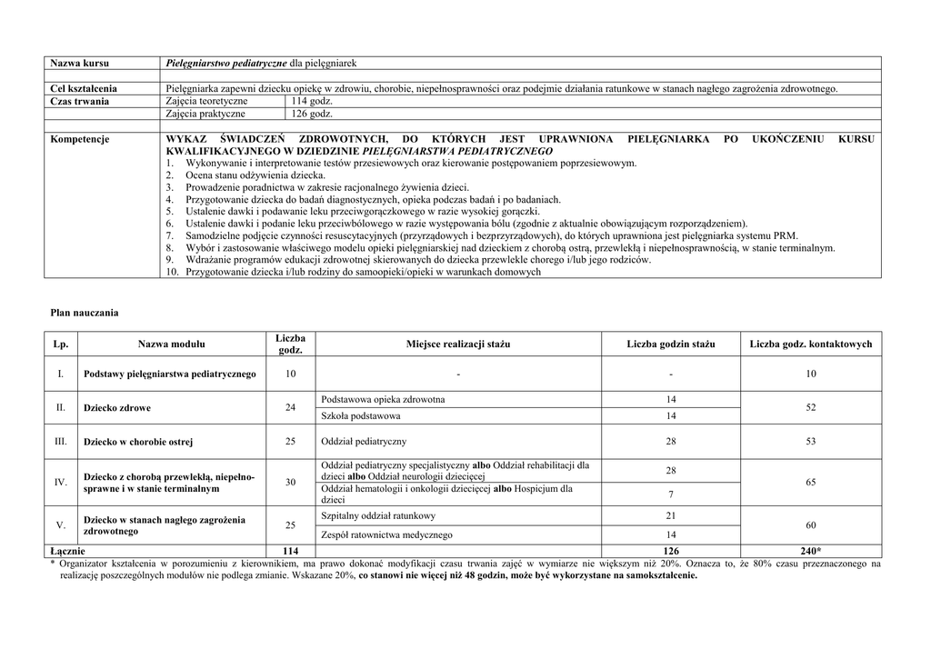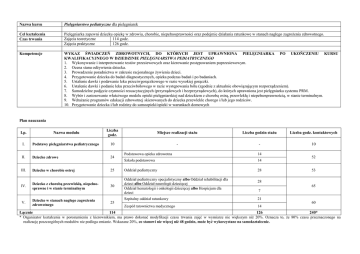 Nazwa kursu Pielęgniarstwo pediatryczne dla pielęgniarek Cel kształcenia Czas trwania Pielęgniarka zapewni dziecku opiekę w zdrowiu, chorobie, niepełnosprawności oraz podejmie działania ratunkowe w stanach nagłego zagrożenia zdrowotnego. Zajęcia teoretyczne 114 godz. Zajęcia praktyczne 126 godz. Kompetencje WYKAZ ŚWIADCZEŃ ZDROWOTNYCH, DO KTÓRYCH JEST UPRAWNIONA PIELĘGNIARKA PO UKOŃCZENIU KURSU KWALIFIKACYJNEGO W DZIEDZINIE PIELĘGNIARSTWA PEDIATRYCZNEGO 1. Wykonywanie i interpretowanie testów przesiewowych oraz kierowanie postępowaniem poprzesiewowym. 2. Ocena stanu odżywienia dziecka. 3. Prowadzenie poradnictwa w zakresie racjonalnego żywienia dzieci. 4. Przygotowanie dziecka do badań diagnostycznych, opieka podczas badań i po badaniach. 5. Ustalenie dawki i podawanie leku przeciwgorączkowego w razie wysokiej gorączki. 6. Ustalenie dawki i podanie leku przeciwbólowego w razie występowania bólu (zgodnie z aktualnie obowiązującym rozporządzeniem). 7. Samodzielne podjęcie czynności resuscytacyjnych (przyrządowych i bezprzyrządowych), do których uprawniona jest pielęgniarka systemu PRM. 8. Wybór i zastosowanie właściwego modelu opieki pielęgniarskiej nad dzieckiem z chorobą ostrą, przewlekłą i niepełnosprawnością, w stanie terminalnym. 9. Wdrażanie programów edukacji zdrowotnej skierowanych do dziecka przewlekle chorego i/lub jego rodziców. 10. Przygotowanie dziecka i/lub rodziny do samoopieki/opieki w warunkach domowych Plan nauczania Lp. Nazwa modułu Liczba godz. Miejsce realizacji stażu Liczba godzin stażu Liczba godz. kontaktowych I. Podstawy pielęgniarstwa pediatrycznego 10 - - 10 II. Dziecko zdrowe 24 III. Dziecko w chorobie ostrej IV. V. Podstawowa opieka zdrowotna 14 Szkoła podstawowa 14 25 Oddział pediatryczny 28 Dziecko z chorobą przewlekłą, niepełnosprawne i w stanie terminalnym 30 Oddział pediatryczny specjalistyczny albo Oddział rehabilitacji dla dzieci albo Oddział neurologii dziecięcej Oddział hematologii i onkologii dziecięcej albo Hospicjum dla dzieci Dziecko w stanach nagłego zagrożenia zdrowotnego 25 Łącznie 114 52 53 28 65 7 Szpitalny oddział ratunkowy 21 Zespół ratownictwa medycznego 14 60 126 240* * Organizator kształcenia w porozumieniu z kierownikiem, ma prawo dokonać modyfikacji czasu trwania zajęć w wymiarze nie większym niż 20%. Oznacza to, że 80% czasu przeznaczonego na realizację poszczególnych modułów nie podlega zmianie. Wskazane 20%, co stanowi nie więcej niż 48 godzin, może być wykorzystane na samokształcenie.