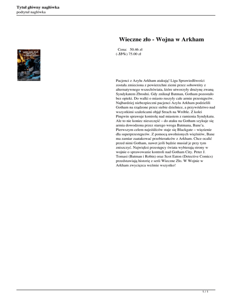 Tytuł główny nagłówka podtytuł nagłówka Wieczne zło - Wojna w Arkham Cena: 50.46 zł (-33%) 75.00 zł Pacjenci z Azylu Arkham atakują! Liga Sprawiedliwości została zmieciona z powierzchni ziemi przez sobowtóry z alternatywnego wszechświata, które utworzyły drużynę zwaną Syndykatem Zbrodni. Gdy zniknął Batman, Gotham pozostało bez opieki. Do walki o miasto ruszyły całe armie przestępców. Najbardziej niebezpieczni pacjenci Azylu Arkham podzielili Gotham na rządzone przez siebie dzielnice, a przywództwo nad wszystkimi szaleńcami objął Strach na Wróble. Z kolei Pingwin sprawuje kontrolę nad miastem z ramienia Syndykatu. Ale to nie koniec nieszczęść – do ataku na Gotham szykuje się armia dowodzona przez starego wroga Batmana, Bane’a. Pierwszym celem najeźdźców staje się Blackgate – więzienie dla superprzestępców. Z pomocą uwolnionych więźniów, Bane ma zamiar zaatakować przebierańców z Arkham. Chce ocalić przed nimi Gotham, nawet jeśli będzie musiał je przy tym zniszczyć. Najwięksi przestępcy świata wybierają strony w wojnie o sprawowanie kontroli nad Gotham City. Peter J. Tomasi (Batman i Robin) oraz Scot Eaton (Detective Comics) przedstawiają historię z serii Wieczne Zło. W Wojnie w Arkham zwycięzca weźmie wszystko! 1/1 Powered by TCPDF (www.tcpdf.org)