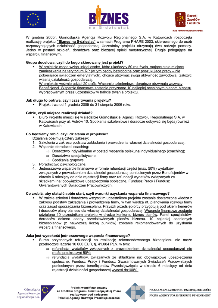 W grudniu 2005r. Górnośląska Agencja Rozwoju Regionalnego S.A. w Katowicach rozpoczęła realizację projektu "Biznes na 5-dziesiąt” w ramach Programu PHARE 2003, skierowanego do osób rozpoczynających działalność gospodarczą. Uczestnicy projektu otrzymają dwa rodzaje pomocy. Jedno w postaci szkoleń, doradztwa oraz bieżącej opieki merytorycznej. Drugie polegające na wsparciu finansowym. Grupa docelowa, czyli do kogo skierowany jest projekt? § W projekcie mogą wziąć udział osoby, które ukończyły 50 rok życia, mające stałe miejsce zamieszkania na terytorium RP (w tym osoby bezrobotne oraz poszukujące pracy – nie pobierające świadczeń emerytalnych), chcące utrzymać swoją aktywność zawodową i założyć własną działalność gospodarczą. W projekcie weźmie udział 20 osób. Wsparcie szkoleniowo-doradcze otrzymają wszyscy Beneficjenci. Wsparcie finansowe zostanie przyznane 10 najlepiej ocenionym planom biznesu wypracowanym przez uczestników w trakcie trwania projektu. Jak długo to potrwa, czyli czas trwania projektu? § Projekt trwa od 1 grudnia 2005 do 31 sierpnia 2006 roku. Gdzie, czyli miejsce realizacji działań? § Biuro Projektu mieści się w siedzibie Górnośląskiej Agencji Rozwoju Regionalnego S.A. w Katowicach przy ul. Astrów 10. Spotkania szkoleniowe i doradcze odbywać się będą również w Katowicach. Co będziemy robić, czyli działania w projekcie? Działania obejmują cztery zakresy: 1. Szkolenia z zakresu podstaw zakładania i prowadzenia własnej działalności gospodarczej. 2. Wsparcie doradcze i coaching: ⇒ Doradztwo indywidualne w postaci wsparcia opiekuna indywidualnego (coaching); ⇒ Doradztwo specjalistyczne; ⇒ Spotkania grupowe. 3. Poradnictwo psychologiczne. 4. Jednorazowe wsparcie finansowe w formie refundacji części (max. 50%) wydatków związanych z prowadzeniem działalności gospodarczej poniesionych przez Beneficjentów w okresie 6 miesięcy od dnia rejestracji firmy oraz refundacji wydatków związanych ze składkami na: obowiązkowe ubezpieczenia społeczne, Fundusz Pracy i Fundusz Gwarantowanych Świadczeń Pracowniczych. Co zrobić, aby ułatwić sobie start, czyli warunki uzyskania wsparcia finansowego? § W trakcie szkoleń i doradztwa wszystkim uczestnikom projektu zostanie dostarczona wiedza z zakresu podstaw zakładania i prowadzenia firmy, w tym wiedza nt. planowania rozwoju firmy oraz zasad sporządzania biznesplanu. Przyszli przedsiębiorcy przygotują pod okiem trenerów i doradców plany biznesu dla własnej działalności gospodarczej. Wsparcie finansowe zostanie udzielone 10 uczestnikom projektu w drodze konkursu biznes planów. Panel specjalistówdoradców dokona oceny przedstawionych planów biznesu. 10 najlepiej ocenionych biznesplanów (z najwyższą liczbą punktów) zostanie rekomendowanych do uzyskania wsparcia finansowego. Jaka jest wysokość jednorazowego wsparcia finansowego? § Suma przyznanych refundacji na realizację rekomendowanego biznesplanu nie może przekroczyć łącznie 10 000 EUR, tj. 41.084 PLN, w tym: ⇒ refundacja wydatków związanych z prowadzeniem działalności gospodarczej nie może przekroczyć 50%; ⇒ refundacja wydatków, związanych ze składkami na: obowiązkowe ubezpieczenia społeczne, Fundusz Pracy i Fundusz Gwarantowanych Świadczeń Pracowniczych poniesionych przez beneficjentów Przedsięwzięcia w okresie 6 miesięcy od dnia rejestracji działalności gospodarczej wynosi do100%. Projekt współfinansowany ze środków programu Unii Europejskiej Phare realizowany pod nadzorem Polskiej Agencji Rozwoju Przedsiębiorczości § W przypadku uczestników, którzy nie są płatnikami podatku VAT refundacja dotyczy wydatków brutto. W takim przypadku Beneficjent (uczestnik) zobowiązany jest do złożenia do GARR S.A. stosownego oświadczenia o kwalifikowalności podatku VAT na etapie podpisywania umowy o wypłatę i rozliczanie jednorazowego wsparcia. § Wypłata wsparcia finansowego nastąpi na rachunek bankowy uczestnika na podstawie umowy zawartej z GARR S.A. określającej główne warunki wypłaty i zasady dotyczące rozliczenia jednorazowego wsparcia. Co mogę kupić, czyli przeznaczenie wsparcia finansowego projektu? § Wsparcie finansowe w formie refundacji wydatków związanych z prowadzeniem działalności gospodarczej poniesionych przez uczestnika projektu w okresie 6 miesięcy od dnia rejestracji firmy dotyczy: ⇒ zakupu środków trwałych oraz wartości niematerialnych i prawnych, ⇒ ubezpieczenia zakupionych środków trwałych od: kradzieży, ognia, i innych zdarzeń losowych, ⇒ wynajmu pomieszczeń, ⇒ działań promocyjnych, ⇒ zakupu artykułów biurowych, ⇒ opłat związanych z rejestracją działalności gospodarczej. Uwaga: Refundacja nie może przekroczyć 50% wysokości ww. wydatków. § Refundacja wydatków, związanych ze składkami na: obowiązkowe ubezpieczenia społeczne, Fundusz Pracy i Fundusz Gwarantowanych Świadczeń Pracowniczych, poniesionych przez uczestnika w okresie 6 miesięcy od dnia rejestracji działalności gospodarczej. Uwaga: refundacja może obejmować do 100% wysokości ww. wydatków. Co i kiedy, czyli harmonogram działań? § STYCZEŃ 2006 - rekrutacja uczestników projektu, wybór grupy § LUTY 2006 – szkolenia, rozpoczęcie wsparcia w formie doradztwa i coachingu, wsparcie psychologiczne § KWIECIEŃ/MAJ 2006 – planowany termin założenia firm przez uczestników projektu § KWIECIEŃ 2006 – konkurs biznes planów § MAJ 2006 – planowany termin udzielania wsparcia finansowego dla rekomendowanych planó biznesu § ...... – dalszy ciąg wsparcia w formie doradztwa i coachingu, spotkania grupowe, wymiana doświadczeń § SIERPIEŃ 2006 – zakończenie projektu Jestem zainteresowany. Co zrobić żeby się zapisać? 1. Wypełnić formularz zgłoszeniowy i odesłać go do Biura Projektu na adres [email protected] 2. Czekać na kontakt ze strony Biura Projektu. 3. Weryfikacja zgłoszeń,
