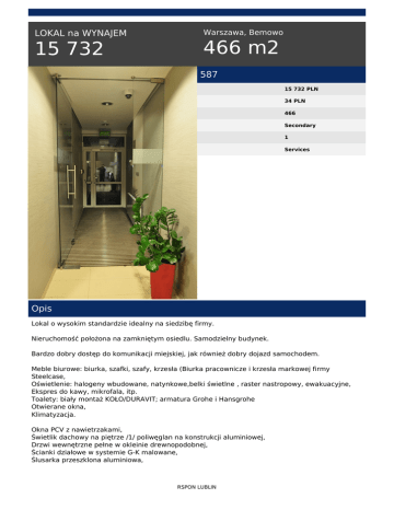LOKAL na WYNAJEM 15 732 Warszawa, Bemowo 466 m2 587 15 732 PLN 34 PLN 466 Secondary 1 Services Opis Lokal o wysokim standardzie idealny na siedzibę firmy. Nieruchomość położona na zamkniętym osiedlu. Samodzielny budynek. Bardzo dobry dostęp do komunikacji miejskiej, jak również dobry dojazd samochodem. Meble biurowe: biurka, szafki, szafy, krzesła (Biurka pracownicze i krzesła markowej firmy Steelcase, Oświetlenie: halogeny wbudowane, natynkowe,belki świetlne , raster nastropowy, ewakuacyjne, Ekspres do kawy, mikrofala, itp. Toalety: biały montaż KOŁO/DURAVIT; armatura Grohe i Hansgrohe Otwierane okna, Klimatyzacja. Okna PCV z nawietrzakami, Świetlik dachowy na piętrze /1/ poliwęglan na konstrukcji aluminiowej, Drzwi wewnętrzne pełne w okleinie drewnopodobnej, Ścianki działowe w systemie G-K malowane, Ślusarka przeszklona aluminiowa, RSPON LUBLIN Wykładzina dywanowa Posadzka klatki schodowej wyłożona gresem w formacie 30x30, Sufity mineralne podwieszane Ecophon. Zaplecze konferencyjno - sanitarne Poziom: -1 Pokój spotkań 3 os. WC z prysznicem, pomieszczenie socjalne Parter: Sala 10 os.Toaleta dla niepełnosprawnych Piętro: Sala 4 os.;Kuchnia/ pomieszczenie socjalne, toaleta damska i męska Instalacje Elektryczna i teletechniczna, Wodociąg z sieci, Ogrzewanie centralne, Hydrantowa, Kanalizacja sanitarna, Kanalizacja deszczowa, Kanalizacja ogólnospławna, Fotowoltaiczna, Serwerownia 4 szafy Data Center Bezpieczeństwo Całodobowa ochrona, Monitoring, System alarmowy, System ochrony przeciwpożarowej, Kontrola dostępu. Ilość miejsc garażowych/ parkingowych 7 miejsc garażowych w budynku przy ul. Zeusa poziom -1 8 miejsc garażowych w budynku przy ul. Hery poziom -1 20 miejsc parkingowych naziemnych na parkingu przy ul. Hery Opłaty czynsz 8 euro/m2 opłata eksploatacyjna: 2,5 euro/m2 garaż 75 EUR/jedno miejsce garażowe parking 25 EUR/jedno miejsce parkingowe. Dostępne od już. tel. 501 000 454; 881 353 100 email: [email protected] RSPON LUBLIN Powered by TCPDF (www.tcpdf.org)