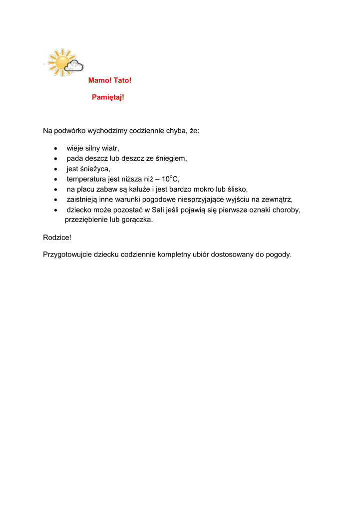 Mamo! Tato! Pamiętaj! Na podwórko wychodzimy codziennie chyba, że: wieje silny wiatr, pada deszcz lub deszcz ze śniegiem, jest śnieżyca, temperatura jest niższa niż – 10oC, na placu zabaw są kałuże i jest bardzo mokro lub ślisko, zaistnieją inne warunki pogodowe niesprzyjające wyjściu na zewnątrz, dziecko może pozostać w Sali jeśli pojawią się pierwsze oznaki choroby, przeziębienie lub gorączka. Rodzice! Przygotowujcie dziecku codziennie kompletny ubiór dostosowany do pogody.