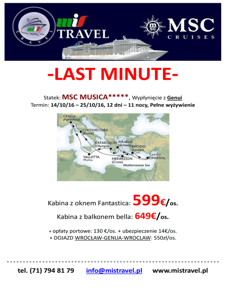 -LAST MINUTEStatek: MSC MUSICA*****, Wypłynięcie z Genui Termin: 14/10/16 – 25/10/16, 12 dni – 11 nocy, Pełne wyżywienie Kabina z oknem Fantastica: 599€/ os. Kabina z balkonem bella: 649€/os. + opłaty portowe: 130 €/os. + ubezpieczenie 14€/os. + DOJAZD WROCŁAW-GENUA-WROCLAW: 550zł/os. ------------------------------------------------------------------ tel. (71) 794 81 79 [email protected] www.mistravel.pl Program rejsu: Dzień Data Program rejsu Wpłynięcie Wypłynięcie 1 Pt.14.10. GENOA, ITALY --- 17:00 2 So. 15.10. AT SEA --- --- 3 Nd.16.10. VALLETTA, MALTA 07:00 14:00 4 Pon. 17.10. KATAKOLON, GREECE 10:00 17:00 5 Wt. 18.10. PIREUS, GREECE 07:30 18:30 6 Śr. 19.10. AT SEA --- --- 7 Czw. 20.10. LIMASSOL, CYPRUS 08:00 16:00 8 Pt. 21.10. RHODES, GREECE 09:00 17:00 9 So. 22.10 HERAKLION, GREECE 08:00 14:00 10 Nd. 23.10 AT SEA --- --- 11 Pon. 24.10 CIVITAVECCHIA, ITALY 09:00 19:00 12 Wt. 25.10 GENOA, ITALY 08:00 Kraje, które odwiedzisz: WŁOCHY – MALTA – GRECJA - CYPR ***** Cruising to nowy sposób zwiedzania świata, niezapomniane wakacje, wspaniała przygoda i mnóstwo atrakcji. Takiej rozrywki nie dostarczy żadna wycieczka czy typowe wczasy. Będąc na statku oglądamy świat z innej perspektywy, odkrywamy wiele ciekawych miejsc, do których nie dotarlibyśmy wykupując tradycyjny pobyt w hotelu. Podczas snu w swoim wygodnym apartamencie, statek przeniesie Cię w nowe miejsce, które zobaczysz i poznasz już o poranku. Wszystko to w standardzie luksusowego 5-gwiazdkowego hotelu, który zadowoli gusta nawet najbardziej wymagającego Klienta. Na pokładzie znajdziesz baseny, kasyna, teatry, kina 4D, galerie handlowe, pola minigolfa oraz wiele innych niezwykłych atrakcji… Cena obejmuje: 12-dniowy rejs statkiem MSC MUSICA – zakwaterowanie w kabinie wybranej kategorii (11 noclegów); serwis bagażowy i kabinowy; wyżywienie – 3 główne posiłki, podwieczorek, bufet i przekąski o północy; korzystanie z basenu i innych urządzeo sportoworekreacyjnych; udział we wszystkich imprezach organizowanych na statku. Cena nie obejmuje: wycieczek fakultatywnych w trakcie rejsu; korzystania z punktów usługowych na statku (fotograf, pralnia, SPA, Internet); napojów gazowanych i alkoholowych zamawianych w barach i do posiłków; obowiązkowych napiwków dla obsługi statku (pasażerowie pow. 14 r.ż. – 9 €/dobę/os., dzieci w wieku 2-13 lat– 4,50 €/dobę/os.). Istnieje możliwośd wykupienia pakietu ALL INCLUSIVE: 26 €/dzieo/os. dorosłą, dzieci od 3 r.ż. – 12 €/dzieo. ------------------------------------------------------------------ tel. (71) 794 81 79 [email protected] www.mistravel.pl