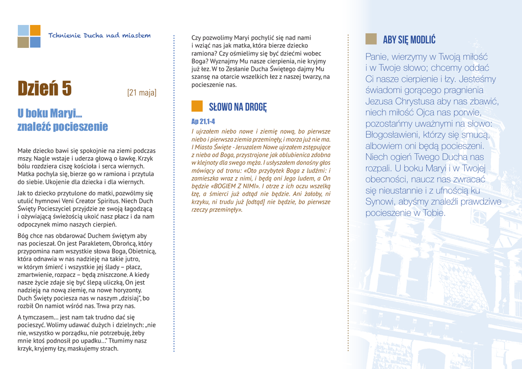 Tchnienie Ducha nad miastem Dzień 5 [21 maja] U boku Maryi… znaleźć pocieszenie Małe dziecko bawi się spokojnie na ziemi podczas mszy. Nagle wstaje i uderza głową o ławkę. Krzyk bólu rozdziera ciszę kościoła i serca wiernych. Matka pochyla się, bierze go w ramiona i przytula do siebie. Ukojenie dla dziecka i dla wiernych. Jak to dziecko przytulone do matki, pozwólmy się utulić hymnowi Veni Creator Spiritus. Niech Duch Święty Pocieszyciel przyjdzie ze swoją łagodzącą i ożywiającą świeżością ukoić nasz płacz i da nam odpoczynek mimo naszych cierpień. Bóg chce nas obdarować Duchem świętym aby nas pocieszał. On jest Parakletem, Obrońcą, który przypomina nam wszystkie słowa Boga, Obietnicą, która odnawia w nas nadzieję na takie jutro, w którym śmierć i wszystkie jej ślady – płacz, zmartwienie, rozpacz – będą zniszczone. A kiedy nasze życie zdaje się być ślepą uliczką, On jest nadzieją na nową ziemię, na nowe horyzonty. Duch Święty pociesza nas w naszym „dzisiaj”, bo rozbił On namiot wśród nas. Trwa przy nas. A tymczasem… jest nam tak trudno dać się pocieszyć. Wolimy udawać dużych i dzielnych: „nie nie, wszystko w porządku, nie potrzebuję, żeby mnie ktoś podnosił po upadku…” Tłumimy nasz krzyk, kryjemy łzy, maskujemy strach. Czy pozwolimy Maryi pochylić się nad nami i wziąć nas jak matka, która bierze dziecko ramiona? Czy ośmielimy się być dziećmi wobec Boga? Wyznajmy Mu nasze cierpienia, nie kryjmy już łez. W to Zesłanie Ducha Świętego dajmy Mu szansę na otarcie wszelkich łez z naszej twarzy, na pocieszenie nas. JJ Słowo na drogę Ap 21,1-4 I ujrzałem niebo nowe i ziemię nową, bo pierwsze niebo i pierwsza ziemia przeminęły, i morza już nie ma. I Miasto Święte - Jeruzalem Nowe ujrzałem zstępujące z nieba od Boga, przystrojone jak oblubienica zdobna w klejnoty dla swego męża. I usłyszałem donośny głos mówiący od tronu: «Oto przybytek Boga z ludźmi: i zamieszka wraz z nimi, i będą oni Jego ludem, a On będzie «BOGIEM Z NIMI». I otrze z ich oczu wszelką łzę, a śmierci już odtąd nie będzie. Ani żałoby, ni krzyku, ni trudu już [odtąd] nie będzie, bo pierwsze rzeczy przeminęły». JJ Aby się modlić Panie, wierzymy w Twoją miłość i w Twoje słowo; chcemy oddać Ci nasze cierpienie i łzy. Jesteśmy świadomi gorącego pragnienia Jezusa Chrystusa aby nas zbawić, niech miłość Ojca nas porwie, pozostańmy uważnymi na słowo: Błogosławieni, którzy się smucą, albowiem oni będą pocieszeni. Niech ogień Twego Ducha nas rozpali. U boku Maryi i w Twojej obecności, naucz nas zwracać się nieustannie i z ufnością ku Synowi, abyśmy znaleźli prawdziwe pocieszenie w Tobie.
