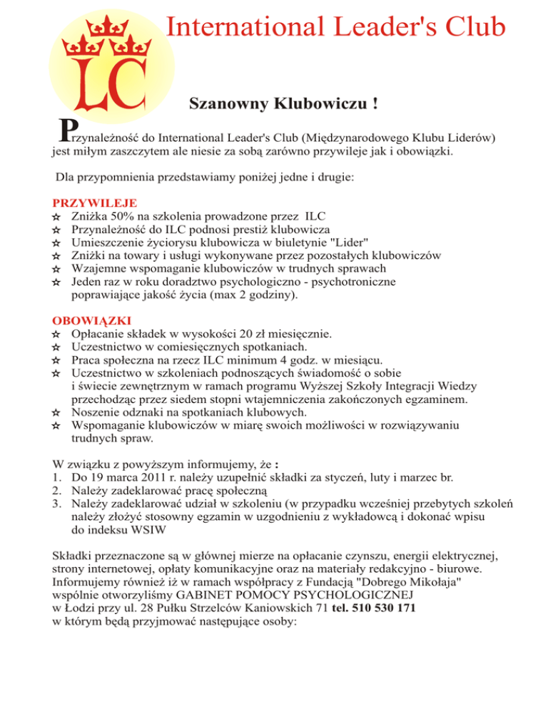 International Leader's Club Szanowny Klubowiczu ! P rzynależność do International Leader's Club (Międzynarodowego Klubu Liderów) jest miłym zaszczytem ale niesie za sobą zarówno przywileje jak i obowiązki. Dla przypomnienia przedstawiamy poniżej jedne i drugie: PRZYWILEJE Zniżka 50% na szkolenia prowadzone przez ILC Przynależność do ILC podnosi prestiż klubowicza Umieszczenie życiorysu klubowicza w biuletynie "Lider" Zniżki na towary i usługi wykonywane przez pozostałych klubowiczów Wzajemne wspomaganie klubowiczów w trudnych sprawach Jeden raz w roku doradztwo psychologiczno - psychotroniczne poprawiające jakość życia (max 2 godziny). OBOWIĄZKI Opłacanie składek w wysokości 20 zł miesięcznie. Uczestnictwo w comiesięcznych spotkaniach. Praca społeczna na rzecz ILC minimum 4 godz. w miesiącu. Uczestnictwo w szkoleniach podnoszących świadomość o sobie i świecie zewnętrznym w ramach programu Wyższej Szkoły Integracji Wiedzy przechodząc przez siedem stopni wtajemniczenia zakończonych egzaminem. Noszenie odznaki na spotkaniach klubowych. Wspomaganie klubowiczów w miarę swoich możliwości w rozwiązywaniu trudnych spraw. W związku z powyższym informujemy, że : 1. Do 19 marca 2011 r. należy uzupełnić składki za styczeń, luty i marzec br. 2. Należy zadeklarować pracę społeczną 3. Należy zadeklarować udział w szkoleniu (w przypadku wcześniej przebytych szkoleń należy złożyć stosowny egzamin w uzgodnieniu z wykładowcą i dokonać wpisu do indeksu WSIW Składki przeznaczone są w głównej mierze na opłacanie czynszu, energii elektrycznej, strony internetowej, opłaty komunikacyjne oraz na materiały redakcyjno - biurowe. Informujemy również iż w ramach współpracy z Fundacją "Dobrego Mikołaja" wspólnie otworzyliśmy GABINET POMOCY PSYCHOLOGICZNEJ w Łodzi przy ul. 28 Pułku Strzelców Kaniowskich 71 tel. 510 530 171 w którym będą przyjmować następujące osoby: 1. Dorota Mlostoń Coachin (doradztwo psychologiczno-pedagogiczne) konsultacje dla dorosłych, rodziców, dzieci i młodzieży 2. Zbigniew Kocik Doradztwo psychologiczne Diagnoza zdrowia i problemów życiowych 3. Emma Kocik Przeciwdziałanie uzależnieniom Przeciwdziałanie stanom depresyjnym Profilaktyka chorób psychosomatycznym 4. Marek Łyp Doradztwo psychologiczne Homeopatia 5. Grażyna Tichanów Doradztwo rodzinne 6. Sylwester Barcicki Ekstrasens - odpowiada trafnie na pytania dotyczące problemów życiowych 7. Dariusz Skowroński Masarzysta - doradca życiowy 8. Krzysztof Donart Kręglarz - masarzysta, doradztwo partnerskie, spółki 9. Jarosław Gronert Doradztwo astrologiczne, prognozowanie 10. Katarzyna Kieszkowska Psycholog - terapeuta. Terapie indywidualne par i rodzin 11. Maria Pirog Doradztwo przy pomocy Szkatułki Szczęścia 12. Józe Onoszko Doradztwo życiowe (zdrowie, partnerstwo, biznes) SERDECZNIE ZAPRASZAMY KLUBOWICZÓW na coroczną uroczystość związaną z nadchodzącą wiosną i jubileuszowo- imieninowymi dniami naszych klubowiczów. Uroczystość odbędzie się w lokalu klubowym w Łodzi ul. 28 Pułku Strzelców Kaniowskich 71 Ipiętro w dniu 18 marca 2011 roku o godz. 18.oo PROGRAM SPOTKANIA 1. Wystąpienie Józefa Onoszko nt."W jedności siła przed wydarzeniami 2012 roku" 2. Życzenia dla jubilatów i solenizantów - wpis do "Wielkiej Karty" 3. Pokaz zdjęć z Wigilii 2010 roku oraz z Brukseli i Antwerpii 4. Pokaz i interpretacja testów Johana 5. Nadanie Honorowych Członkostw 6. Uroczyste przyjęcie nowych członków ILC. 7. Aukcja nietypowych przedmiotów i obrazów 8. Recital Anny Cymmerman 9. Część rozrywkowo-taneczna Składka na konsumpcję 30 zł, alkohol we własnym zakresie 16 -20 12 - 16 Dorota Mlostoń Poniedziałek Sylwester Barcicki Darek Skowroński Wtorek Marek Łyp Środa Piątek Katarzyna Krzysztof Kieszkowska Donart Czwartek Sobota