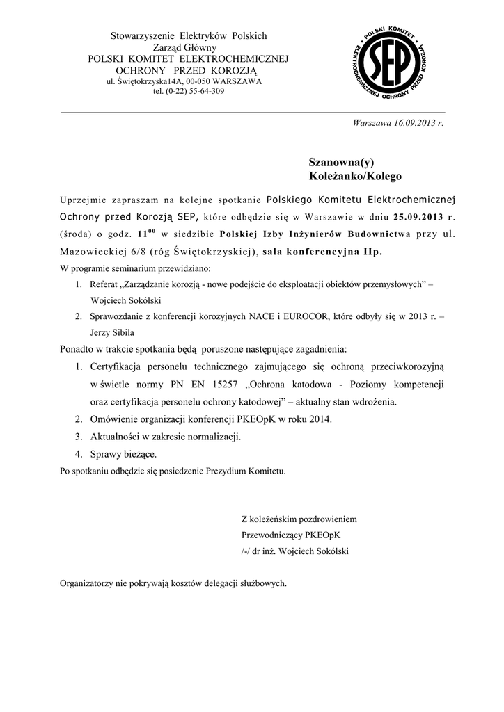 Stowarzyszenie Elektryków Polskich Zarząd Główny POLSKI KOMITET ELEKTROCHEMICZNEJ OCHRONY PRZED KOROZJĄ ul. Świętokrzyska14A, 00-050 WARSZAWA tel. (0-22) 55-64-309 Warszawa 16.09.2013 r. Szanowna(y) KoleŜanko/Kolego Upr zej mie zapras zam na kolej ne spotkanie Polskiego Komitet u Elektrochemicznej Ochrony przed Korozją SEP, które odbędzi e się w Warszawie w dniu 25.09.2013 r. (środa) o godz. 11 0 0 w siedzibie Polskiej Izby InŜynierów Budow nictwa przy ul. Mazowieckiej 6/8 (róg Świętokrz yskiej), sala konferencyjna IIp. W programie seminarium przewidziano: 1. Referat „Zarządzanie korozją - nowe podejście do eksploatacji obiektów przemysłowych” – Wojciech Sokólski 2. Sprawozdanie z konferencji korozyjnych NACE i EUROCOR, które odbyły się w 2013 r. – Jerzy Sibila Ponadto w trakcie spotkania będą poruszone następujące zagadnienia: 1. Certyfikacja personelu technicznego zajmującego się ochroną przeciwkorozyjną w świetle normy PN EN 15257 „Ochrona katodowa - Poziomy kompetencji oraz certyfikacja personelu ochrony katodowej” – aktualny stan wdroŜenia. 2. Omówienie organizacji konferencji PKEOpK w roku 2014. 3. Aktualności w zakresie normalizacji. 4. Sprawy bieŜące. Po spotkaniu odbędzie się posiedzenie Prezydium Komitetu. Z koleŜeńskim pozdrowieniem Przewodniczący PKEOpK /-/ dr inŜ. Wojciech Sokólski Organizatorzy nie pokrywają kosztów delegacji słuŜbowych.