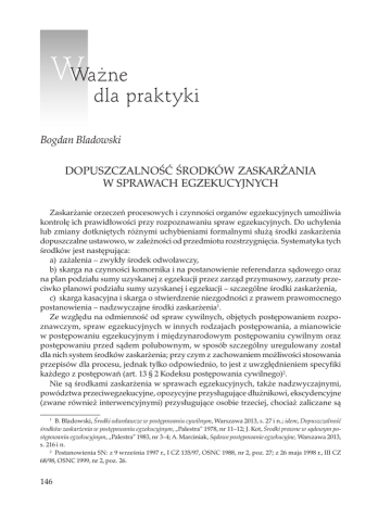 WWażne dla praktyki Bogdan Bladowski Dopuszczalność środków zaskarżania w sprawach egzekucyjnych Zaskarżanie orzeczeń procesowych i czynności organów egzekucyjnych umożliwia kontrolę ich prawidłowości przy rozpoznawaniu spraw egzekucyjnych. Do uchylenia lub zmiany dotkniętych różnymi uchybieniami formalnymi służą środki zaskarżenia dopuszczalne ustawowo, w zależności od przedmiotu rozstrzygnięcia. Systematyka tych środków jest następująca: a) zażalenia – zwykły środek odwoławczy, b)skarga na czynności komornika i na postanowienie referendarza sądowego oraz na plan podziału sumy uzyskanej z egzekucji przez zarząd przymusowy, zarzuty przeciwko planowi podziału sumy uzyskanej i egzekucji – szczególne środki zaskarżenia, c) skarga kasacyjna i skarga o stwierdzenie niezgodności z prawem prawomocnego postanowienia – nadzwyczajne środki zaskarżenia. Ze względu na odmienność od spraw cywilnych, objętych postępowaniem rozpoznawczym, spraw egzekucyjnych w innych rodzajach postępowania, a mianowicie w postępowaniu egzekucyjnym i międzynarodowym postępowaniu cywilnym oraz postępowaniu przed sądem polubownym, w sposób szczególny uregulowany został dla nich system środków zaskarżenia; przy czym z zachowaniem możliwości stosowania przepisów dla procesu, jednak tylko odpowiednio, to jest z uwzględnieniem specyfiki każdego z postępowań (art. 13 § 2 Kodeksu postępowania cywilnego). Nie są środkami zaskarżenia w sprawach egzekucyjnych, także nadzwyczajnymi, powództwa przeciwegzekucyjne, opozycyjne przysługujące dłużnikowi, ekscydencyjne (zwane również interwencyjnymi) przysługujące osobie trzeciej, chociaż zaliczane są B. Bladowski, Środki odwoławcze w postępowaniu cywilnym, Warszawa 2013, s. 27 i n.; idem, Dopuszczalność środków zaskarżenia w postępowaniu egzekucyjnym, „Palestra” 1978, nr 11–12; J. Kot, Środki prawne w sądowym postępowaniu egzekucyjnym, „Palestra” 1983, nr 3–4; A. Marciniak, Sądowe postępowanie egzekucyjne, Warszawa 2013, s. 216 i n. Postanowienia SN: z 9 września 1997 r., I CZ 135/97, OSNC 1988, nr 2, poz. 27; z 26 maja 1998 r., III CZ 68/98, OSNC 1999, nr 2, poz. 26. 146 5–6/2014 Dopuszczalność środków zaskarżania... do środków prawnych w tych sprawach, jako niweczące skutki prawomocnego orzeczenia, a więc służące do merytorycznej obrony przed egzekucją, nie można natomiast za ich pomocą dochodzić zmiany czy uchylenia czynności egzekucyjnych sprzecznych z przepisami (art. 840–841 k.p.c.). Są to w istocie samoistne powództwa o ustalenie stosunku prawnego lub prawa. Nie podlega natomiast zaskarżeniu samo uzasadnienie rozstrzygnięcia, jego funkcją jest bowiem wyjaśnienie treści sentencji (art. 328 § 2 k.p.c.). Gdy na przykład zaskarżenie postanowienia oddalającego wniosek zmierza w istocie do wzruszenia rozstrzygnięcia przez uzyskanie do instancji odwoławczej innego, korzystniejszego dla skarżącego uzasadnienia, zaskarżanie w takim wypadku jest fikcją, która nie może uzyskać aprobaty sądu. Środki zaskarżenia są dopuszczalne tylko w celu zmiany lub sprostowania sentencji orzeczenia. Zgodnie z zasadą procesową wyłączności Kodeks nie przewiduje możliwości zbiegu (konkurencji) środków zaskarżenia, w którym wybór między nimi – gdy prowadzą do tego samego celu – pozostawiony byłby skarżącemu. Jeżeli w danym zakresie dopuszczalny jest jeden środek zaskarżenia, to tym samym wykluczony jest inny. W razie wniesienia od określonego orzeczenia kilku środków zaskarżenia przez poszczególnych uczestników wszystkie zostaną rozpoznane w jednym postępowaniu w instancji odwoławczej. Wątpliwości mogą powstać co do czynności sądowych w razie wniesienia dwóch takich samych środków zaskarżenia od określonego orzeczenia przez stronę i jej pełnomocnika procesowego wskutek braku porozumienia się ich. Sąd Najwyższy uznał za możliwe potraktowanie tak wniesionych obu środków zaskarżenia jako jednego, jeżeli złożone zostały w terminie. Przyjmuje się od dawna w doktrynie i judykaturze, że nie podlegają zaskarżeniu orzeczenia nieistniejące (sententia non existens). W znaczeniu faktycznym – gdy na przykład sąd nie rozstrzygnął sprawy w części dotyczącej przedmiotu objętego zaskarżeniem. W znaczeniu prawnym – gdy orzeczenie nie ma tzw. elementów konstytutywnych, jeśli na przykład wydane zostało przez osobę lub zespół osób niereprezentujących władzy sądowej albo nie zostało podpisane przez skład orzekający, bądź wydane na posiedzeniu jawnym, nie zostało ogłoszone. Przeciwstawiam się z kolei próbom stosowania analogii z prawa (analogiae legis) przy dopuszczalności środków zaskarżania ze względu na podobieństwo sytuacji procesowej, z czym można się spotkać w piśmiennictwie i judykaturze. Zwłaszcza w sprawach egzekucyjnych dopuszczalność środków zaskarżenia została z reguły dokładnie określona. A. Marciniak, Glosa do postanowienia SN z dnia 8 kwietnia 2001 r., II CKN 1051/99, OSP 2002, nr 6, poz. 84; T. Żyznowski, Komentarz do Kodeksu postępowania cywilnego, t. IV, red. T. Dolecki i T. Wiśniewski, Warszawa 2011, s. 302 i n. Orzeczenie SN z 13 lipca 1981 r., III CRN 11/81, z glosą B. Bladowskiego, „Nowe Prawo” 1982, nr 7–8; T. Ereciński, Kodeks postępowania cywilnego. Komentarz. Postępowanie rozpoznawcze, Warszawa 2012, s. 181. W. Siedlecki, Zaskarżanie orzeczeń sądowych, (w:) System prawa procesowego cywilnego, t. III, Wrocław 1986, s. 38 i n. Wyrok SN z 31 stycznia 1962 r., III CR 524/61, OSNC 1963, nr 3, poz. 66. B. Bladowski, Orzeczenia nie istniejące w cywilnym postępowaniu odwoławczym, „Nowe Prawo” 1991, nr 1–3; K. Markiewicz, Problem sententia non existens na tle orzeczenia Sądu Najwyższego, „Rejent” 2002, nr 11, s. 82 i n. B. Bladowski, Zażalenie w postępowaniu cywilnym, Warszawa 2013, s. 32. 147 Bogdan Bladowski