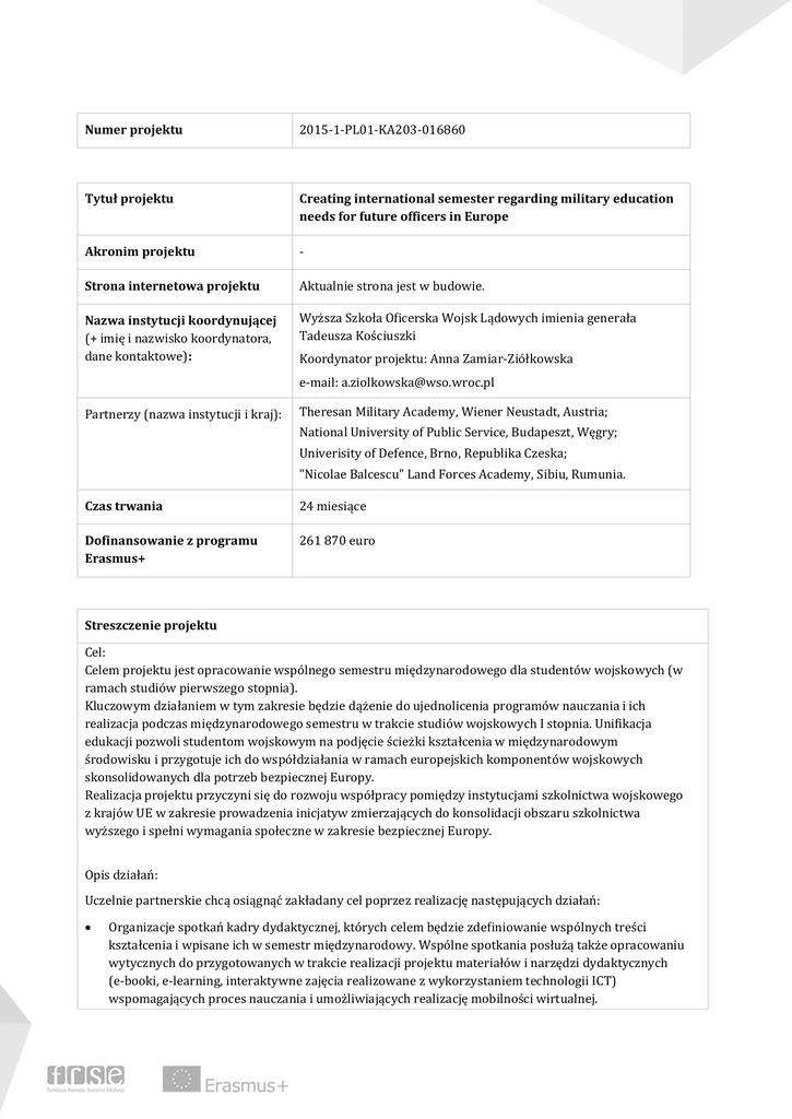 Numer projektu 2015-1-PL01-KA203-016860 Tytuł projektu Creating international semester regarding military education needs for future officers in Europe Akronim projektu - Strona internetowa projektu Aktualnie strona jest w budowie. Nazwa instytucji koordynującej (+ imię i nazwisko koordynatora, dane kontaktowe): Wyższa Szkoła Oficerska Wojsk Lądowych imienia generała Tadeusza Kościuszki Koordynator projektu: Anna Zamiar-Ziółkowska e-mail: [email protected] Partnerzy (nazwa instytucji i kraj): Theresan Military Academy, Wiener Neustadt, Austria; National University of Public Service, Budapeszt, Węgry; Univerisity of Defence, Brno, Republika Czeska; "Nicolae Balcescu" Land Forces Academy, Sibiu, Rumunia. Czas trwania 24 miesiące Dofinansowanie z programu Erasmus+ 261 870 euro Streszczenie projektu Cel: Celem projektu jest opracowanie wspólnego semestru międzynarodowego dla studentów wojskowych (w ramach studiów pierwszego stopnia). Kluczowym działaniem w tym zakresie będzie dążenie do ujednolicenia programów nauczania i ich realizacja podczas międzynarodowego semestru w trakcie studiów wojskowych I stopnia. Unifikacja edukacji pozwoli studentom wojskowym na podjęcie ścieżki kształcenia w międzynarodowym środowisku i przygotuje ich do współdziałania w ramach europejskich komponentów wojskowych skonsolidowanych dla potrzeb bezpiecznej Europy. Realizacja projektu przyczyni się do rozwoju współpracy pomiędzy instytucjami szkolnictwa wojskowego z krajów UE w zakresie prowadzenia inicjatyw zmierzających do konsolidacji obszaru szkolnictwa wyższego i spełni wymagania społeczne w zakresie bezpiecznej Europy. Opis działań: Uczelnie partnerskie chcą osiągnąć zakładany cel poprzez realizację następujących działań: Organizacje spotkań kadry dydaktycznej, których celem będzie zdefiniowanie wspólnych treści kształcenia i wpisane ich w semestr międzynarodowy. Wspólne spotkania posłużą także opracowaniu wytycznych do przygotowanych w trakcie realizacji projektu materiałów i narzędzi dydaktycznych (e-booki, e-learning, interaktywne zajęcia realizowane z wykorzystaniem technologii ICT) wspomagających proces nauczania i umożliwiających realizację mobilności wirtualnej. Opracowanie skonsolidowanego programu kształcenia na studiach I stopnia, realizowanego w trakcie tzw. okienek mobilnościowych z łączną punktacją 30 ECTS oraz z komponentem szkolenia zintegrowanego (realizowanego w projekcie w formie mobilności łączonej i programu intensywnego). Opracowanie materiałów i narzędzi wspomagających proces dydaktyczny w trakcie semestru międzynarodowego. Realizację semestru międzynarodowego – pilotaż. Dodatkowo w projekcie planuje się realizację działań towarzyszących w celu upowszechniania rezultatów pracy intelektualnej zgodnie z ideą całego projektu. Oczekiwane rezultaty: 1. Program międzynarodowego semestru na studiach wojskowych I stopnia. 2. E-booki do przedmiotów określonych w programie międzynarodowego semestru. 3. Narzędzia (pomoce) dydaktyczne wspomagające proces nauczania w ramach międzynarodowego semestru.