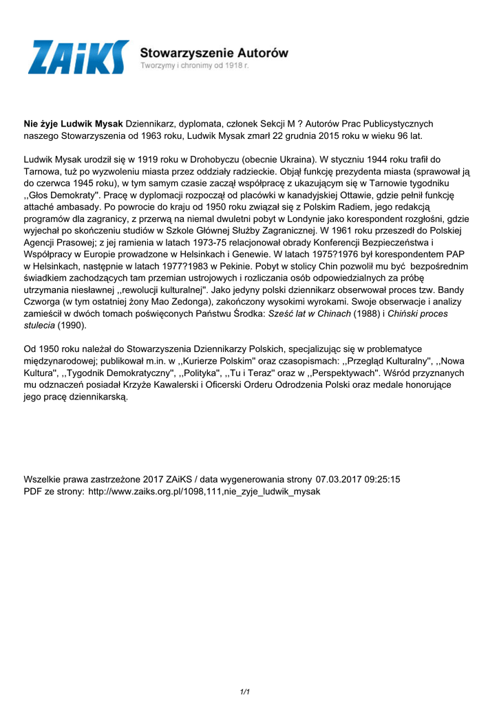 Nie żyje Ludwik Mysak Dziennikarz, dyplomata, członek Sekcji M ? Autorów Prac Publicystycznych naszego Stowarzyszenia od 1963 roku, Ludwik Mysak zmarł 22 grudnia 2015 roku w wieku 96 lat. Ludwik Mysak urodził się w 1919 roku w Drohobyczu (obecnie Ukraina). W styczniu 1944 roku trafił do Tarnowa, tuż po wyzwoleniu miasta przez oddziały radzieckie. Objął funkcję prezydenta miasta (sprawował ją do czerwca 1945 roku), w tym samym czasie zaczął współpracę z ukazującym się w Tarnowie tygodniku ,,Głos Demokraty''. Pracę w dyplomacji rozpoczął od placówki w kanadyjskiej Ottawie, gdzie pełnił funkcję attaché ambasady. Po powrocie do kraju od 1950 roku związał się z Polskim Radiem, jego redakcją programów dla zagranicy, z przerwą na niemal dwuletni pobyt w Londynie jako korespondent rozgłośni, gdzie wyjechał po skończeniu studiów w Szkole Głównej Służby Zagranicznej. W 1961 roku przeszedł do Polskiej Agencji Prasowej; z jej ramienia w latach 1973-75 relacjonował obrady Konferencji Bezpieczeństwa i Współpracy w Europie prowadzone w Helsinkach i Genewie. W latach 1975?1976 był korespondentem PAP w Helsinkach, następnie w latach 1977?1983 w Pekinie. Pobyt w stolicy Chin pozwolił mu być bezpośrednim świadkiem zachodzących tam przemian ustrojowych i rozliczania osób odpowiedzialnych za próbę utrzymania niesławnej ,,rewolucji kulturalnej''. Jako jedyny polski dziennikarz obserwował proces tzw. Bandy Czworga (w tym ostatniej żony Mao Zedonga), zakończony wysokimi wyrokami. Swoje obserwacje i analizy zamieścił w dwóch tomach poświęconych Państwu Środka: Sześć lat w Chinach (1988) i Chiński proces stulecia (1990). Od 1950 roku należał do Stowarzyszenia Dziennikarzy Polskich, specjalizując się w problematyce międzynarodowej; publikował m.in. w ,,Kurierze Polskim'' oraz czasopismach: ,,Przegląd Kulturalny'', ,,Nowa Kultura'', ,,Tygodnik Demokratyczny'', ,,Polityka'', ,,Tu i Teraz'' oraz w ,,Perspektywach''. Wśród przyznanych mu odznaczeń posiadał Krzyże Kawalerski i Oficerski Orderu Odrodzenia Polski oraz medale honorujące jego pracę dziennikarską. Wszelkie prawa zastrzeżone 2017 ZAiKS / data wygenerowania strony 07.03.2017 09:25:15 PDF ze strony: http://www.zaiks.org.pl/1098,111,nie_zyje_ludwik_mysak 1/1