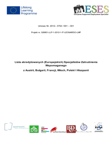 Umowa Nr. 2012– 3752 / 001 – 001 Projekt nr. 526851-LLP-1-2012-1-IT-LEONARDO-LMP Lista akredytowanych (Europejskich) Specjalistów Zatrudnienia Wspomaganego z Austrii, Bułgarii, Francji, Włoch, Polski I Hiszpanii Wprowadzenie I założenia ESES (Designing the Competence Profile of the European Supported Employment Specialist) jest to wielostronny Projekt Leonardo da Vinci finansowany przez Komisję Europejską w ramach programu Lifelong Learning.Głównym celem projektu jest określenie kompetencji i profilu zawodowego Europejskiego Specjalisty Zatrudnienia Wspomaganego zgodnie z wytycznymi Europejskiego Systemu Kredytowego kształceniu i szkoleniu zawodowym (ECVET). Zatrudnienie wspomagane jest jednym z głównych składników nie wyłączającej polityki prowadzonej przez Unię Europejską, a jego skutecznośd opiera się na szerokiej podstawie podejścia charakteryzującego procedur zorientowanych na klienta, jasnych kodeksów postępowania, ukierunkowanych programów zawodowych oraz dynamicznego systemu naprawiane ścieżek zawodowych zarówno na rynku pracy i polityki funkcjonalnego kształcenia ustawicznego Eses ma na celu opracowywania wymagao kompetencyjnych dla Europejskich specjalistów zatrudnienia Wspomaganego(Ses) pracujących z osobami niepełnosprawnymi poszukującymi pracy a tym samym ustanawiając standardy w odniesieniu do kilku aspektów zawodu: certyfikowane szkolenia i ich modernizację, określenie zadao i walidacji umiejętności i wiedzy w krajacg UE. Wzorowany na EUSE (Europejksa Unia Zatrudnienia wspomaganego) i ichstandardy jakości i obserwowalnych praktyk w różnych krajach UE, główne rezultaty projektu to: - Katalog kompetencji wymieniający wszystkie kompetencje (umiejętności, zdolności i wiedzy niezbędnej dla SES) - - Badanie Kontrolne i Szkolenia online mające na celu szkolenia specjalistów Zatrudnienia Wspomaganego w celu poprawy jakości i porównywalności ich ścieżek edukacyjnych - - Akredytacja szkolenia i kompetencji SES w oparciu o ECVET - - Podwaliny przyszłego europejskiego rejestru usługodawców i jakości szkolenia oraz przekwalifikowania SES. W celu zapewnienia trwałości projektu oraz w celu kontynuacji metodologii i rezultatów po zakooczeniu projektu, opracowane zostały wytyczne oraz dokumenty strategiczne do akredytacji zgodnie z ECVET. Następujące produkty są podstawą akredytacji (europejskiego) Specjalisty Zatrudnienie Wspomaganego a 2 także szkolenia opracowanego w czasie trwania projektu: • Dokument strategiczny w jaki sposób rozpocząd Badanie Kontrolne (check-up) i szkolenia na rynku, we współpracy z istniejącymi podmiotami, system akredytacji skierowany dla SES i szkolenia w oparciu o ECVET. • Wytyczne sformułowane w sposób jasny z Programem nauczania dla akredytacji w trakcie Badania Kontrolnego ( Check up) i szkolenia, co daje usługodawców kompletny obraz jak powinny byd skonstruowane szkolenia według standardów ECVET przy organizowaniu kursówczy szkolenia dla SES Dodatkowo do tych dwóch dokumentów akredytacyjnych w każdym kraju uczestniczącym SES musiał przejśd procedurę oceny, która opiera się na programie nauczania Eses (patrz wytyczne do akredytacji). Po krótkim opisie na temat głównych kryteriów akredytowanego SES, pows tała lista SES w każdym kraju, którzy już przeszli procedurę oceny. Kryteria akredytacji SES na podstawie programu nauczania Eses - Wytyczne akredytacji Kryteria akredytacji (europejskiego) Specjalisty Zatrudnienia Wspomaganego mają swój fundament w programie nauczania Eses - wytyczne dotyczące akredytacji zgodnie z systemem ECVET. Aby zostad akredytowanym SES mają oni osiągnąd efekty kształcenia w oparciu o profil kompetencji pozytywnie przechodząc Badanie kontrolne ( Check up) i szkolenia albo przedstawiając dowody w poszczególnych Unitach kursu (patrz program nauczania w wytycznych). Ponieważ szkolenia online był realizowane w różny sposób w krajach uczestniczących, opracowano dwie procedury akredytacyjne: jedna dla krajowego i kolejna dla europejskiego certyfikatu. We Francji, Bułgarii i Hiszpanii większośd uczestników nie może przyłączyd się do Europejskiego Forum z powodu barier językowych, podczas gdy we Włoszech, Polsce i Austrii wielu z uczestniczących SES skorzystała z europejskiego forum wymiany wiedzy i doświadczeo pomiędzy krajami. Następujące kryteria zostały zastosowane w celu identyfikacji SES spełniających wymogi akredytacji: 3 Kryteria akredytowanych uczestników na poziomie krajowym (SES) Narodowy certyfikat: Uczestnik osiągnąd punkty ECVET w oparciu o program nauczania Eses i sformułowane efektów uczenia przez: Zaliczył Check-up Zaliczył wszystkie Kwizy w ramach kursu ESES w nie więcej niż dwóch próbach dostarczania dowodów potwierdzających swoje umiejętności, zdolności i wiedzy w efektach uczenia się (patrz wytyczne dotyczące akredytacji), które nie są zawarte w Quizach (Dowody te to obok Quizów, certyfikaty, świadectwa wykazujące niezbędne umiejętności, kompetencje i wiedzę - może byd to dokumenty przedstawione w portfolio w narzędziu check-up) wyrazili zgodę aby byd wymienionym na stronie internetowej, jak również na platformie Eses Kryteria akredytowanych uczestników na poziomie europejskim (Europejski Certyfikat SES): Uczestnik osiągnąd punkty ECVET w oparciu o program nauczania Eses i sformułowane efektów uczenia przez: Zaliczył the Check-up Zaliczył wszystkie Kwizy w ramach kursu ESES w nie więcej niż dwóch próbach Napisał dwa komentarze w każdym Unicie na Forum Europejskim dostarczania dowodów potwierdzających swoje umiejętności, zdolności i wiedzy w efektach uczenia się (patrz wytyczne dotyczące akredytacji), które nie są zawarte w Quizach (Dowody te to obok Quizów, certyfikaty, świadectwa wykazujące niezbędne umiejętności, kompetencje i wiedzę - może byd to dokumenty przedstawione w portfolio w narzędziu check-up) wyrazili zgod