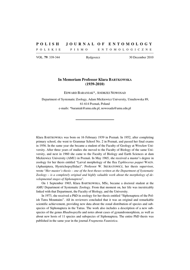 POLISHJOURNALOFENTOMO LOGY In Memoriam Professor Klara