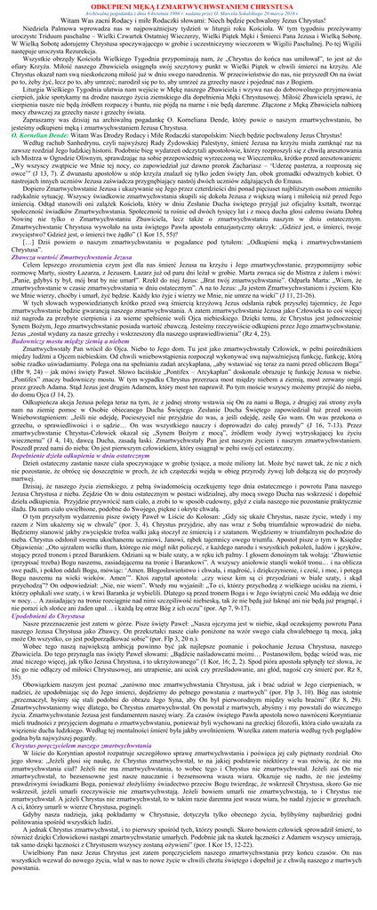 ODKUPIENI MĘKĄ I ZMARTWYCHWSTANIEM CHRYSTUSA Archiwalna pogadanka z dnia 6 kwietnia 1986 r. nadana przez O. Marcela Sokalskiego 20 marca 2016 r. Witam Was zacni Rodacy i miłe Rodaczki słowami: Niech będzie pochwalony Jezus Chrystus! Niedziela Palmowa wprowadza nas w najpoważniejszy tydzień w liturgii roku Kościoła. W tym tygodniu przeżywamy uroczyste Triduum paschalne – Wielki Czwartek Ostatniej Wieczerzy, Wielki Piątek Męki i Śmierci Pana Jezusa i Wielką Sobotę. W Wielką Sobotę adorujemy Chrystusa spoczywającego w grobie i uczestniczymy wieczorem w Wigilii Paschalnej. Po tej Wigilii następuje uroczysta Rezurekcja. Wszystkie obrzędy Kościoła Wielkiego Tygodnia przypominają nam, że „Chrystus do końca nas umiłował”, to jest aż do ofiary Krzyża. Miłość naszego Zbawiciela osiągnęła swój szczytowy punkt w Wielki Piątek w chwili śmierci na krzyżu. Ale Chrystus okazał nam swą nieskończoną miłość już w dniu swego narodzenia. W przeciwieństwie do nas, nie przyszedł On na świat po to, żeby żyć, lecz po to, aby umrzeć; narodził się po to, aby umrzeć za grzechy nasze i pojednać nas z Bogiem. Liturgia Wielkiego Tygodnia ułatwia nam wejście w Mękę naszego Zbawiciela i wzywa nas do dobrowolnego przyjmowania cierpień, jakie spotykamy na drodze naszego życia ziemskiego dla dopełnienia Męki Chrystusowej. Miłość Zbawiciela sprawi, że cierpienia nasze nie będą źródłem rozpaczy i buntu, nie pójdą na marne i nie będą daremne. Złączone z Męką Zbawiciela nabiorą mocy zbawczej za grzechy nasze i grzechy świata. Zapraszamy was dzisiaj na archiwalną pogadankę O. Korneliana Dende, który powie o naszym zmartwychwstaniu, bo jesteśmy odkupieni męką i zmartwychwstaniem Jezusa Chrystusa. O. Kornelian Dende: Witam Was Drodzy Rodacy i Miłe Rodaczki staropolskim: Niech będzie pochwalony Jezus Chrystus! Według rachub Sanhedrynu, czyli najwyższej Rady Żydowskiej Palestyny, śmierć Jezusa na krzyżu miała zamknąć raz na zawsze rozdział Jego ludzkiej historii. Podobnie bieg wydarzeń odczytali apostołowie, którzy rozproszyli się z chwilą aresztowania ich Mistrza w Ogrodzie Oliwnym, sprawdzając na sobie przepowiednię wyrzeczoną we Wieczerniku, krótko przed aresztowaniem: „Wy wszyscy zwątpicie we Mnie tej nocy, co zapowiedział już dawno prorok Zachariasz – ‘Uderzę pasterza, a rozproszą się owce’” (J 13, 7). Z dwunastu apostołów u stóp krzyża znalazł się tylko jeden święty Jan, obok gromadki odważnych kobiet. O nastrojach innych uczniów Jezusa zaświadcza przygnębiający nastrój dwóch uczniów zdążających do Emaus. Dopiero Zmartwychwstanie Jezusa i ukazywanie się Jego przez czterdzieści dni ponad pięciuset najbliższym osobom zmieniło radykalnie sytuację. Wszyscy świadkowie zmartwychwstania skupili się dokoła Jezusa z większą wiarą i miłością niż przed Jego śmiercią. Odtąd stanowili oni zalążek Kościoła, który w dniu Zesłanie Ducha świętego przyjął już oficjalny kształt, tworząc społeczność świadków Zmartwychwstania. Społeczność ta rośnie od dwóch tysięcy lat i z mocą ducha głosi całemu światu Dobrą Nowinę nie tylko o Zmartwychwstaniu Zbawiciela, lecz także o zmartwychwstaniu naszym w dniu ostatecznym. Zmartwychwstanie Chrystusa wywołało na usta świętego Pawła apostoła entuzjastyczny okrzyk: „Gdzież jest, o śmierci, twoje zwycięstwo? Gdzież jest, o śmierci twe żądło” (1 Kor 15, 55)? […] Dziś powiem o naszym zmartwychwstaniu w pogadance pod tytułem: „Odkupieni męką i zmartwychwstaniem Chrystusa”. Zbawcza wartość Zmartwychwstania Jezusa Celem lepszego zrozumienia czym jest dla nas śmierć Jezusa na krzyżu i Jego zmartwychwstanie, przypomnijmy sobie rozmowę Marty, siostry Łazarza, z Jezusem. Łazarz już od paru dni leżał w grobie. Marta zwraca się do Mistrza z żalem i mówi: „Panie, gdybyś ty był, mój brat by nie umarł”. Rzekł do niej Jezus: „Brat twój zmartwychwstanie”. Odparła Marta: „Wiem, że zmartwychwstanie w czasie zmartwychwstania w dniu ostatecznym”. A na to Jezus: „Ja jestem Zmartwychwstaniem i życiem. Kto we Mnie wierzy, choćby i umarł, żyć będzie. Każdy kto żyje i wierzy we Mnie, nie umrze na wieki” (J 11, 21-26). W tych słowach wypowiedzianych krótko przed swą śmiercią krzyżową Jezus odsłania rąbek przyszłej tajemnicy, że Jego zmartwychwstanie będzie gwarancją naszego zmartwychwstania. A zatem zmartwychwstanie Jezusa jako Człowieka to coś więcej niż nagroda za przebyte cierpienia i za wierne spełnienie woli Ojca niebieskiego. Dzięki temu, że Chrystus jest jednocześnie Synem Bożym, Jego zmartwychwstanie posiada wartość zbawczą. Jesteśmy rzeczywiście odkupieni przez Jego zmartwychwstanie. Jezus „został wydany za nasze grzechy i wskrzeszony dla naszego usprawiedliwienia” (Rz 4, 25). Budowniczy mostu między ziemią a niebem Zmartwychwstały Pan wrócił do Ojca. Niebo to Jego dom. Tu jest jako zmartwychwstały Człowiek, w pełni pośrednikiem między ludźmi a Ojcem niebieskim. Od chwili wniebowstąpienia rozpoczął wykonywać swą najważniejszą funkcję, funkcję, którą sobie rzadko uświadamiamy. Polega ona na spełnianiu zadań arcykapłana, „aby wstawiać się teraz za nami przed obliczem Boga” (Hbr 9, 24) – jak mówi święty Paweł. Słowo łacińskie „Pontifex – Arcykapłan” doskonale obrazuje tę funkcję Jezusa w niebie. „Pontifex” znaczy budowniczy mostu. W tym wypadku Chrystus przerzuca most między niebem a ziemią, most zerwany ongiś przez grzech Adama. Stąd Jezus jest drugim Adamem, który most ten naprawił. Po tym moście wszyscy możemy przejść do nieba, do domu Ojca (J 14, 2). Odkupieńcza akcja Jezusa polega teraz na tym, że z jednej strony wstawia się On za nami u Boga, z drugiej zaś strony zsyła nam na ziemię pomoc w Osobie obiecanego Ducha Świętego. Zesłanie Ducha Świętego 