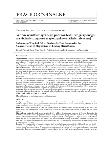 prace oryginalne Dent. Med. Probl. 2011, 48, 4, 513–518 ISSN 1644-387X © Copyright by Wroclaw Medical University and Polish Dental Society Zbigniew Kozłowski, Małgorzata Radwan-Oczko Wpływ wysiłku fizycznego podczas testu progresywnego na stężenie magnezu w spoczynkowej ślinie mieszanej Influence of Physical Effort During the Test Progressive for Concentration of Magnesium in Resting Mixed Saliva Zakład Patologii Jamy Ustnej Katedry Periodontologii Akademii Medycznej we Wrocławiu Streszczenie Wprowadzenie. Magnez należy do najbardziej rozpowszechnionych pierwiastków w organizmie człowieka. Jego suplementacja jest często wykorzystywana w celu uzyskania większej wydolności fizycznej i szybszej regeneracji powysiłkowej. Występuje również w ślinie, a jego rola w środowisku jamy ustnej nie jest do końca poznana. Cel pracy. Ocena wpływu wysiłku podczas testu progresywnego na stężenie magnezu w spoczynkowej ślinie mieszanej pobranej przed i po wysiłku oraz w porównaniu ze stężeniami magnezu u osób nieuprawiających sportu. Materiał i metody. Grupę badaną stanowiło 74 sportowców (kolarze i studenci AWF we Wrocławiu przed i po progresywnym teście wysiłkowym), a grupę kontrolną 43 mężczyzn nieuprawiających wyczynowo sportu, u których nie wykonywano testu progresywnego. Średnia wieku wynosiła 21,2 roku. Podczas badań nie podawano żadnych płynów. Do oznaczeń użyto supernatantu spoczynkowej śliny mieszanej. Stężenie magnezu oznaczono fotometrycznie, z użyciem zestawu diagnostycznego Alfa Diagnostic (odczynnik Magnez Arsenazo) przy długości fali 550 nm. Wyniki. Stężenie magnezu w grupie badanej przed wysiłkiem wynosiło 0,54 ± 0,40 mg/dl i było istotnie niższe (p ≤ 0,01) w porównaniu ze stężeniem 0,71 ± 0,42 mg/dl po zakończeniu testu progresywnego. W grupie kontrolnej stężenie magnezu wynosiło średnio 0,35 ± 0,26 mg/dl i było istotnie niższe w porównaniu z wartością w grupie badanej przed i po teście progresywnym (p ≤ 0,01). Analiza korelacji wykazała ujemną współzmienność stężenia magnezu wobec czasu wykonanej pracy i jej wartości w KJ oraz istotną dodatnią korelacją (p ≤ 0,001) między stężeniem magnezu przed wysiłkiem a szybkością wydzielania śliny. Wnioski. Wysiłek fizyczny podczas testu progresywnego wpływa na zwiększenie stężenia magnezu w spoczynkowej ślinie mieszanej. Wysiłek fizyczny podczas testu progresywnego istotnie zmniejsza szybkość wydzielania śliny (Dent. Med. Probl. 2011, 48, 4, 513–518). Słowa kluczowe: sport, test progresywny, ślina, magnez. Abstract Background. Magnesium is one of the most common elements in the human body. Its supplementation is often used for physical fitness gained greater and faster recovery after workouts. It also occurs in saliva, although its role in the oral environment is not fully understood. Objectives. Impact assessment of effort during progressive test for magnesium levels in resting mixed saliva collected before and after exercise, and in comparison with the concentrations of magnesium in people not practicing sports. Material and Methods. Study group consisted of 74 athletes (cyclists and students of Physical Education in Wroclaw before and after a progressive exercise test). The control group consisted of 43 men – not practicing sport professionally, who have not performed a progressive test. Mean age was 21.2 years. While studies have not given any fluids. Supernatant was used for the determination of resting mixed saliva. Magnesium concentration was determined photometrically, using a diagnostic kit Alpha Diagnostic (Magnesium Arsenazo reagent) at a wavelength of 550 nm. Results. The concentration of magnesium in the study group before exercise was 0.54 ± 0.40 mg/dl and was significantly lower (p ≤ 0.01) when compared to the concentration of 0.71 ± 0.42 mg/dl after the progressive test. In the control group the concentration of magnesium averaged 0.35 ± 0.26 mg/dl and was significantly lower compared to values in the study group before and after the progressive test (p ≤ 0.01). Correlation analysis showed a negative 514 Z. Kozłowski, M. Radwan-Oczko co-variableness concentrations of magnesium, compared to the time of the work and its values in KJ and significant positive (p ≤ 0.001) between serum magnesium before exercise and the rate of secretion of saliva. Conclusions. Physical exertion during the progressive test increases the concentration of magnesium in the resting mixed saliva. Physical exertion during the progressive test significantly reduces saliva flow rate (Dent. Med. Probl. 2011, 48, 4, 513–518). Key words: sport, test progressive, saliva, magnesium. Magnez należy do najbardziej rozpowszechnionych pierwiastków w organizmie człowieka. Najwięcej tego pierwiastka występuje w kościach, gdzie spełnia funkcję stabilizatora bezpostaciowego fosforanu wapniowego, hamując powstawanie krystalicznego apatytu, a mniej w wątrobie, mięśniach czy innych tkankach. Magnez jest ponadto aktywatorem wielu enzymów i większości przemian wewnątrzkomórkowych i immunologicznych organizmu. Wpływa na alkalizację ustroju, a wskutek tego na wiele chorób, jak np. osteoporozę, oraz na wydajność mięśni i ich zmęczenie [1–7]. U osób dorosłych jego zawartość w organizmie wynosi około 20–35 g, a dobowe zapotrzebowanie ok. 200–400 mg [1, 4]. Źródłem magnezu są zboża, kakao, orzechy, czekolada i twarda woda pitna [3, 4, 7]. Suplementacja magnezem jest stosowana w sporcie, zwłaszcza w okresie odwodnienia związanego z treningiem i w okresach redukcji masy ciała [6, 8–10]. W surowicy krwi stężenie magnezu wykazuje wahania dobowe z widocznym wzrostem wieczorem [11]. Nie wykazano istotnego wpływu płci lub wieku na stężenie magnezu w surowicy, obserwuje się natomiast jego niższe stężenie w tkankach u osób po 60 r.ż. w porównaniu z dziećmi [1, 12]. Magnez w jamie ustnej występuje w