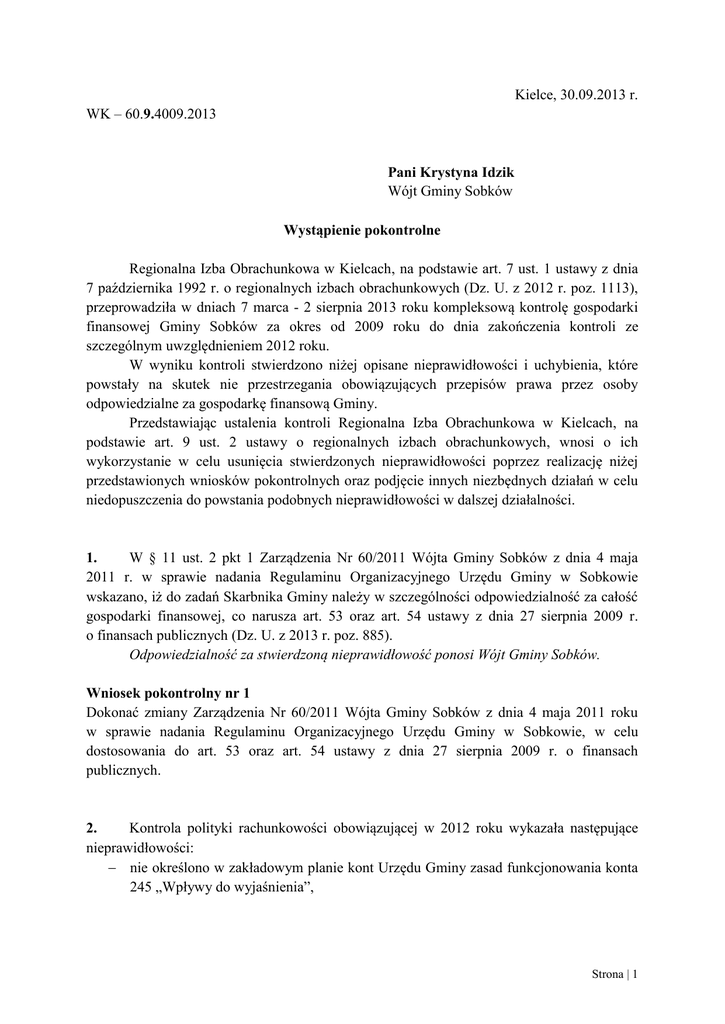 Kielce, 30.09.2013 r. WK – 60.9.4009.2013 Pani Krystyna Idzik Wójt Gminy Sobków Wystąpienie pokontrolne Regionalna Izba Obrachunkowa w Kielcach, na podstawie art. 7 ust. 1 ustawy z dnia 7 października 1992 r. o regionalnych izbach obrachunkowych (Dz. U. z 2012 r. poz. 1113), przeprowadziła w dniach 7 marca - 2 sierpnia 2013 roku kompleksową kontrolę gospodarki finansowej Gminy Sobków za okres od 2009 roku do dnia zakończenia kontroli ze szczególnym uwzględnieniem 2012 roku. W wyniku kontroli stwierdzono niżej opisane nieprawidłowości i uchybienia, które powstały na skutek nie przestrzegania obowiązujących przepisów prawa przez osoby odpowiedzialne za gospodarkę finansową Gminy. Przedstawiając ustalenia kontroli Regionalna Izba Obrachunkowa w Kielcach, na podstawie art. 9 ust. 2 ustawy o regionalnych izbach obrachunkowych, wnosi o ich wykorzystanie w celu usunięcia stwierdzonych nieprawidłowości poprzez realizację niżej przedstawionych wniosków pokontrolnych oraz podjęcie innych niezbędnych działań w celu niedopuszczenia do powstania podobnych nieprawidłowości w dalszej działalności. 1. W § 11 ust. 2 pkt 1 Zarządzenia Nr 60/2011 Wójta Gminy Sobków z dnia 4 maja 2011 r. w sprawie nadania Regulaminu Organizacyjnego Urzędu Gminy w Sobkowie wskazano, iż do zadań Skarbnika Gminy należy w szczególności odpowiedzialność za całość gospodarki finansowej, co narusza art. 53 oraz art. 54 ustawy z dnia 27 sierpnia 2009 r. o finansach publicznych (Dz. U. z 2013 r. poz. 885). Odpowiedzialność za stwierdzoną nieprawidłowość ponosi Wójt Gminy Sobków. Wniosek pokontrolny nr 1 Dokonać zmiany Zarządzenia Nr 60/2011 Wójta Gminy Sobków z dnia 4 maja 2011 roku w sprawie nadania Regulaminu Organizacyjnego Urzędu Gminy w Sobkowie, w celu dostosowania do art. 53 oraz art. 54 ustawy z dnia 27 sierpnia 2009 r. o finansach publicznych. 2. Kontrola polityki rachunkowości obowiązującej w 2012 roku wykazała następujące nieprawidłowości: nie określono w zakładowym planie kont Urzędu Gminy zasad funkcjonowania konta 245 „Wpływy do wyjaśnienia”, Strona | 1 w ewidencji księgowej jednostki Urzędu Gminy dokonywano zapisów operacji gospodarczych na koncie 203 zespołu 2 „Rozrachunki i rozliczenia”, którego nie ujęto w zakładowym planie kont, w ewidencji księgowej jednostki Urzędu Gminy dokonywano zapisów operacji gospodarczych na kontach księgi głównej zespołu 2, które ujęto w zakładowym planie kont Urzędu Gminy jako konta analityczne, a mianowicie: 202 „Rozrachunki z odbiorcami i dostawcami – roszczenia sporne”, 241 „Pozostałe rozrachunki, rozliczenie niedoboru, nadwyżek”, 242 „Pozostałe rozrachunki – roszczenia sporne”. Dla w/w kont nie określono zasad ich funkcjonowania. nie określono w zakładowym planie kont Urzędu Gminy zasad w ewidencji wydatków uznanych za wykonane w ramach funduszu sołeckiego w celu zapewnienia danych do wypełnienia kolumny 10 w sprawozdaniu Rb-28S z wykonania planu wydatków budżetowych. Nieprawidłowość narusza art. 10 ust. 1 pkt 3 lit a) ustawy z dnia 29 września 1994 r. o rachunkowości (Dz. U. z 2013 r. poz.330 z późn. zm.). Odpowiedzialność za stwierdzoną nieprawidłowość ponosi Wójt Gminy. Wniosek pokontrolny nr 2 2.1 Ująć w zakładowym planie kont Urzędu Gminy w/w konta oraz określić zasady ich funkcjonowania, stosownie do art. 10 ust. 1 pkt 3 lit a) ustawy z dnia 29 września 1994 r. o rachunkowości. 2.2 Uzupełnić dokumentacją przyjętych zasad (politykę) rachunkowości o zasady ujmowania w ewidencji wydatków uznanych za wykonane w ramach funduszu w celu zapewnienia danych do wypełnienia kolumny 10 w sprawozdaniu Rb-28S. 3. W 2012 roku na koncie pozabilansowym 998 „Zaangażowanie wydatków budżetowych roku bieżącego” nie dokonywano ewidencji zaangażowania w dacie zawarcia umowy, co narusza art. 40 ust. 2 pkt 2 ustawy z dnia 27 sierpnia 2009 r. o finansach publicznych oraz zasady funkcjonowania tego konta określone w załączniku nr 3 do rozporządzenia Ministra Finansów z dnia 5 lipca 2010 r. w sprawie szczególnych zasad rachunkowości oraz planów kont dla budżetu państwa, budżetów jednostek samorządu terytorialnego, jednostek budżetowych, samorządowych zakładów budżetowych, państwowych funduszy celowych oraz państwowych jednostek budżetowych mających siedzibę poza granicami Rzeczypospolitej Polskiej (Dz. U. z 2013 r. poz. 289) zwanego dalej również rozporządzeniem Ministra Finansów z dnia 5 lipca 2010 roku. Odpowiedzialność za stwierdzoną nieprawidłowość ponosi Z-ca Skarbnika Gminy. Wniosek pokontrolny nr 3 Na stronie Ma konta 998 „Zaangażowanie wydatków budżetowych roku bieżącego” ujmować na bieżąco zaangażowanie wydatków, czyli wartość umów, decyzji i innych postanowień, których wykonanie spowoduje konieczność dokonania wydatków budżetowych w roku bieżącym, stosownie do zasad funkcjonowania tego konta określonych w załączniku nr 3 do rozporządzenia Ministra Finansów z dnia 5 lipca 2010 r. Strona | 2 4. Na koncie 221 w korespondencji z kontem 720 przypisów i odpisów należności z tytułu podatków i opłat dokonywano jednym zapisem zbiorczym na koniec kwartału, co narusza art. 20 ust. 1 ustawy o rachunkowości oraz § 9, § 17 i § 20 rozporządzenia Ministra Finansów z dnia 25 października 2010 r. w sprawie zasad rachunkowości oraz planów kont dla organów podatkowych jednostek samorządu terytorialnego (Dz. U. Nr 208, poz. 1375). Odpowiedzialność za stwierdzone nieprawidłowość ponosi Z-ca Skarbnika Gminy. Wniosek pokontrolny nr 4 4.1 Należności z tytułu dochodów budżetowych, w tym z tytułu podatków i opłat ujmować na bieżąco w księdze głównej Urzędu następująco: przypis należności: Wn 221 „Należności z tytułu dochodów budżetowych”, Ma 720 „Przychody z tytułu dochodów budżetowych”, odpisy należności: Wn 720 „Przychody z t