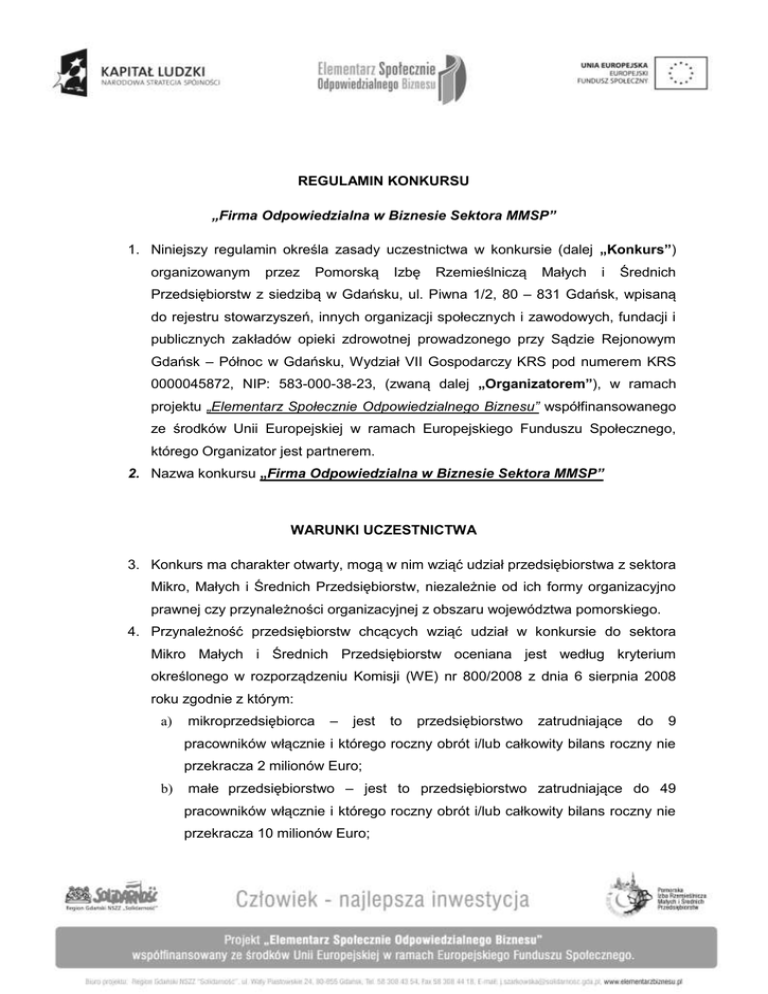 REGULAMIN KONKURSU „Firma Odpowiedzialna w Biznesie Sektora MMSP” 1. Niniejszy regulamin określa zasady uczestnictwa w konkursie (dalej „Konkurs”) organizowanym przez Pomorską Izbę Rzemieślniczą Małych i Średnich Przedsiębiorstw z siedzibą w Gdańsku, ul. Piwna 1/2, 80 – 831 Gdańsk, wpisaną do rejestru stowarzyszeń, innych organizacji społecznych i zawodowych, fundacji i publicznych zakładów opieki zdrowotnej prowadzonego przy Sądzie Rejonowym Gdańsk – Północ w Gdańsku, Wydział VII Gospodarczy KRS pod numerem KRS 0000045872, NIP: 583-000-38-23, (zwaną dalej „Organizatorem”), w ramach projektu „Elementarz Społecznie Odpowiedzialnego Biznesu” współfinansowanego ze środków Unii Europejskiej w ramach Europejskiego Funduszu Społecznego, którego Organizator jest partnerem. 2. Nazwa konkursu „Firma Odpowiedzialna w Biznesie Sektora MMSP” WARUNKI UCZESTNICTWA 3. Konkurs ma charakter otwarty, mogą w nim wziąć udział przedsiębiorstwa z sektora Mikro, Małych i Średnich Przedsiębiorstw, niezależnie od ich formy organizacyjno prawnej czy przynależności organizacyjnej z obszaru województwa pomorskiego. 4. Przynależność przedsiębiorstw chcących wziąć udział w konkursie do sektora Mikro Małych i Średnich Przedsiębiorstw oceniana jest według kryterium określonego w rozporządzeniu Komisji (WE) nr 800/2008 z dnia 6 sierpnia 2008 roku zgodnie z którym: a) mikroprzedsiębiorca – jest to przedsiębiorstwo zatrudniające do 9 pracowników włącznie i którego roczny obrót i/lub całkowity bilans roczny nie przekracza 2 milionów Euro; b) małe przedsiębiorstwo – jest to przedsiębiorstwo zatrudniające do 49 pracowników włącznie i którego roczny obrót i/lub całkowity bilans roczny nie przekracza 10 milionów Euro; c) średnie przedsiębiorstwo – jest to przedsiębiorstwo zatrudniające do 249 pracowników włącznie i którego roczny obrót nie przekracza 50 milionów Euro a/lub całkowity bilans roczny nie przekracza 43 milionów Euro. 5. Uczestnictwo w konkursie jest dobrowolne i bezpłatne. 6. Warunkiem uczestnictwa w Konkursie jest wypełnienia dwóch formularzy zgłoszeniowych, które są do pobrania na stronie internetowej Organizatora www.pomorskaizba.com.pl w zakładce „Firma z Przyszłością” oraz na stronie internetowej projektu www.elementarzbiznesu.pl w zakładce „Konkurs” lub w siedzibie Organizatora przy ul. Piwnej 1/2 w Gdańsku. Jeden z formularzy zgłoszeniowych powinien zostać wypełniony przez pracodawcę, a drugi przez pracownika. Kompletnie uzupełnione i podpisane formularze należy przesłać na adres Organizatora wskazany w ust. 1 w nieprzekraczalnym terminie do dnia 31 sierpnia 2013 roku lub złożyć osobiście. 7. W przypadku przesłania formularzy pocztą za dzień zgłoszenia uważa się datę stempla pocztowego. 8. Uczestnictwo w konkursie jest równoznaczne z wyrażeniem zgody na przekazanie informacji o zgłaszanym przedsiębiorstwie zgodnie z zasadami należytej staranności i etyki zawodowej w zakresie dotyczącym społecznej odpowiedzialności biznesu oraz na przetwarzanie danych dla celów postępowania konkursowego i publikacji wyników zbiorczych. 9. Podmioty uczestniczące w konkursie, wraz z dostarczeniem formularzy zgłoszeniowych, winny dostarczyć kopie dokumentu rejestracyjnego (odpis KRS lub wyciąg z CEDIG) oraz wypełnione oświadczenia o niezaleganiu z należnościami wobec Urzędu Skarbowego i ZUS. Wzór oświadczenia stanowi załącznik nr 1 do niniejszego regulaminu. 10. W celu potwierdzenia informacji zawartych w oświadczeniu o którym mowa w ust. 9, Organizator zastrzega sobie prawo, po terminie składania dokumentów a przed terminem wyboru laureatów konkursu do wezwania Uczestników celem złożenia przez nich zaświadczeń o niezaleganiu z należnościami względem Urzędu Skarbowego oraz ZUS. W przypadku odmowy dostarczenia wymaganych dokumentów, Organizator przyjmuje, iż Uczestnik zrezygnował z udziału Konkursie. WYBÓR LAUREATÓW 11. Wybór laureatów Konkursu dokonywany jest przez 3 osobową Komisję Oceniającą na podstawie nadesłanych przez uczestników formularzy zgłoszeniowych składających się z pytań zamkniętych i pytań otwartych. W formularzu zgłoszeniowym wypełnianym przez pracodawcę jest 16 pytań zamkniętych jednokrotnego wyboru i 16 pytań otwartych, natomiast w formularzu zgłoszeniowym przeznaczonym do wypełnienia przez pracownika jest 6 pytań zamkniętych jednokrotnego wyboru i 6 otwartych. 12. Poszczególnym pytaniom przypisana jest odpowiednia liczba punktów. Komisja Oceniająca nie ujawnia ilości punktów, które można zdobyć udzielając odpowiedzi na dane pytanie. Punkty są przyznawane wyłącznie za jednoznaczne udzielenie odpowiedzi. 13. Weryfikacja poprawności zaznaczonych odpowiedzi dokonywana jest poprzez porównywanie czy zaznaczona odpowiedź i opis w pytaniu otwartym są spójne. Jeżeli weryfikacja wykaże, że odpowiedź zaznaczona w pytaniu zamkniętym została wybrana przez osobę wypełniającą zgłoszenie „na wyrost” w stosunku do informacji zawartych w odpowiedzi na komplementarne pytanie otwarte, Członek Komisji Oceniającej powinien odjąć odpowiednią liczbę punktów. Jeżeli sytuacja jest odwrotna, Członek Komisji Oceniającej może dodać odpowiednią liczbę punktów. 14. Oceniając pytanie otwarte Członkowie Komisji Oceniającej zwracają uwagę na to, że im bardziej kompleksowy i adekwatny do pytania jest opis tym powinien być lepszy wynik firmy. 15. Wybór laureatów dokonywany jest w wyniku podsumowania punktów uzyskanych z odpowiedzi na wszystkie pytania z formularzy zgłoszeniowych pracodawcy i pracownika łącznie. 16. Wybór laureatów i ocena nadesłanych formularzy zgłoszeniowych dokonywana jest przez 3 osobową Komisję Oceniającą, której członkowie zostaną wybrani przez Organizatora najpóźniej do dnia upływu terminu składania dokumentów. 17. Maksyma