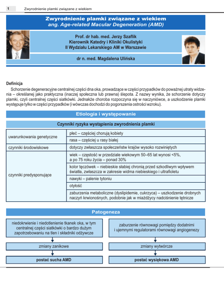 1 Zwyrodnienie plamki związane z wiekiem Zwyrodnienie plamki związane z wiekiem ang. Age-related Macular Degeneration (AMD) Prof. dr hab. med. Jerzy Szaflik Kierownik Katedry i Kliniki Okulistyki II Wydziału Lekarskiego AM w Warszawie dr n. med. Magdalena Ulińska Definicja Schorzenie degeneracyjne centralnej części dna oka, prowadzące w części przypadków do poważnej utraty widzenia – określanej jako praktyczna (inaczej społeczna lub prawna) ślepota. Z nazwy wynika, że schorzenie dotyczy plamki, czyli centralnej części siatkówki. Jednakże choroba rozpoczyna się w naczyniówce, a uszkodzenie plamki występuje tylko w części przypadków (i wówczas dochodzi do pogorszenia ostrości wzroku). Etiologia i występowanie Czynniki ryzyka wystąpienia zwyrodnienia plamki uwarunkowania genetyczne czynniki środowiskowe płeć – częściej chorują kobiety rasa – częściej u rasy białej dotyczy zwłaszcza społeczeństw krajów wysoko rozwiniętych wiek – częstość w przedziale wiekowym 50–65 lat wynosi <5%, a po 75 roku życia – ponad 30% czynniki predysponujące kolor tęczówek – niebieskie słabiej chronią przed szkodliwym wpływem światła, zwłaszcza w zakresie widma niebieskiego i ultrafioletu nawyki – palenie tytoniu otyłość zaburzenia metaboliczne (dyslipidemie, cukrzyca) – uszkodzenie drobnych naczyń krwionośnych, podobnie jak w miażdżycy nadciśnienie tętnicze Patogeneza niedokrwienie i niedotlenienie tkanek oka, w tym centralnej części siatkówki o bardzo dużym zapotrzebowaniu na tlen i składniki odżywcze zaburzenie równowagi pomiędzy dodatnimi i ujemnymi regulatorami równowagi angiogenezy zmiany zanikowe zmiany wytwórcze postać sucha AMD postać wysiękowa AMD Zwyrodnienie plamki związane z wiekiem 2 Przewaga oddziaływania czynników proangiogennych uruchamia patomechanizm prowadzący do „pączkowania” naczyń naczyniówki. Niekontrolowany rozwój naczyń patologicznych, nazywany neowaskularyzacją naczyniówkową, prowadzi do przenikania osocza i elementów morfotycznych krwi do otaczających je tkanek. Dochodzi wówczas do uszkodzenia nabłonka barwnikowego, fotoreceptorów i innych warstw siatkówki, a w konsekwencji do powstawania blizn. Rozpoznanie Czynniki ryzyka wystąpienia zwyrodnienia plamki Postać sucha AMD: 1. wczesne stadium l bezobjawowe, l bardzo rzadko (przy obecności zlewnych druz) może występować dyskretne pogorszenie widzenia z metamorfopsjami. 2. zaawansowane stadium l powolne pogarszanie się ostrości wzroku (na przestrzeni wielu lat), l mroczek centralny. Postać wysiękowa AMD: l dość nagłe (jeden dzień do kilku tygodni) pogorszenie widzenia, l wyraźne krzywienie się obrazów, mroczek centralny, l zaburzenia widzenia barwnego i odczuwania kontrastu. Ocena stopnia zaawansowania choroby oraz jej postaci opiera się na badaniu klinicznym, a w niektórych przypadkach na wyniku angiografii fluoresceinowej. Charakterystyka Postać sucha AMD: l dominująca (80–90% przypadków), ale o łagodnym przebiegu, l obecność złogów nieprawidłowych substancji (tzw. druzy) i drobnych zaników nabłonka barwnikowego, l przebieg jest powolny (kilku-, a nawet kilkunastoletni), może jednak sporadycznie doprowadzić do praktycznej ślepoty, jeśli dojdzie do zaawansowanego zaniku nabłonka barwnikowego (tzw. zaniku geograficznego). Postać wysiękowa AMD: l dość rzadka (10–20% przypadków), ale będąca główną (90%) przyczyną praktycznej ślepoty z powodu AMD, l rozwój patologicznych naczyń krwionośnych pod siatkówką, prowadzących do rozwoju jej uszkodzenia. W zależności od lokalizacji naczyń patologicznych rozróżnia się: v postać ukrytą CNV (naczynia zlokalizowane pod nabłonkiem barwnikowym siatkówki), v postać klasyczną (naczynia przechodzą przez nabłonek barwnikowy pod siatkówkę neurosensoryczną) z podziałem na: - minimalnie klasyczną (>50% naczyń „ukryte” jest pod nabłonkiem barwnikowym), - dominująco klasyczną (<50% naczyń jest ponad nabłonkiem barwnikowym). Oprócz słabiej lub lepiej widocznej płytki naczyń patologicznych można stwierdzić: n wylewy podsiatkówkowe, n obrzęk siatkówki, n włóknienie podsiatkówkowe, n twarde przesięki, n skupiska barwnika, n surowicze lub krwotoczne odwarstwienia n towarzyszące druzy, nabłonka barwnikowego, n wylew krwi do ciała szklistego (bardzo rzadko). n surowicze uniesienie siatkówki sensorycznej, 3 Zwyrodnienie plamki związane z wiekiem Diagnostyka Diagnostyka Do stwierdzenia początkowych zmian wystarczają podstawowe badania okulistyczne (badanie ostrości wzroku, test Amslera, badanie dna oczu), nie ma więc potrzeby kierowania pacjenta do pracowni angiograficznej. RODZAJ BADANIA Badanie ostrości wzroku KOMENTARZ Obniżenie ostrości wzroku do dali i bliży nie jest równoznaczne z obecnością AMD, ale sugeruje konieczność dokładnej diagnostyki. Obniżenie poczucia kontrastu oraz rozpoznawania barw Badanie poczucia kontrastu (np. na tablicach Pelli-Robson) to objawy często zgłaszane przez pacjentów z AMD; są one czasami bardziej dokuczliwe niż zmniejszenie ostrości wzroku. Test Amslera – badanie plamki w zakresie 10° od punktu fiksacji. Oryginalny test składa się z 7 tablic, ale w badaniach przesiewowych oraz w celu samokontroli (może być przeprowadzony przez pacjenta samodzielnie, dowolnie często) można go uprościć do jednej. Test jest bardzo przydatny do celów przesiewowych, jednak nie różnicuje przyczyny metamorfopsji. We wczesnych stadiach choroby, kiedy fotoreceptory siatkówki funkcjonują prawidłowo – daje wynik ujemny. Natomiast w każdej chorobie plamki, kiedy dochodzi do zbliżenia, oddalenia lub uszkodzenia fotoreceptorów – wynik jest nieprawidłowy. Badanie PHP (ang. Preferential Hyperacuity Perimetry) – hyperacuity jest zdolnością do spostrzegania minutowych różnic we względnych przestrzennych lokalizacjach 2 lub więcej bodźców. W czasie badan