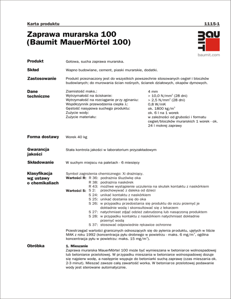 Karta produktu 1115-1 Zaprawa murarska 100 (Baumit MauerMörtel 100) baumit.com Produkt Gotowa, sucha zaprawa murarska. Sk³ad Wapno budowlane, cement, piaski murarskie, dodatki. Zastosowanie Produkt przeznaczony jest do wszystkich powszechnie stosowanych cegie³ i bloczków budowlanych; do murowania œcian noœnych, œcianek dzia³owych, okapów dymowych. Dane techniczne Ziarnistoœæ maks.: Wytrzyma³oœæ na œciskanie: Wytrzyma³oœæ na rozci¹ganie pr zy zginaniu: Wspó³czynnik przewodzenia ciep³a l: Gêstoœæ nasypowa suchego produktu: Zu¿ycie wody: Zu¿ycie materia³u: Forma dostawy Worek 40 kg Gwarancja jakoœci Sta³a kontrola jakoœci w laboratorium przyzak³adowym Sk³adowanie W suchym miejscu na paletach - 6 miesiêcy Klasyfikacja wg ustawy o chemikaliach Symbol zagro¿enia chemicznego: Xi dra¿ni¹cy. Wartoœci R: R 36: podra¿nia œluzówkê oka R 38: podra¿nia naskórek R 43: mo¿liwe wyst¹pienie uczulenia na skutek kontaktu z naskórkiem Wartoœci S: S 2: przechowywaæ z daleka od dzieci S 24: unikaæ kontaktu z naskórkiem S 25: unikaæ dostania siê do oka S 26: w przypadku pr zedostania siê produktu do oczu przemyæ je dok³adnie wod¹ i skonsultowaæ siê z lekarzem S 27: natychmiast zdj¹æ odzie¿ zabrudzon¹ lub nas¹czon¹ produktem S 28: w przypadku kontaktu z naskórkiem natychmiast dok³adnie przemyæ wod¹ S 37: stosowaæ odpowiednie rêkawice ochronne 4 mm > 10,0 N/mm2 (28 dni) > 2,5 N/mm2 (28 dni) 0,8 W/mK ok. 1800 kg/m3 ok. 6 l na 1 worek w zale¿noœci od gruboœci i formatu cegie³/bloczków murarskich 1 worek - ok. 24 l mokrej zaprawy Przestr zegaæ wartoœci granicznych odnosz¹cych siê do pylenia pr oduktu, ujêtych w liœcie MAK z roku 1992 (koncentracja py³u drobnego w powietrzu - maks. 6 mg/m 3, ogólna koncentracja py³u w powietrzu: maks. 15 mg/m 3). Obróbka 1. Mieszanie Zaprawa murarska MauerMörtel 100 mo¿e byæ wymieszana w betoniar ce wolnospadowej lub betoniarce przelotowej. W pr zypadku mieszania w betoniarce wolnospadowej dozuje siê najpierw wodê, a nastêpnie wsypuje do betoniarki such¹ zaprawê (czas mieszania ok. 2-3 minut). Mieszaæ zawsze ca³¹ zawartoœæ worka. W betoniar ce przelotowej podawanie wody jest sterowane automatycznie. 2. Murowanie Murowanie powinno odbywaæ siê zgodnie z zasadami sztuki budowlanej. Przy murowaniu nale¿y przestr zegaæ zaleceñ producenta cegie³ i bloczków budowlanych. Murowaæ na pe³n¹ spoiwê. Temperatura otoczenia, pod³o¿a i materia³u w czasie obróbki i procesu wi¹zania nie powinna byæ ni¿sza ni¿ + 5OC. Do zaprawy dodawaæ wy³¹cznie czystej wody z wodoci¹gów. Nie dodawaæ innych dodatków (np. œrodków przeciw zamar zaniu). Œwie¿¹ zaprawê nale¿y zu¿yæ - w zale¿noœci od warunków atmosferycznych - w ci¹gu 1 - 2 godzin. Baumit PL 10/04 a&g Wskazówki ogólne Nasze zalecenia w zakresie stosowanych technik, przekazywane s³owem i pismem w celu wsparcia nabywcy (u¿ytkownika) w oparciu o nasze doœwiadczenia i aktualny stan wiedzy s¹ niewi¹¿¹ce i nie uzasadniaj¹ prawnego stosunku umownego oraz ¿adnych zobowi¹zañ ubocznych z tytu³u umowy kupna (sprzeda¿y). Nie uwalniaj¹ one nabywcy od sprawdzenia na w³asn¹ odpowiedzialnoœæ przydatnoœci naszych produktów do przewidzianego zastosowania. Poza tym obowi¹zuj¹ nasze "Ogólne warunki umów" znajduj¹ce siê w katalogach produktów. Nasza gêsta sieæ przedstawicielstw gwarantuje szybkie doradztwo i dostawy. Prosimy zasiêgn¹æ informacji u najbli¿szego przedstawiciela regionalnego.