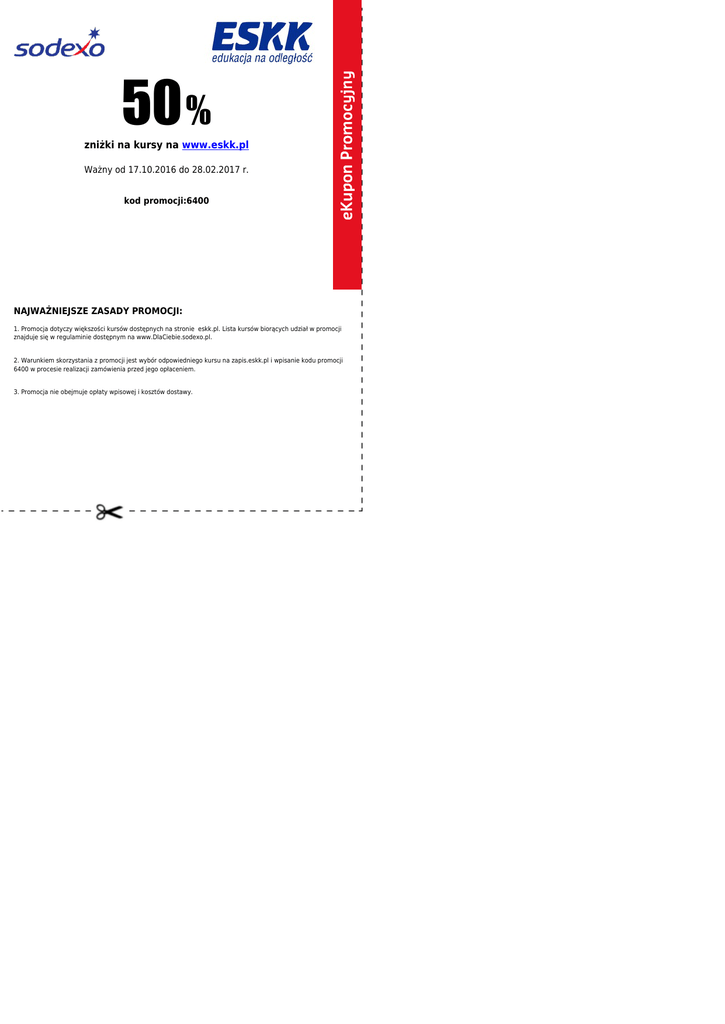50 % zniżki na kursy na www.eskk.pl Ważny od 17.10.2016 do 28.02.2017 r. kod promocji:6400 NAJWAŻNIEJSZE ZASADY PROMOCJI: 1. Promocja dotyczy większości kursów dostępnych na stronie eskk.pl. Lista kursów biorących udział w promocji znajduje się w regulaminie dostępnym na www.DlaCiebie.sodexo.pl. 2. Warunkiem skorzystania z promocji jest wybór odpowiedniego kursu na zapis.eskk.pl i wpisanie kodu promocji 6400 w procesie realizacji zamówienia przed jego opłaceniem. 3. Promocja nie obejmuje opłaty wpisowej i kosztów dostawy.