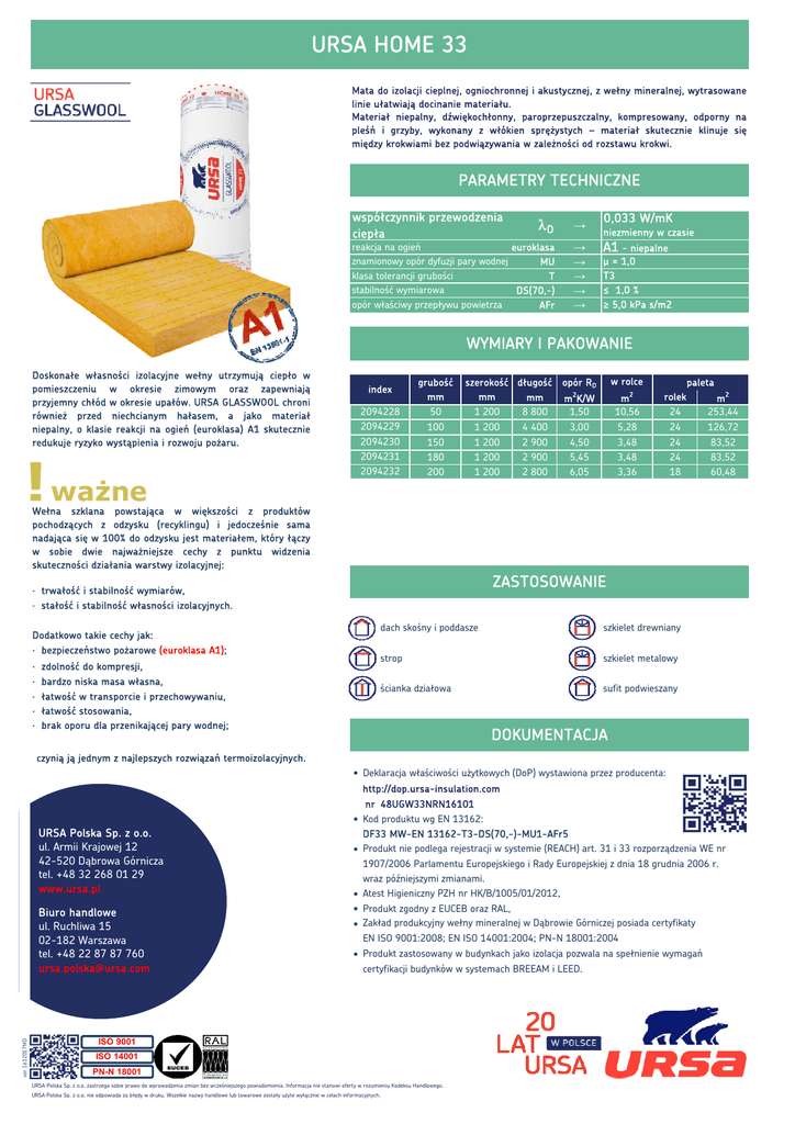 URSA HOME 33 Mata do izolacji cieplnej, ogniochronnej i akustycznej, z wełny mineralnej, wytrasowane linie ułatwiają docinanie materiału. Materiał niepalny, dźwiękochłonny, paroprzepuszczalny, kompresowany, odporny na pleśń i grzyby, wykonany z włókien sprężystych – materiał skutecznie klinuje się między krokwiami bez podwiązywania w zależności od rozstawu krokwi. PARAMETRY TECHNICZNE współczynnik przewodzenia ciepła D → reakcja na ogień euroklasa znamionowy opór dyfuzji pary wodnej MU klasa tolerancji grubości T stabilność wymiarowa DS(70,-) opór właściwy przepływu powietrza AFr → → → → → 0,033 W/mK niezmienny w czasie A1 - niepalne μ ≈ 1,0 T3 ≤ 1,0 % ≥ 5,0 kPa s/m2 WYMIARY I PAKOWANIE Doskonałe własności izolacyjne wełny utrzymują ciepło w pomieszczeniu w okresie zimowym oraz zapewniają przyjemny chłód w okresie upałów. URSA GLASSWOOL chroni również przed niechcianym hałasem, a jako materiał niepalny, o klasie reakcji na ogień (euroklasa) A1 skutecznie redukuje ryzyko wystąpienia i rozwoju pożaru. ! ważne index grubość mm szerokość długość mm mm 1 200 8 800 opór RD w rolce m2K/W 1,50 m 10,56 rolek 24 m 253,44 2 paleta 2 2094228 50 2094229 100 1 200 4 400 3,00 5,28 24 126,72 2094230 150 180 200 1 200 1 200 1 200 2 900 2 900 2 800 4,50 5,45 6,05 3,48 3,48 3,36 24 24 18 83,52 83,52 60,48 2094231 2094232 Wełna szklana powstająca w większości z produktów pochodzących z odzysku (recyklingu) i jedocześnie sama nadająca się w 100% do odzysku jest materiałem, który łączy w sobie dwie najważniejsze cechy z punktu widzenia skuteczności działania warstwy izolacyjnej: ZASTOSOWANIE · trwałość i stabilność wymiarów, · stałość i stabilność własności izolacyjnych. Dodatkowo takie cechy jak: · bezpieczeństwo pożarowe (euroklasa A1); · zdolność do kompresji, · bardzo niska masa własna, · łatwość w transporcie i przechowywaniu, · łatwość stosowania, · brak oporu dla przenikającej pary wodnej; dach skośny i poddasze szkielet drewniany strop szkielet metalowy ścianka działowa sufit podwieszany DOKUMENTACJA czynią ją jednym z najlepszych rozwiązań termoizolacyjnych. • Deklaracja właściwości użytkowych (DoP) wystawiona przez producenta: http://dop.ursa-insulation.com nr 48UGW33NRN16101 URSA Polska Sp. z o.o. ul. Armii Krajowej 12 42-520 Dąbrowa Górnicza tel. +48 32 268 01 29 www.ursa.pl ver.1612017MD Biuro handlowe ul. Ruchliwa 15 02-182 Warszawa tel. +48 22 87 87 760 [email protected] • Kod produktu wg EN 13162: DF33 MW-EN 13162-T3-DS(70,-)-MU1-AFr5 • Produkt nie podlega rejestracji w systemie (REACH) art. 31 i 33 rozporządzenia WE nr 1907/2006 Parlamentu Europejskiego i Rady Europejskiej z dnia 18 grudnia 2006 r. wraz późniejszymi zmianami. • Atest Higieniczny PZH nr HK/B/1005/01/2012, • Produkt zgodny z EUCEB oraz RAL, • Zakład produkcyjny wełny mineralnej w Dąbrowie Górniczej posiada certyfikaty EN ISO 9001:2008; EN ISO 14001:2004; PN-N 18001:2004 • Produkt zastosowany w budynkach jako izolacja pozwala na spełnienie wymagań certyfikacji budynków w systemach BREEAM i LEED. ISO 9001 ISO 14001 PN-N 18001 URSA Polska Sp. z o.o. zastrzega sobie prawo do wprowadzenia zmian bez wcześniejszego powiadomienia. Informacja nie stanowi oferty w rozumieniu Kodeksu Handlowego. URSA Polska Sp. z o.o. nie odpowiada za błędy w druku. Wszelkie nazwy handlowe lub towarowe zostały użyte wyłącznie w celach informacyjnych. URSA HOME 33 ZALECENIA MONTAŻOWE • 1 po rozpakowaniu opakowania należy odczekać kilka minut do czasu, aż wełna rozpręży się do wymiarów nominalnych, w razie potrzeby wełnę należy strzepnąć chwytając za dwa narożniki, • instalować należy wyłącznie produkt nieposiadający żadnych wad, • wełna powinna być docięta i zamontowana w taki sposób, aby zamontowane sąsiednie płyty szczelnie przylegały do siebie (brak szczelin między płytami oraz pomiędzy płytami i konstrukcją nośną), 2 • ostrym narzędziem należy uciąć przy prostej listwie pas wełny, długości równej odległości w świetle między krokwiami (w miejscu montażu) plus 2 cm naddatku potrzebnego na zaklinowanie wełny pomiędzy krokwiami, • montaż wełny może nastąpić wyłącznie w pomieszczeniach, w których wilgotność powietrza w 3 czasie montażu, jak i stale po jego wykonaniu nie przekracza wartości wskazanych przez producenta systemu GK i jednocześnie w warunkach braku występowania zjawiska wykraplania pary wodnej w wełnie, 4 • 5 przy membranie o wysokiej paroprzepuszczalności ułożonej na krokwiach wełnę dosuwa się bezpośrednio do niej. Przy konstrukcji z pełnym deskowaniem lub membranie o niskiej paro przepuszczalności zalecana jest szczelina od 2 ÷ 4 cm. Podczas układania pasów wełny przy wymaganej szczelinie wentylacyjnej szczególnie istotne jest pozostawienie jej w całości drożnej. W tym celu można przymocować listwy ograniczające lub przewiązać ocynkowany drut stalowy, • druga warstwa izolacji układana jest w poprzek pod krokwiami, między listwami drewnianymi, profilami metalowymi CD zamocowanymi na wieszakach lub elementami ES suchej zabudowy przymocowanymi do krokwi. Przed zamontowaniem profili metalowych należy umieścić w nich przycięte paski wełny, 6 7 • na tak wykonanej izolacji termicznej układana jest folia paroizolacyjna. Mocuje się ją zszywkami do łat drewnianych lub w przypadku profili metalowych – taśmą dwustronnie klejącą. Należy przewidzieć zakłady między arkuszami folii szerokości ok. 10 cm. Dla poprawienia szczelności przegrody wskazane jest łączyć zakłady folii przy pomocy taśmy dwustronnie klejącej. Miejsca na obrzeżach folii (połączenia z murłatą, ścianą szczytową itp.) powinny być uszczelnione, 9 8 • ostatecznym wykończeniem poddasza są płyty gipsowo-kartonowe, gipsowo-włóknowe, panele drewniane itp. Montaż wszystkich element