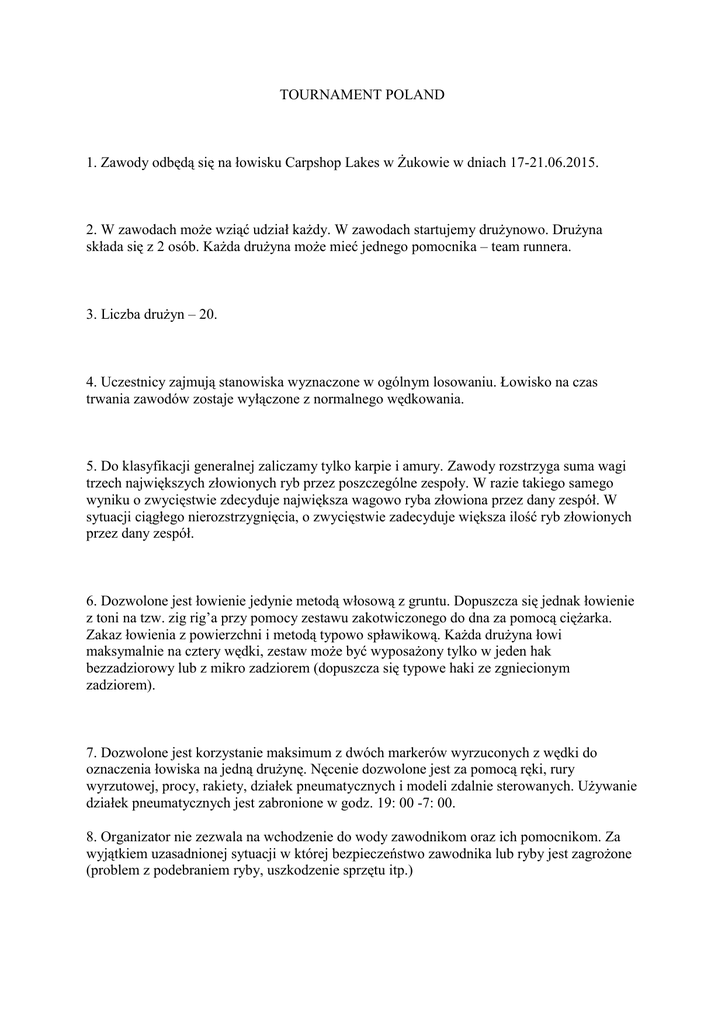 TOURNAMENT POLAND 1. Zawody odbędą się na łowisku Carpshop Lakes w Żukowie w dniach 17-21.06.2015. 2. W zawodach może wziąć udział każdy. W zawodach startujemy drużynowo. Drużyna składa się z 2 osób. Każda drużyna może mieć jednego pomocnika – team runnera. 3. Liczba drużyn – 20. 4. Uczestnicy zajmują stanowiska wyznaczone w ogólnym losowaniu. Łowisko na czas trwania zawodów zostaje wyłączone z normalnego wędkowania. 5. Do klasyfikacji generalnej zaliczamy tylko karpie i amury. Zawody rozstrzyga suma wagi trzech największych złowionych ryb przez poszczególne zespoły. W razie takiego samego wyniku o zwycięstwie zdecyduje największa wagowo ryba złowiona przez dany zespół. W sytuacji ciągłego nierozstrzygnięcia, o zwycięstwie zadecyduje większa ilość ryb złowionych przez dany zespół. 6. Dozwolone jest łowienie jedynie metodą włosową z gruntu. Dopuszcza się jednak łowienie z toni na tzw. zig rig’a przy pomocy zestawu zakotwiczonego do dna za pomocą ciężarka. Zakaz łowienia z powierzchni i metodą typowo spławikową. Każda drużyna łowi maksymalnie na cztery wędki, zestaw może być wyposażony tylko w jeden hak bezzadziorowy lub z mikro zadziorem (dopuszcza się typowe haki ze zgniecionym zadziorem). 7. Dozwolone jest korzystanie maksimum z dwóch markerów wyrzuconych z wędki do oznaczenia łowiska na jedną drużynę. Nęcenie dozwolone jest za pomocą ręki, rury wyrzutowej, procy, rakiety, działek pneumatycznych i modeli zdalnie sterowanych. Używanie działek pneumatycznych jest zabronione w godz. 19: 00 -7: 00. 8. Organizator nie zezwala na wchodzenie do wody zawodnikom oraz ich pomocnikom. Za wyjątkiem uzasadnionej sytuacji w której bezpieczeństwo zawodnika lub ryby jest zagrożone (problem z podebraniem ryby, uszkodzenie sprzętu itp.) 9. Koszt uczestnictwa – 700zł od drużyny/ pomocnik dodatkowe 100zł. Opłatę można wpłacać na konto podane poniżej: Dawid Patlewicz 04 1950 0001 2006 0780 4025 0002. W tytule wpisujemy wyłącznie imiona i nazwiska startujących! 10. Powyższa kwota zostanie wykorzystana na przygotowanie organizacyjne zawodów oraz zakup nagród rzeczowych, pucharów i dyplomów. Z tej kwoty również zostanie opłacony start w Mistrzostwach Polski PCM 2015 dla najlepszej drużyny w tych zawodach. W kosztach przewidziany jest również wieczór integracyjny pierwszego dnia zawodów wraz z poczęstunkiem dla wszystkich uczestników każdego dnia trwania zawodów. 11. Pomocnik (Team Runner) ma te same prawa co zawodnik. Może pomagać zawodnikom przy wszystkich czynnościach związanych z zawodami. 12. W trakcie trwania zawodów mają też zastosowanie przepisy zgodne z zasadami określonymi przez właściciela łowiska w jego odrębnym regulaminie. Regulamin dostępny będzie na tablicach przy wjeździe na łowisko. 13. Organizator zezwala na nęcenie kulkami proteinowymi oraz pelletem które zawodnicy otrzymają od organizatora przed rozpoczęciem zawodów w postaci pakietu startowego. Dozwolone jest również nęcenie method mixem, ziarnami (konopie, groch itp.) orzechami (tygrysi, arachidowy itp.). Zabronione jest używanie żywych przynęt (białe robaki, czerwone robaki itp.) 14. Ważenie klasyfikowanych ryb odbywa się w obecności wyznaczonych na rozpoczęciu osób. Ryby złowione w nocy przechowujemy w workach karpiowych do rana z wyjątkiem amura który będzie ważony zaraz po zgłoszeniu go sędziemu. W nocy tylko w uzasadnionych przypadkach ważymy ryby (powyżej 3 sztuk złowionych na jednym stanowisku). Każda z drużyn powinna posiadać przynajmniej 4 worki karpiowe, po dwa na każdego zawodnika. W worku karpiowym można trzymać po 1 karpiu. 15. Rybę należy tak holować, aby nie miała styczności z żyłkami zestawów sąsiedniej drużyny. Prosimy jednak o stosowanie zasad Fair-Play i pomoc drużynie sąsiedniej w wyholowaniu ryby. W przypadku gdy holowana ryba będzie miała kontakt z żyłkami drużyny sąsiedniej, zawodnicy z sąsiedniego stanowiska mają prawo zgłosić sędziemu protest, sędzia ma prawo wtedy nie uznać złowionej ryby. W przypadku nie zgłaszania protestu przez sąsiednią drużynę ryba będzie zaliczona. 16. W trakcie trwania zawodów łowimy tylko metodą gruntową. Każda drużyna łowi maksymalnie na cztery wędki, zestaw może być wyposażony tylko w jeden hak. Organizator nie zezwala na stosowanie drgającej szczytówki, metody spławikowej oraz metod innych od metody gruntowej. Całkowity zakaz używania do holowania i wywożenia zestawów: łodzi i pontonów. Do wywożenia zestawów dopuszcza się całodobowo używanie łódek zdalnie sterowanych w trakcie trwania zawodów. 17. Ryba holowana przed sygnałem zakończenia zawodów musi być podebrana maksimum do 20 minut po sygnale – koniec zawodów. 18. Zawodnicy są zobowiązani do umożliwienia robienia im oraz rybom zdjęć i filmowania przez organizatorów w czasie trwania zawodów. 19. Podczas trwania zawodów na stanowisku powinien przebywać przynajmniej jeden z zawodników. 20. W przypadku opuszczenia stanowiska przez obydwu zawodników należy wyjąć wszystkie zestawy z wody. 21. Na stanowisku mogą przebywać tylko zawodnicy oraz pomocnik (team runner). Organizator dopuszcza jednak przebywanie na łowisku osób niebiorących udziału w zawodach, a tylko odwiedzające zawodników na stanowisku wyłącznie po zgłoszeniu tego faktu sędziemu. Osoby odwiedzające zobowiązane są pozostawić samochód w wyznaczonych miejscach , a za ich zachowanie odpowiada drużyna do której te osoby przyjechały. Osoby odwiedzające zawodników mogą przebywać na stanowisku do godziny 22:00 22. Na stanowisko można wjechać samochodem w celu rozładowania sprzętu i pozostawić go na stanowisku na czas trwania zawodów. W trakcie trwania zawodów obowiązuje całkowity zakaz poruszania się samochodami osobom biorącym udział w zawodach (zawodnicy oraz pomocnicy) bez zgody organizatorów. Sam