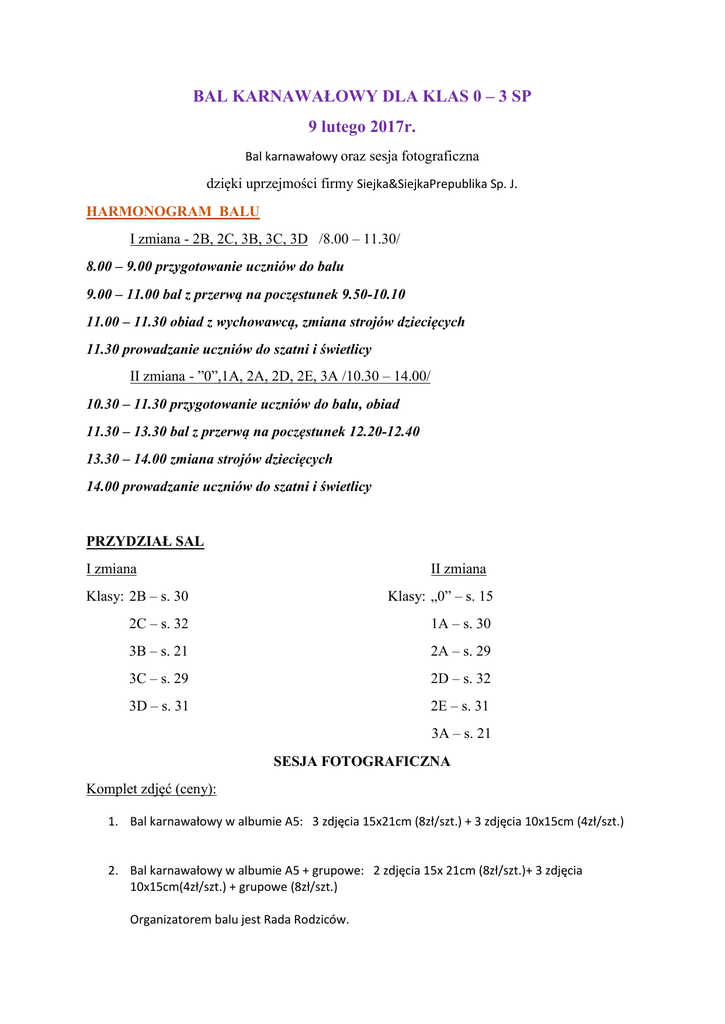 BAL KARNAWAŁOWY DLA KLAS 0 – 3 SP 9 lutego 2017r. Bal karnawałowy oraz sesja fotograficzna dzięki uprzejmości firmy Siejka&SiejkaPrepublika Sp. J. HARMONOGRAM BALU I zmiana - 2B, 2C, 3B, 3C, 3D /8.00 – 11.30/ 8.00 – 9.00 przygotowanie uczniów do balu 9.00 – 11.00 bal z przerwą na poczęstunek 9.50-10.10 11.00 – 11.30 obiad z wychowawcą, zmiana strojów dziecięcych 11.30 prowadzanie uczniów do szatni i świetlicy II zmiana - ”0”,1A, 2A, 2D, 2E, 3A /10.30 – 14.00/ 10.30 – 11.30 przygotowanie uczniów do balu, obiad 11.30 – 13.30 bal z przerwą na poczęstunek 12.20-12.40 13.30 – 14.00 zmiana strojów dziecięcych 14.00 prowadzanie uczniów do szatni i świetlicy PRZYDZIAŁ SAL I zmiana II zmiana Klasy: 2B – s. 30 Klasy: „0” – s. 15 2C – s. 32 1A – s. 30 3B – s. 21 2A – s. 29 3C – s. 29 2D – s. 32 3D – s. 31 2E – s. 31 3A – s. 21 SESJA FOTOGRAFICZNA Komplet zdjęć (ceny): 1. Bal karnawałowy w albumie A5: 3 zdjęcia 15x21cm (8zł/szt.) + 3 zdjęcia 10x15cm (4zł/szt.) 2. Bal karnawałowy w albumie A5 + grupowe: 2 zdjęcia 15x 21cm (8zł/szt.)+ 3 zdjęcia 10x15cm(4zł/szt.) + grupowe (8zł/szt.) Organizatorem balu jest Rada Rodziców.