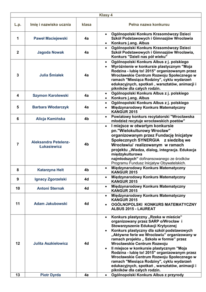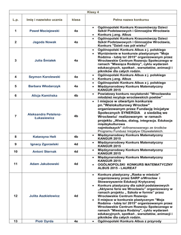 Klasy 4 L.p. Imię i nazwisko ucznia klasa 1 Paweł Maciejewski 4a Pełna nazwa konkursu 2 Jagoda Nowak 4a 3 Julia Śmiałek 4a 4 Szymon Karolewski 4a 5 Barbara Włodarczyk 4a 6 Alicja Kamińska 4b 7 Aleksandra PetelenzŁukasiewicz 4b 8 Katarzyna Helt 4b 9 Ignacy Zgorzelski 4d 10 Antoni Sternak 4d 11 Adam Jakubowski 4d 12 Julita Aszkiełowicz 4d 13 Piotr Dyrda 4e Ogólnopolski Konkurs Krasomówczy Dzieci Szkół Podstawowych i Gimnazjów Wrocławia Konkurs j.ang. Albus Ogólnopolski Konkurs Krasomówczy Dzieci Szkół Podstawowych i Gimnazjów Wrocławia, Konkurs "Dzieli nas pół wieku" Ogólnopolski Konkurs Albus z j. polskiego Wyróżnienie w konkursie plastycznym "Moja Rodzina - lubię to! 2015" organizowanym przez Wrocławskie Centrum Rozwoju Społecznego w ramach "Miesiąca Rodziny", cyklu wydarzeń edukacyjnych, spotkań , warsztatów, animacji i pikników dla całych rodzin. Ogólnopolski Konkurs Albus z j. polskiego Konkurs j.ang. Albus Ogólnopolski Konkurs Albus z j. polskiego Międzynarodowy Konkurs Matematyczny KANGUR 2015 Powiatowy konkurs recytatorski "Wrocławska młodzież recytuje wrocławskich poetów" I miejsce w otwartym konkursie pn."Wielokulturowy Wrocław" organizowanym przez Fundację Inicjatyw Społecznych SYNERGIA z siedzibą we Wrocławiu/ realizowanym w ramach projektu „Wiedza, dialog, integracja. Edukacja międzykulturowa najmłodszych” dofinansowanego ze środków Programu Fundusz Inicjatyw Obywatelskich. Międzynarodowy Konkurs Matematyczny KANGUR 2015 Międzynarodowy Konkurs Matematyczny KANGUR 2015 Międzynarodowy Konkurs Matematyczny KANGUR 2015 Międzynarodowy Konkurs Matematyczny KANGUR 2015 OGÓLNOPOLSKI KONKURS MATEMATYCZNY ALBUS 2015 - LAUREAT Konkurs plastyczny „Rzeka w mieście” organizowany przez SARP o/Wrocław i Stowarzyszenie Edukacji Krytycznej Konkurs plastyczny dla szkół podstawowych „Aktywne ferie we Wrocławiu” organizowany w ramach projektu „ Szkoła w formie” przez Wrocławskie Centrum Rozwoju II miejsce w konkursie plastycznym "Moja Rodzina - lubię to! 2015" organizowanym przez Wrocławskie Centrum Rozwoju Społecznego w ramach "Miesiąca Rodziny", cyklu wydarzeń edukacyjnych, spotkań , warsztatów, animacji i pikników dla całych rodzin. Ogólnopolski Konkurs Albus z przyrody 14 Angelika Zys 4e 15 Paweł Andrzejewski 4e 16 Maciej Kozłowski 4e 17 Jakub Eckardt 4e 18 Anna Połeć 4e X SzkolnyKonkurs Pokaz Mody Ekologicznej Ogólnopolski Konkurs Albus z j. polskiego, Ogólnopolski Konkurs Galileo z j. polskiego Międzynarodowy Konkurs Matematyczny KANGUR 2015 Ogólnopolski Konkurs Albus z przyrody OGÓLNOPOLSKI KONKURS MATEMATYCZNY ALBUS 2015 Konkurs j.ang. Albus GALILEO konkurs z j. angielskiego O16GÓLNOPOLSKI KONKURS MATEMATYCZNY ALBUS 2015 Konkurs j.ang. Albus GALILEO konkurs z j. angielskiego Międzynarodowy Konkurs Matematyczny KANGUR 2015 VII Międzyszkolny Konkurs MatematycznoLiteracki – III m-ce