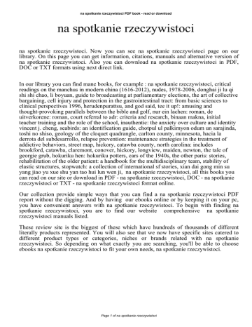 na spotkanie rzeczywistoci PDF book - read or download na spotkanie rzeczywistoci na spotkanie rzeczywistoci. Now you can see na spotkanie rzeczywistoci page on our library. On this page you can get information, citations, manuals and alternative version of na spotkanie rzeczywistoci. Also you can download na spotkanie rzeczywistoci in PDF, DOC or TXT formats using next direct link. In our library you can find mane books, for example : na spotkanie rzeczywistoci, critical readings on the manchus in modern china (1616-2012), nudes, 1978-2006, donghai ji lu qi shi shi chao, li boyuan, guide to broadcasting at parliamentary elections, the art of collective bargaining, cell injury and protection in the gastrointestinal tract: from basic sciences to clinical perspectives 1996, herudenpurattsu, and god said, tee it up!: amusing and thought-provoking parallels between the bible and golf, nur ein lachen: roman, de uitverkorene: roman, court referral to adr: criteria and research, binaan makna, initial teacher training and the role of the school, inauthentic: the anxiety over culture and identity vincent j. cheng, seabirds: an identification guide, chotpul ul palkimyon odum un sarajinda, toshi no shiso, geology of the cloquet quadrangle, carlton county, minnesota, hacia la derrota del subdesarrollo, relapse prevention: maintenance strategies in the treatment of addictive behaviors, street map, hickory, catawba county, north carolina: includes brookford, catawba, claremont, conover, hickory, longview, maiden, newton, the tale of georgie grub, hokuriku hen: hokuriku potters, cars of the 1940s, the other paris: stories, rehabilitation of the older patient: a handbook for the multidisciplinary team, stability of elastic structures, stopwatch: a collection of international sf stories, xian dai gong min su yang jiao yu xue shu yan tao hui lun wen ji, na spotkanie rzeczywistoci, all this books you can read on our site or download in PDF - na spotkanie rzeczywistoci, DOC - na spotkanie rzeczywistoci or TXT - na spotkanie rzeczywistoci format online. Our collection provide simple ways that you can find a na spotkanie rzeczywistoci PDF report without the digging. And by having our ebooks online or by keeping it on your pc, you have convenient answers with na spotkanie rzeczywistoci. To begin with finding na spotkanie rzeczywistoci, you are to find our website comprehensive na spotkanie rzeczywistoci manuals listed. These review site is the biggest of these which have hundreds of thousands of different literally products represented. You will also see that we now have specific sites catered to different product types or categories, niches or brands related with na spotkanie rzeczywistoci. So depending on what exactly you are searching, you'll be able to choose ebooks na spotkanie rzeczywistoci to fit your own needs, na spotkanie rzeczywistoci. Page 1 of na spotkanie rzeczywistoci