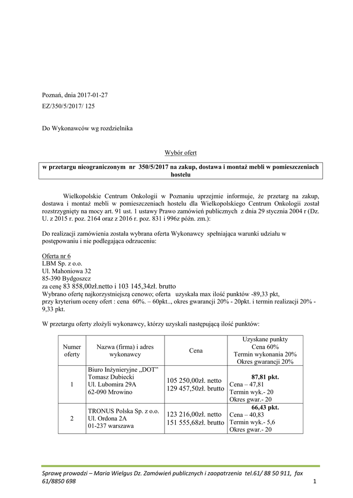 Poznań, dnia 2017-01-27 EZ/350/5/2017/ 125 Do Wykonawców wg rozdzielnika Wybór ofert w przetargu nieograniczonym nr 350/5/2017 na zakup, dostawa i montaż mebli w pomieszczeniach hostelu Wielkopolskie Centrum Onkologii w Poznaniu uprzejmie informuje, że przetarg na zakup, dostawa i montaż mebli w pomieszczeniach hostelu dla Wielkopolskiego Centrum Onkologii został rozstrzygnięty na mocy art. 91 ust. 1 ustawy Prawo zamówień publicznych z dnia 29 stycznia 2004 r (Dz. U. z 2015 r. poz. 2164 oraz z 2016 r. poz. 831 i 996z późn. zm.): Do realizacji zamówienia została wybrana oferta Wykonawcy spełniająca warunki udziału w postępowaniu i nie podlegająca odrzuceniu: Oferta nr 6 LBM Sp. z o.o. Ul. Mahoniowa 32 85-390 Bydgoszcz za cenę 83 858,00zł.netto i 103 145,34zł. brutto Wybrano ofertę najkorzystniejszą cenowo; oferta uzyskała max ilość punktów -89,33 pkt, przy kryterium oceny ofert : cena 60%. – 60pkt.., okres gwarancji 20% - 20pkt. i termin realizacji 20% 9,33 pkt. W przetargu oferty złożyli wykonawcy, którzy uzyskali następującą ilość punktów: Numer oferty 1 2 Nazwa (firma) i adres wykonawcy Biuro Inżynieryjne „DOT” Tomasz Dubiecki Ul. Lubomira 29A 62-090 Mrowino TRONUS Polska Sp. z o.o. Ul. Ordona 2A 01-237 warszawa Cena Uzyskane punkty Cena 60% Termin wykonania 20% Okres gwarancji 20% 87,81 pkt. 105 250,00zł. netto Cena – 47,81 129 457,50zł. brutto Termin wyk.- 20 Okres gwar.- 20 66,43 pkt. 123 216,00zł. netto Cena – 40,83 151 555,68zł. brutto Termin wyk.- 5,6 Okres gwar.- 20 Sprawę prowadzi – Maria Wielgus Dz. Zamówień publicznych i zaopatrzenia tel.61/ 88 50 911, fax 61/8850 698 1 3 Biuro KonstrukcyjnoHandlowe „MATEO” Mateusz Słomiński Ul. Sławieńska 9 76-010 Polanów 71,78 pkt. Cena – 42,45 118 525,00zł. netto Termin wyk.- 9,33 145 785,75zł. brutto Okres gwar.- 20 4 BENER Michał Benka Ul. Wileńska 59B/15 80-215 Gdańsk 96 711,00zł. netto Cena – 52,03 118 954,53zł. brutto Termin wyk.- 9.33 5 6 UNIKAT Sp. j. Piotr Kasprzak K. Moellenbrock Ul. Dobrepole 38 61-324 Poznań LBM Sp. z o.o. Ul. Mahoniowa 32 85-390 Bydgoszcz 7 Spiral Sp. z o.o. Ul. Wrzesińska 181, Jasin 62-020 Swarzędz 8 Grupa MM Ul. Świt 24a/7 60-376 Poznań 81,36 pkt. Okres gwar.- 20 86,54 pkt. 87 945,00zł. netto Cena – 57,21 108 172,35zł. brutto Termin wyk.- 9,33 Okres gwar.- 20 89,33 pkt. 83 858,00zł.netto Cena – 60 103 145,34zł. brutto Termin wyk.- 9,33 Okres gwar.- 20 86,51 pkt. 87 999,00zł. netto Cena – 57,18 108 238,77zł. brutto Termin wyk.- 9,33 Okres gwar.- 20 95 858,06zł. netto 117 905,41zł. brutto odrzucona W przetargu oferta wykonawcy Grupa MM podlega odrzuceniu, ponieważ oferta jest niezgodna z opisem przedmiotu zamówienia zawartym w siwz – w formularzu cenowym zaoferowano ilości niezgodne z wymaganiami zamawiającego. Błędy szczegółowe: - brak pozycji formularza ofertowego nr 6, 12, 13. - pozycja 16 oferty odpowiadająca pozycji nr 20 formularza cenowego, ilość 23 zamiast 18, - pozycja 25 oferty odpowiadająca pozycjom 30 i 31 formularza, błędne sumowanie ilości, 24 zamiast 23, - pozycja 26 odpowiadająca pozycjom 32-34 formularza, jedna sztuka zamiast trzech, - pozycja 28 oferty odpowiadająca pozycji 36 formularza, jedna szt. zamiast dwóch, nie uwzględnia w cenie lodówki. W związku z powyższym oferta podlega odrzuceniu na mocy art. 89 ust. 1 pkt. 2 ustawy Pzp – zamawiający odrzuca ofertę, jeżeli jej treść nie odpowiada treści specyfikacji istotnych warunków zamówienia. Dziękujemy za udział w postępowaniu o zamówienie publiczne. Wykonawcę, którego oferta została wybrana prosimy o przygotowanie umowy wg wzoru załączonego do niniejszego pisma. Umowa dostępna jest również w formie elektronicznej – ew. prośbę proszę wysłać na adres [email protected]. W związku z tym na mocy art. 94 ust. 1 pkt. 2 ustawy Prawo zamówień publicznych wyznacza się termin podpisania umowy na dzień 02.02.2017r Z poważaniem Z-ca Dyrektora ds. ekonomiczno-eksploatacyjnych Inż. Małgorzata Kołodziej - Sarna Sprawę prowadzi – Maria Wielgus Dz. Zamówień publicznych i zaopatrzenia tel.61/ 88 50 911, fax 61/8850 698 2 Prosimy o potwierdzenie otrzymania niniejszego pisma dotyczącego sprawy nr 350/5/2017 na nr faxu 61/ 88 50 698 Data …………………. Pieczątka i podpis………………………………… Sprawę prowadzi – Maria Wielgus Dz. Zamówień publicznych i zaopatrzenia tel.61/ 88 50 911, fax 61/8850 698 3