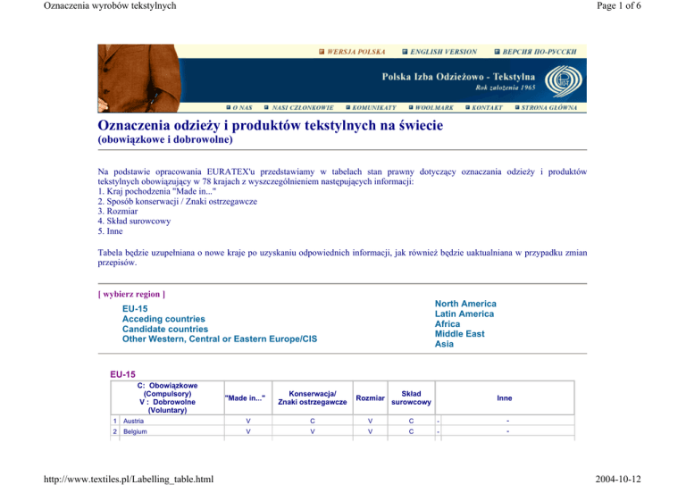 Oznaczenia wyrobów tekstylnych Page 1 of 6 Oznaczenia odzieży i produktów tekstylnych na świecie (obowiązkowe i dobrowolne) Na podstawie opracowania EURATEX'u przedstawiamy w tabelach stan prawny dotyczący oznaczania odzieży i produktów tekstylnych obowiązujący w 78 krajach z wyszczególnieniem następujących informacji: 1. Kraj pochodzenia "Made in..." 2. Sposób konserwacji / Znaki ostrzegawcze 3. Rozmiar 4. Skład surowcowy 5. Inne Tabela będzie uzupełniana o nowe kraje po uzyskaniu odpowiednich informacji, jak również będzie uaktualniana w przypadku zmian przepisów. [ wybierz region ] North America Latin America Africa Middle East Asia EU-15 Acceding countries Candidate countries Other Western, Central or Eastern Europe/CIS EU-15 C: Obowiązkowe (Compulsory) V : Dobrowolne (Voluntary) "Made in..." Konserwacja/ Znaki ostrzegawcze Rozmiar Skład surowcowy Inne 1 Austria V C V C - 2 Belgium V V V C - http://www.textiles.pl/Labelling_table.html - 2004-10-12 Oznaczenia wyrobów tekstylnych Page 2 of 6 - 3 Denmark V V V C - 4 Finland V C V C - 5 France V V V C - 6 Germany V V V C - 7 Greece V V V C - 8 Ireland V V V C - 9 Italy V V V C - 10 Luxembourg V V V C - 11 Netherlands V V V C C 12 Portugal V V V C - Niepalność dla produktów dziecięcych - 13 Spain C * V V C - *:"Made in" obowiązkowe dla krajów spoza WTO 14 Sweden V V V C - - 15 United Kingdom V V V C C Niepalność dla produktów dziecięcych Konserwacja/ Znaki ostrzegawcze Rozmiar Skład surowcowy Do góry strony Acceding countries C: Obowiązkowe (Compulsory) V : Dobrowolne (Voluntary) "Made in..." Inne 16 Cyprus C V V C - - 17 Czech Republic C C C C C Nazwa producenta 18 Estonia C C C C - 19 Hungary C C C C - 20 Latvia C V C C - - 21 Lithuania C C C C C Nazwa i pochodzenie wytwórcy 22 Malta V V V C - - 23 Poland C C C C C Nazwa i adres producenta 24 Slovak Republic C C C C C Nazwa producenta 25 Slovenia C C C C - - "Made in..." Konserwacja/ Znaki ostrzegawcze Rozmiar Skład surowcowy C C C C Do góry strony Candidate countries C: Obowiązkowe (Compulsory) V : Dobrowolne (Voluntary) 26 Bulgaria http://www.textiles.pl/Labelling_table.html Inne - - 2004-10-12 Oznaczenia wyrobów tekstylnych Page 3 of 6 - 27 Romania C C V C - 28 Turkey C C C C - "Made in..." Konserwacja/ Znaki ostrzegawcze Rozmiar Skład surowcowy 29 Armenia C? C? C? C? - 30 Azerbaijan C? C? C? C? - 31 Belarus C? C? C? C? - 32 Croatia C V? V? C? - 33 Georgia C? C? C? C? - V V V C C 35 Iceland V? V? V? C? - 36 Kazakhstan C? C? C? C? - 37 Kyrgyz Republic C? C? C? C? - 38 Moldova C? C? C? C? - 39 Norway V? V? V? C? - Niepalność dla produktów dziecięcych - 40 Russian Federation C C C C C Wymagany certyfikat 41 Switzerland V V V C - 42 Tajikistan C? C? C? C? - 43 Turkmenistan C? C? C? C? - 44 Ukraine C? C? C? C? - 45 Uzbekistan C? C? C? C? - - "Made in..." Konserwacja/ Znaki ostrzegawcze Rozmiar Skład surowcowy 46 Canada C V V C C Numer eksportera 47 Snt Pierre & Miquelon- France V V V C - 48 United States C C V C - - Do góry strony Other Western, Central or Eastern Europe/CIS C: Obowiązkowe (Compulsory) V : Dobrowolne (Voluntary) 34 Gibraltar - UK Inne - Do góry strony North America C: Obowiązkowe (Compulsory) V : Dobrowolne (Voluntary) Inne Do góry strony http://www.textiles.pl/Labelling_table.html 2004-10-12 Oznaczenia wyrobów tekstylnych Page 4 of 6 Latin America C: Obowiązkowe (Compulsory) V : Dobrowolne (Voluntary) "Made in..." Konserwacja/ Znaki ostrzegawcze Rozmiar Skład surowcowy 49 Argentina C C C C C Numer eksportera/producenta, NIP 50 Brazil C C C C C Numer eksportera/producenta, NIP Niepalność dla produktów dziecięcych - Inne 51 British Virgin Islands - UK V V V C C 52 Chile C C C C - 53 Colombia C C C C - 54 Falkland Islands - UK V V V C C 55 French Guiana - France V V V C - 56 Guadeloupe - France V V V C - 57 Martinique - France V V V C - Niepalność dla produktów dziecięcych - 58 Mexico C C C C C Numer eksportera/producenta, NIP 59 Montserrat - UK V V V C C Niepalność dla produktów dziecięcych 60 Paraguay C C C C C Numer eksportera/producenta, NIP 61 Uruguay C C C C C Numer eksportera/producenta, NIP 62 Venezuela C C C C C Numer eksportera/producenta, NIP "Made in..." Konserwacja/ Znaki ostrzegawcze Rozmiar Skład surowcowy Do góry strony Africa C: Obowiązkowe (Compulsory) V : Dobrowolne (Voluntary) 63 Egypt Inne C* V V V - *: "Made In" tylko dla tkanin 64 Libyan Arab Jamahiriya V V V V - 65 Morocco C C C C - 66 Reunion - France V V V C - 67 South Africa V C V C - 68 Tunisia V V V V - - Do góry strony Middle East C: Obowiązkowe (Compulsory) http://www.textiles.pl/Labelling_table.html "Made in..." Rozmiar Konserwacja/ Inne Skład 2004-10-12 Oznaczenia wyrobów tekstylnych Page 5 of 6 V : Dobrowolne (Voluntary) Znaki ostrzegawcze surowcowy 69 Bahrain C C C C - 70 Israel C C C C - 71 Kuwait C V V V - 72 Lebanon C V V V - 73 Saudi Arabia C C C C - 74 United Arab Emirates C V V V - "Made in..." Konserwacja/ Znaki ostrzegawcze Rozmiar Skład surowcowy C C V C - Do góry strony Asia C: Obowiązkowe (Compulsory) V : Dobrowolne (Voluntary) 75 Australia 76 Bangladesh C ? Inne C - 77 China C C C C - 78 Cook Islands - USA C C V C - 79 French Polynesia - France V V V C - 80 Hong Kong, China V V V V - 81 India C V C C - 82 Indonesia V V V V - 83 Japan C C V C - 84 Korea, Republic of C C V C - 85 Macao, China V? V? V? V? - 86 Malaysia V V V V - 87 Marshall Islands - USA C C V C - 88 New Caledonia - France V V V C - C? V? V? C - 90 Pakistan V V V V - 91 Philippines C C V C - 92 Singapore V V V V - 93 Sri Lanka C? C? C? C? - 94 Taipei, Chinese C C C C - 95 Thailand C C C C - 96 Viet Nam V C V C - 89 New Zealand Niepalność dla produktów dziecięcych - Do góry strony http://www.textiles.pl/Labelling_table.html 2004-10-12 Oznaczenia wyrobów tekstylnych Page 6 of 6 http://www.textiles.pl/Labelling_table.html 2004-10-12