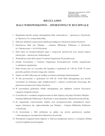 Załącznik do Zarządzenia Nr 1/2015 z dnia 01.01. 2015 Dyrektora Miejsko – Gminnej Biblioteki Publicznej w Rychwale REGULAMIN HALI WIDOWISKOWO – SPORTOWEJ W RYCHWALE 1. Regulamin określa zasady udostępniania Hali widowiskowo – sportowej w Rychwale, ul. Sportowa 34, zwanej dalej Halą. 2. Hala jest obiektem użyteczności publicznej będącym własnością Gminy Rychwał. 3. Dzierżawcą Hali jest Miejsko – Gminna Biblioteka Publiczna w Rychwale, ul. Tuliszkowska 1, 62-670 Rychwał. 4. Hala służy do przeprowadzania zajęć i rozgrywek sportowych oraz innych imprez rekreacyjno - sportowych i kulturalnych. 5. Wydzieloną część Hali stanowi Centrum Organizacji Pozarządowych. 6. Zasady korzystania z Centrum Organizacji Pozarządowych zostały uregulowane w odrębnym regulaminie. 7. Hala otwarta jest we wszystkie dni tygodnia w godzinach od 7.00 do 22.00. W razie potrzeby godziny otwarcia mogą ulec zmianie. 8. Zajęcia na Hali odbywają się według wcześniej ustalonego harmonogramu. 9. W dni powszechne w godzinach od 8.00 do 16.00 Hala udostępniana jest przede wszystkim na realizację zajęć dydaktycznych z zakresu wychowania fizycznego dla placówek oświatowych Gminy Rychwał. 10. W pozostałych godzinach obiekt udostępniany jest odpłatnie osobom fizycznym i grupom zorganizowanym. 11. O możliwości i zasadach zorganizowania na Hali imprezy decyduje Dyrektor Miejsko – Gminnej Biblioteki Publicznej w Rychwale w porozumieniu z Burmistrzem Rychwała. 12. Za organizację wykorzystania obiektu oraz przygotowywanie niezbędnych umów najmu, dzierżawy itp. odpowiedzialna jest Miejsko – Gminna Biblioteka Publiczna w Rychwale. 13. Za korzystanie z Hali pobierane są opłaty wg stawki godzinowej zgodnie z obowiązującym zarządzeniem Burmistrza Rychwała. 14. Warunkiem zorganizowania imprezy w Hali jest podpisanie umowy o wynajmie obiektu i jej bezwzględne przestrzeganie. 15. Wynajmu Hali dokonuje się na podstawie przedstawionych informacji: osoba fizyczna powinna przedstawić: o o o o o o imię i nazwisko osoby wynajmującej, aktualny adres zamieszkania, numer dowodu osobistego, numer telefonu kontaktowego, szczegółowy termin wynajmu (datę i godziny), wskazać pomieszczenie pod wynajem, kluby, stowarzyszenia, instytucje, zakłady pracy itp. powinny przedstawić: o o o o o o imię i nazwisko osoby reprezentującej grupę, pełną nazwę klubu, stowarzyszenia, instytucji, zakładu pracy, itp. adres, numer telefonu kontaktowego, szczegółowy termin wynajmu(datę i godziny), wskazać pomieszczenie pod wynajem. 16. Zajęcia treningowe i rekreacyjne odbywają się zgodnie z obowiązującym na dany sezon sportowy harmonogramem, na warunkach określonych we wcześniej podpisanej umowie pomiędzy Miejsko - Gminną Biblioteką Publiczną w Rychwale a klubem, stowarzyszeniem, szkołą lub instytucją. 17. Za grupy odbywające zajęcia w Hali pełną odpowiedzialność ponoszą ich opiekunowie (nauczyciele, trenerzy, instruktorzy, kierownicy), zarówno w zakresie wyrządzonych szkód materialnych jak i wszelkich nieszczęśliwych wypadków swoich podopiecznych. 18. Osoby korzystające z Hali mają prawo korzystać z określonych pomieszczeń i sprzętu znajdującego się na wyposażeniu obiektu wyłącznie za zgodą obsługi Hali. Klucze do pomieszczeń pobiera się za pokwitowaniem; sprzęt sportowy udostępniają pracownicy obsługi Hali. 19. Z Hali korzystać mogą: grupy zorganizowane, dzieci i młodzież szkolna pod nadzorem nauczyciela, trenera lub instruktora, kluby, sekcje i związki sportowe, zakłady pracy, stowarzyszenia, instytucje, organizacje, itp., osoby fizyczne, dzieci do lat 7 mogą przebywać na terenie obiektu wyłącznie pod opieką osób pełnoletnich. 20. Z Hali nie mogą korzystać osoby: których stan wskazuje na spożycie alkoholu, lub które są pod działaniem środków odurzających, psychotropowych, z przeciwwskazaniami lekarskimi. 21. Na teren Hali nie można wprowadzać zwierząt. 22. Obowiązkiem osób korzystających z Hali jest: pozostawienie okryć zewnętrznych i obuwia w szatni (dot. osób korzystających z płyty boiska), pozostawienie toreb i ubrań w wydzielonej strefie lub szatni (dot. osób korzystających z sali fitness), założenia właściwego obuwia sportowego (czystego, niepozostawiającego podczas użytkowania płyty boiska i podłogi w sali fitness zabrudzeń, rys itp.), punktualnego rozpoczęcia i zakończenia zajęć, przestrzeganie zasad bezpieczeństwa przy korzystaniu z przyrządów sportowych znajdujących się w Hali, utrzymanie czystości i porządku na terenie Hali, szatni i pomieszczeniach sanitarnych, natychmiastowe informowanie obsługi obiektu o wszystkich uszkodzeniach sprzętu, wyposażenia urządzeń oraz występujących zagrożeniach, podporządkowanie się poleceniom osób prowadzących zajęcia lub pracowników odpowiedzialnych za funkcjonowanie obiektu. 23. Osoby wynajmujące płytę boiska i salę fitness mogą korzystać z pomieszczeń szatni. 24. Osoba odpowiedzialna za grupę ma obowiązek zamknięcia szatni i odpowiada za pozostawiony porządek po jej opuszczeniu. 25. Przebywającym na terenie Hali nie wolno: wnosić napojów i jedzenia na płytę boiska oraz salę fitness, palić papierosów, stosować środków odurzających lub substancji psychotropowych, pić napojów alkoholowych (nie dotyczy kawiarni), wnosić i używać wszelkiego rodzaju niebezpiecznych przedmiotów, materiałów wybuchowych, wyrobów pirotechnicznych, materiałów grożących pożarem, wieszać się na obręczach i konstrukcji do piłki koszykowej, korzystać ze wszelkich urządzeń elektrycznych znajdujących się na Hali sportowej, przeszkadzać w zajęciach i grze, zaśmiecać, dewastować. 26. W czasie imprez sportowych oraz kulturalnych organizator jest zobowiązany przestrzegać przepisów regulaminu, oraz jest odpowiedzialny za zapewnienie bezpieczeństwa korzystającym z Hali. 27. Hala jest monitorowana w sposób cią