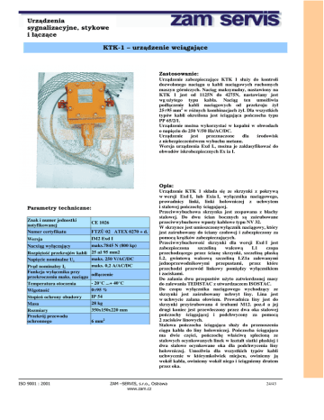 Urządzenia sygnalizacyjne, stykowe i łączące KTK-1 – urządzenie wciągające Zastosowanie: Urządzenie zabezpieczające KTK 1 służy do kontroli dozwolonego naciągu u kabli naciągowych ruchomych maszyn górniczych. Naciąg maksymalny, nastawiony na KTK 1 jest od 1125N do 4275N, nastawiany jest wg użytego typu kabla. Naciąg ten umożliwia podłączenie kabli naciągowych od przekroju żył 25÷95 mm2 w różnych kombinacjach żył. Dla wszystkich typów kabli określona jest ściągająca pończocha typu PP 65/2/1. Urządzenie można wykorzystać w kopalni w obwodach o napięciu do 250 V/50 Hz/AC/DC. Urządzenie jest przeznaczone dla środowisk z niebezpieczeństwem wybuchu metanu. Wersja urządzenia Exd I., można je zaklasyfikować do obwodów iskrobezpiecznych Ex ia I. Opis: Parametry techniczne: Znak i numer jednostki notyfikowanej Numer certyfikatu CE 1026 FTZÙ 02 ATEX 0270 + d. Wersja IM2 Exd I Nacxiąg wyłączający maks.7845 N (800 kp) Rozpiętość przekrojów kabli 25 až 95 mm2 maks. 250 V/AC/DC Napięcie nominalne Uj maks. 0,2 A/AC/DC Prąd nominalny Ij Funkcja wyłącznika przy odłączenie przekroczeniu maks. naciągu - 20°C ...+ 40°C Temperatura otoczenia 0÷95 % Wigotność IP 54 Stopień ochrony obudowy Masa Rozmiary Przekrój przewodu ochronnego uziem. zaciskówi ISO 9001 : 2001 28 kg 350x150x220 mm 6 mm2 Urządzenie KTK 1 składa się ze skrzynki z pokrywą w wersji Exd I, lub Exia I, wyłącznika naciągowego, prowadnicy linki, linki holowniczej z uchwytem i stalowej pończochy ściągającej. Przeciwwybuchowa skrzynka jest zespawana z blachy stalowej. Do dwu ścian bocznych są zaśrubowane przeciwwybuchowe wpusty kablowe typu NV 32. W skrzynce jest umieszczonywyłącznik naciągowy, który jest zaśrubowany do ściany czołowej i zabezpieczony za pomocą krążków zabezpieczających. Przeciwwybuchowość skrzynki dla wersji Exd I jest zabezpieczona szczeliną walcową L1 czopa przechodzącego przez ścianę skrzynki, szczeliną płaską L2, gwintową walcową szczeliną LZ1a zalewanymi jednoprzewodnikowymi przepustami, przez które przechodzi przewód linkowy pomiędzy wyłącznikiem i zaciskami. Do zalania dwu przepustów użyto zatwierdzonej masy do zalewania TEDISTAC z utwardzaczem ISOSTAC. Do czopu wyłącznika naciągowego wychodzący ze skrzynki jest zaśrubowany uchwyt liny. Lina jest w uchwycie zalana ołowiem. Prowadnica liny jest do skrzynki przyśrubowana 4 śrubami M12. poz.4 a jej drugi koniec jest przewleczony przez dwa oka stalowej pończochy ściągającej i podchwycony za pomocą 2 zacisków linowych. Stalowa pończocha ściągająca służy do przenoszenia ciągu kabla do liny holowniczej. Pończocha ściągająca ma dwie części, pończochę właściwą splecioną ze stalowych ocynkowanych linek w kształt siatki płaskiej i dwa stalowe ocynkowane oka dla podchwycenia liny holowniczej. Umożlwia dla wszystkich typów kabli uchwycenie w którymkolwiek miejscu, owiniemy ją wokół kabla, owiniemy wokół niego i ściągniemy drutem przez oka. ZAM –SERVIS, s.r.o., Ostrawa www.zam.cz 24/43